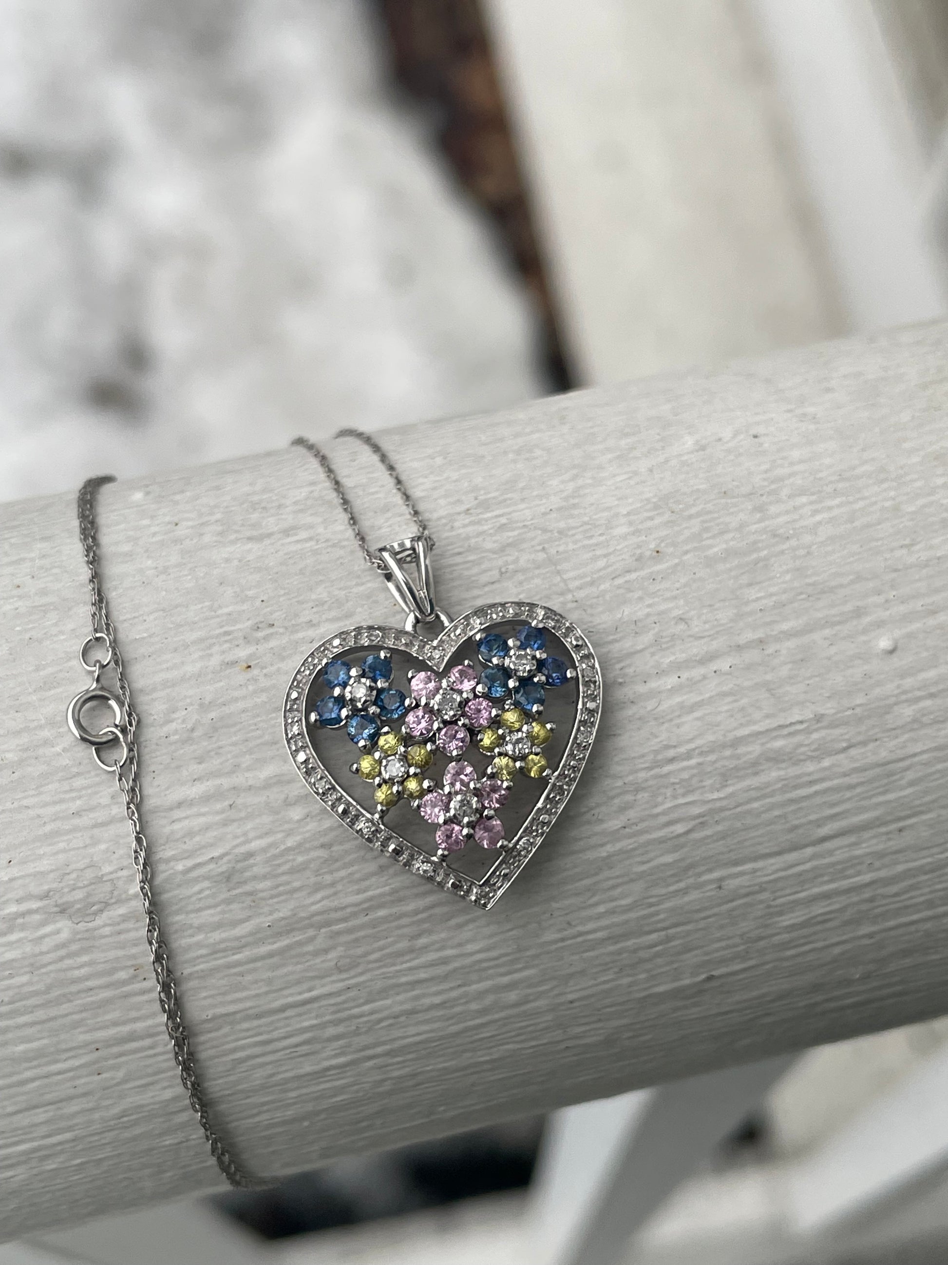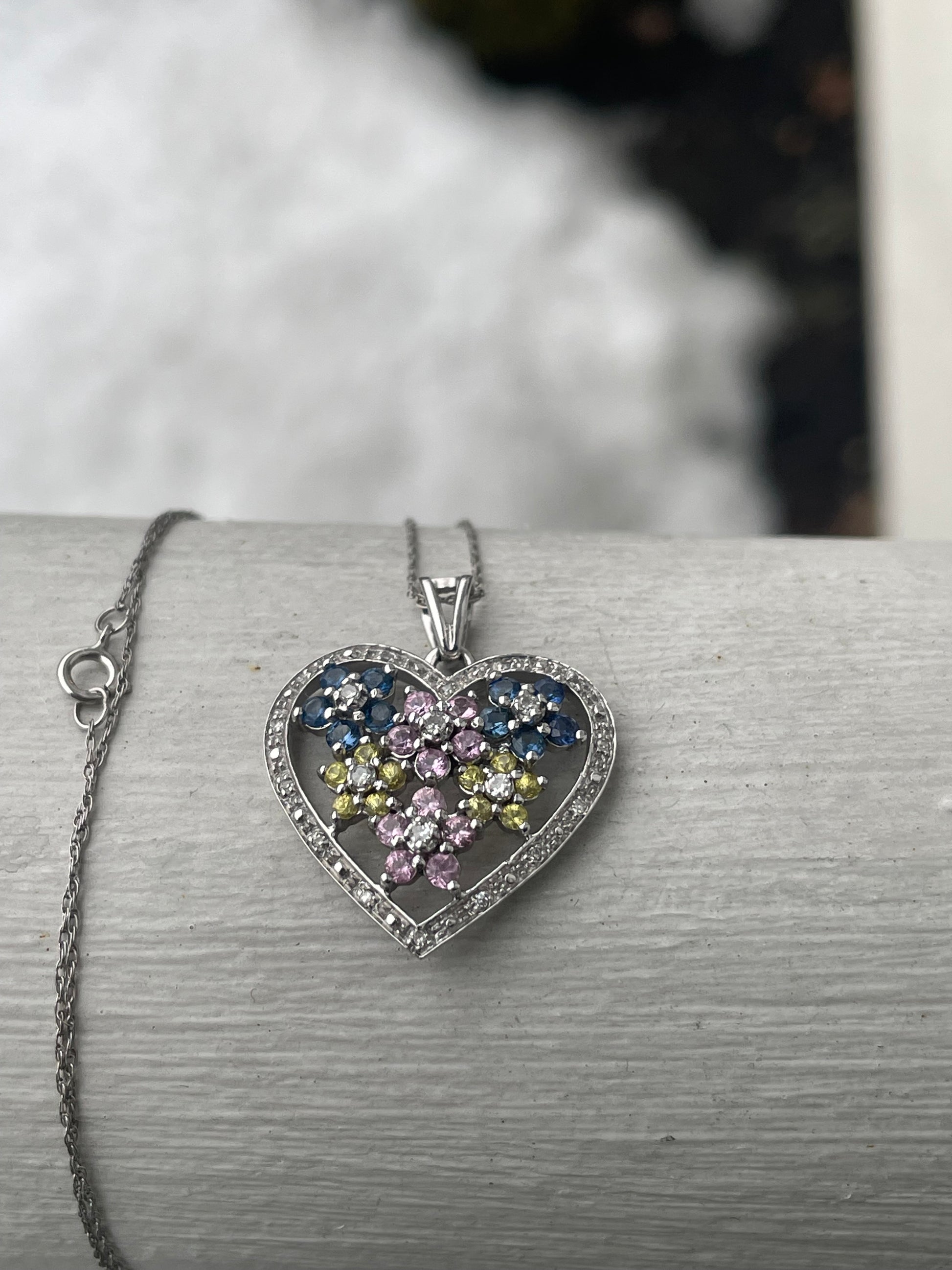 10k Gold Field Of Flowers Diamond Heart Necklace with Multi-Colored Stone Flowers. Blue, pink and yellow zirconia stones with diamonds in the heart halo. Paired with an 18” thin twist chain.