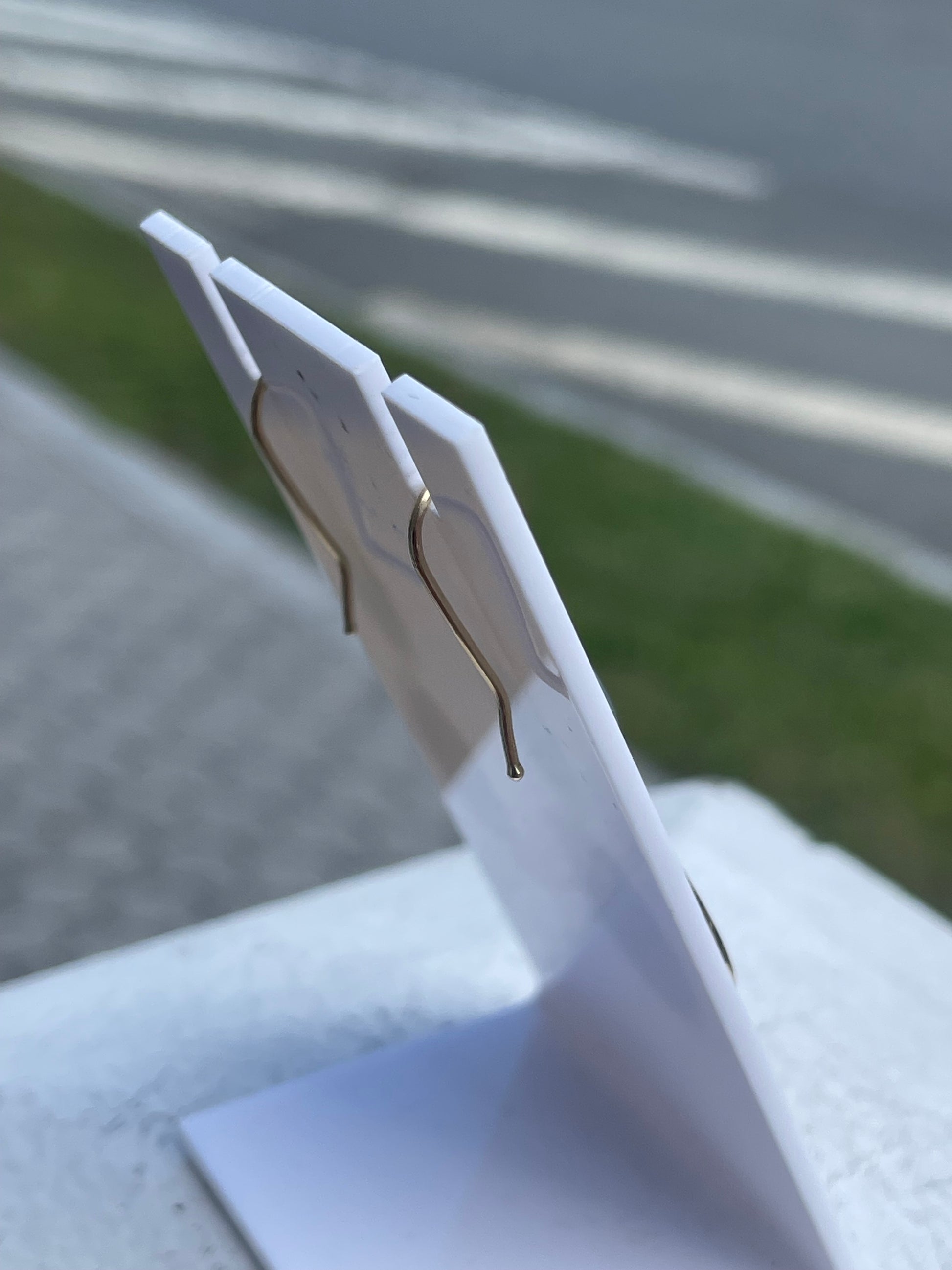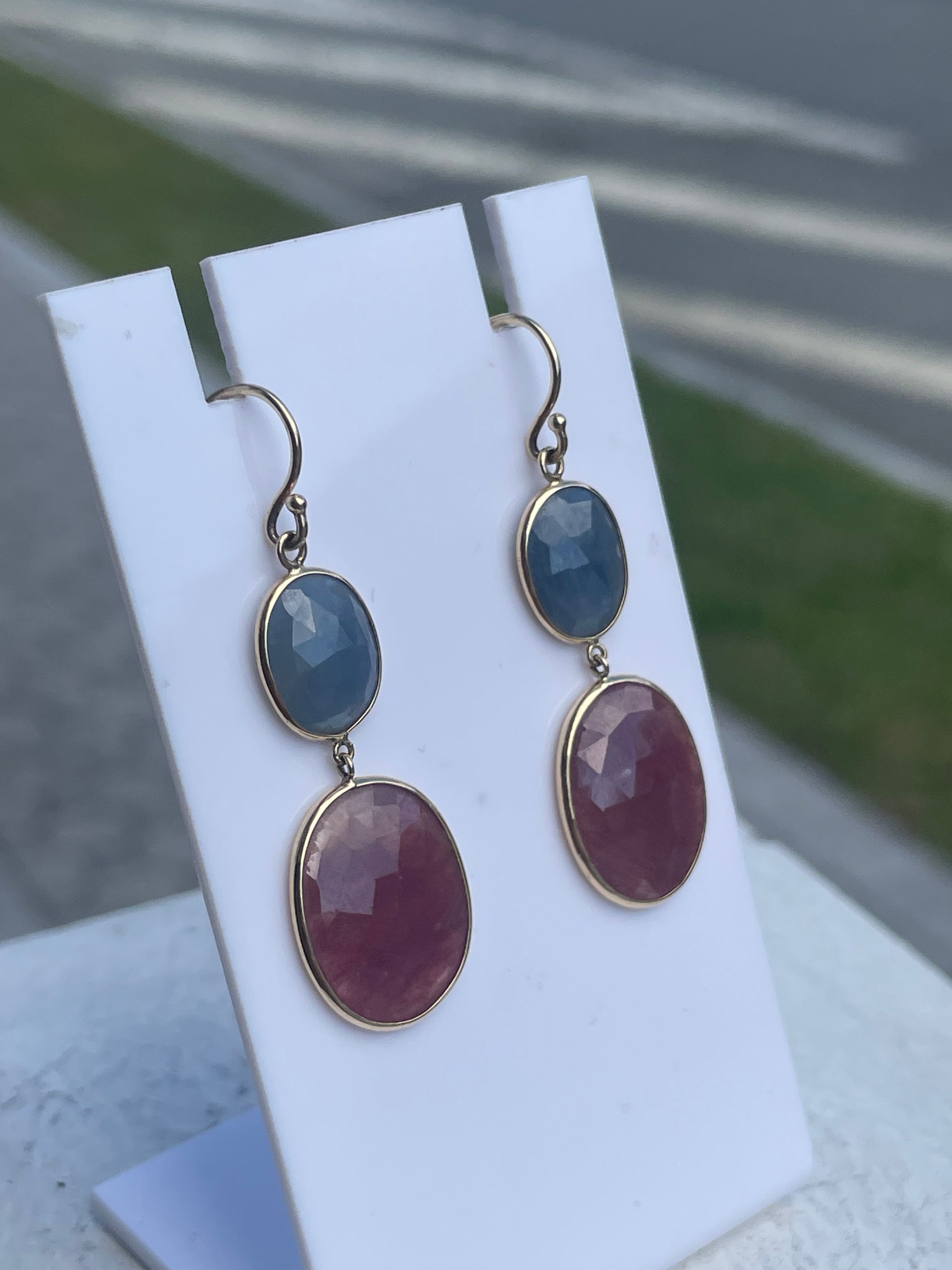 14k Gold Peach & Periwinkle Blue Agate Dangle Earrings. 1.75” drop. French ear wire hooks.