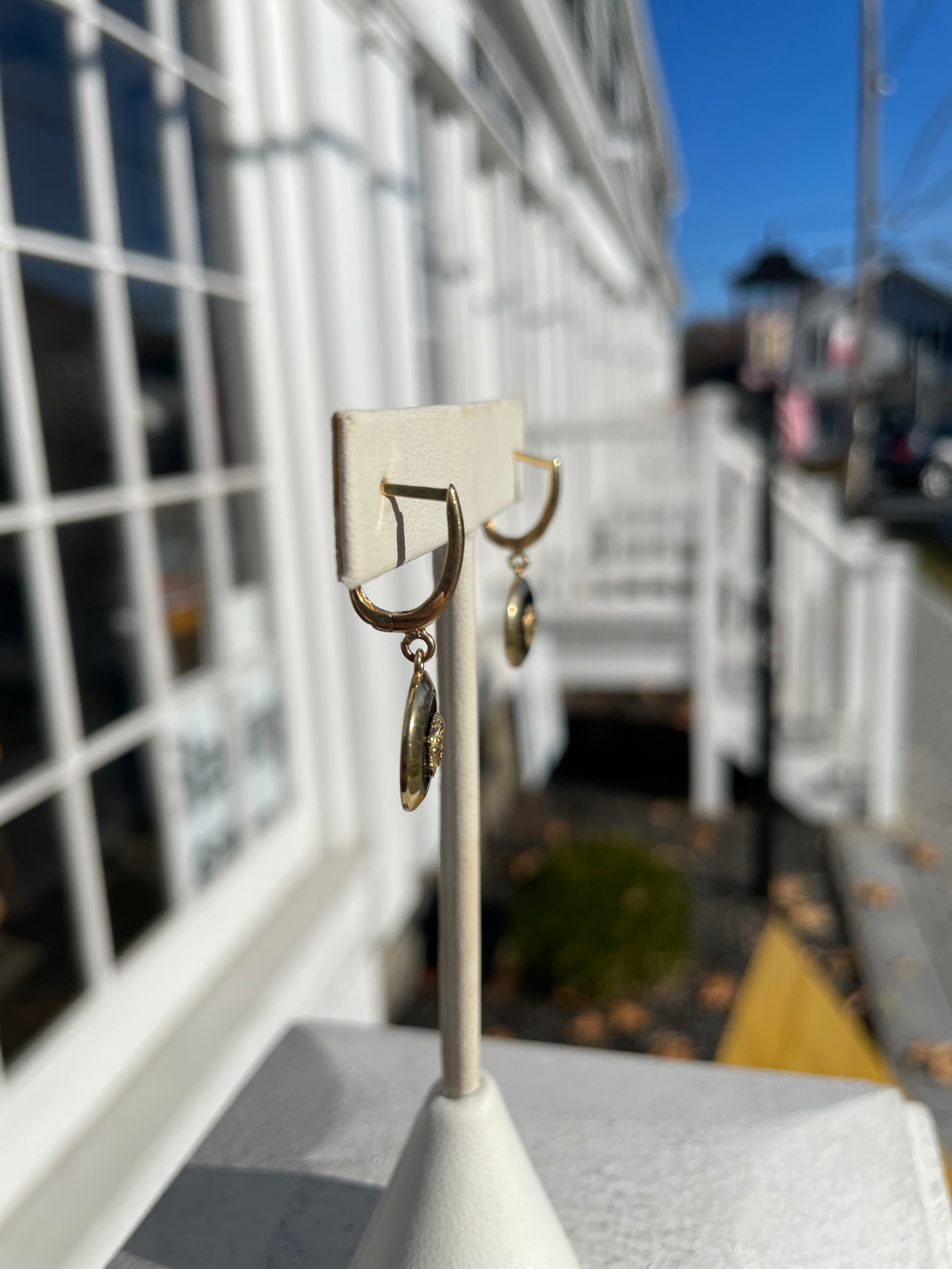 14k Gold Versace Style Logo Black Onyx Dangle Earrings. 1.25” drop. Leverback closures.
