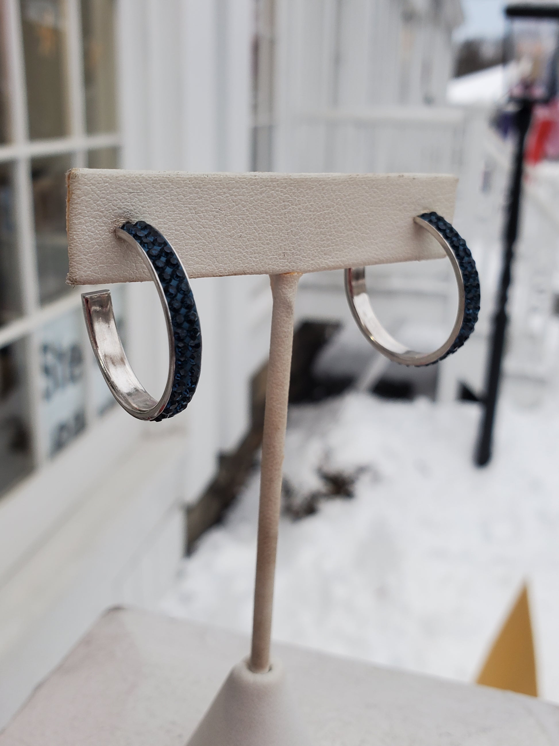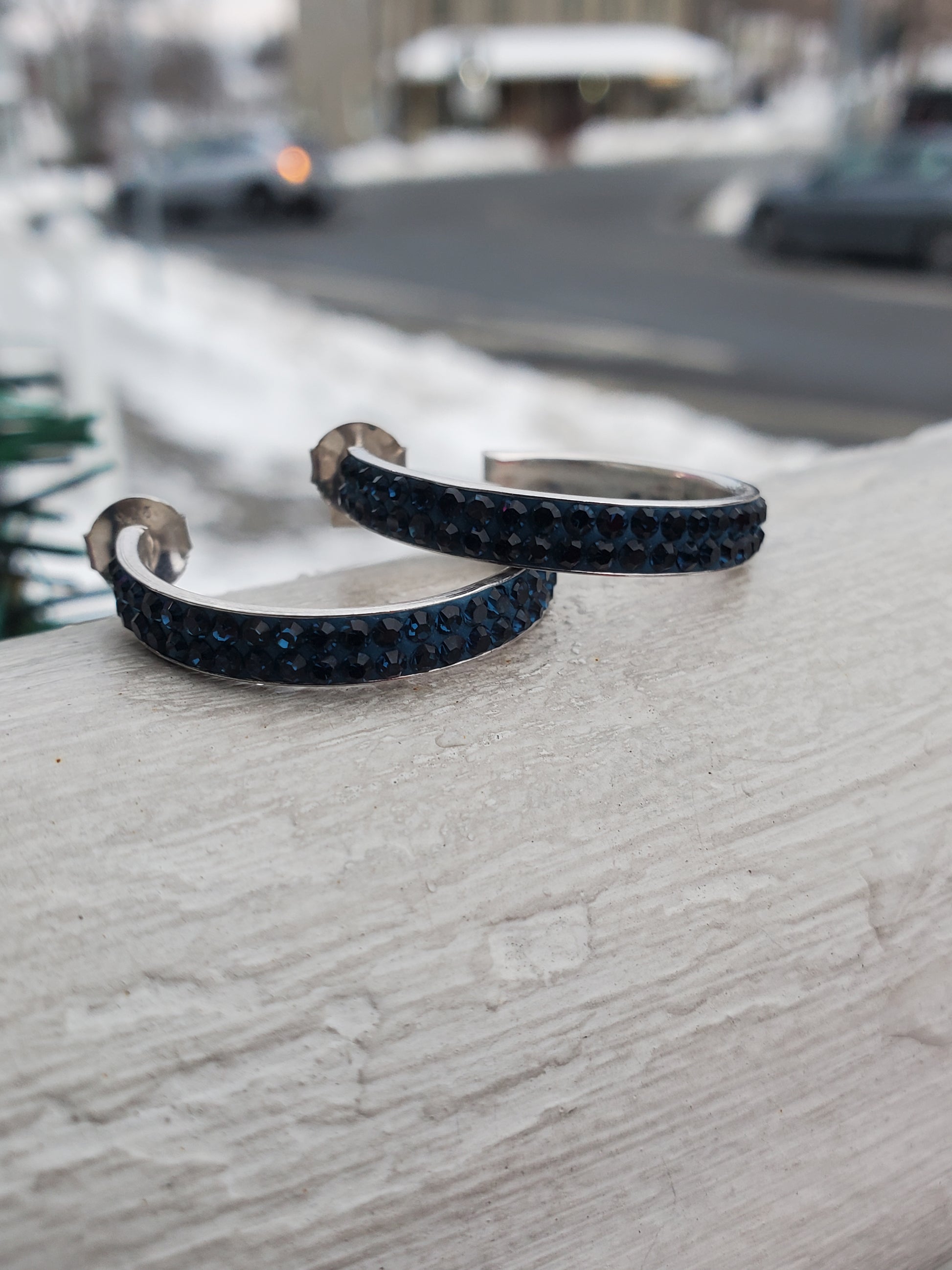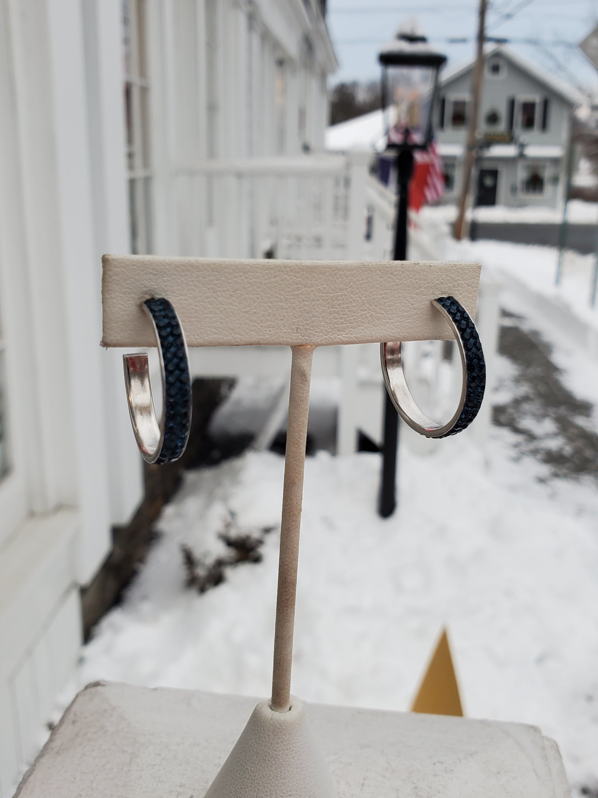 Expertly crafted with 925 sterling silver and a beautiful 3/4 round blue crystal, these hoop earrings are a stunning addition to any outfit. Measuring at 1" in diameter and with butterfly pushbacks, they are both stylish and secure. Weighing only 3.4 grams, they are lightweight and comfortable to wear all day. Elevate your look with these elegant earrings.