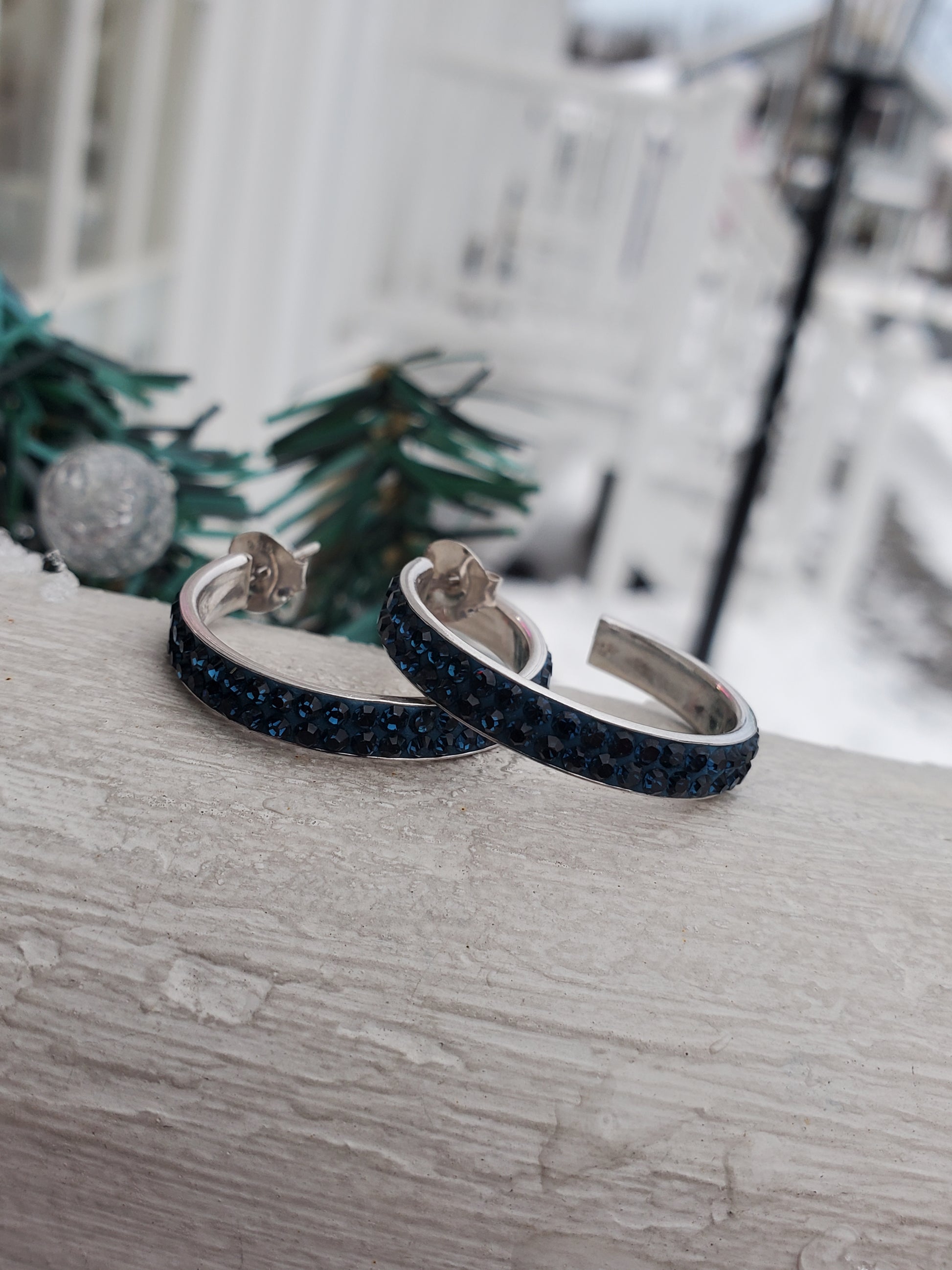925 Sterling Silver 3/4 Round Blue Crystal Hoop Earrings