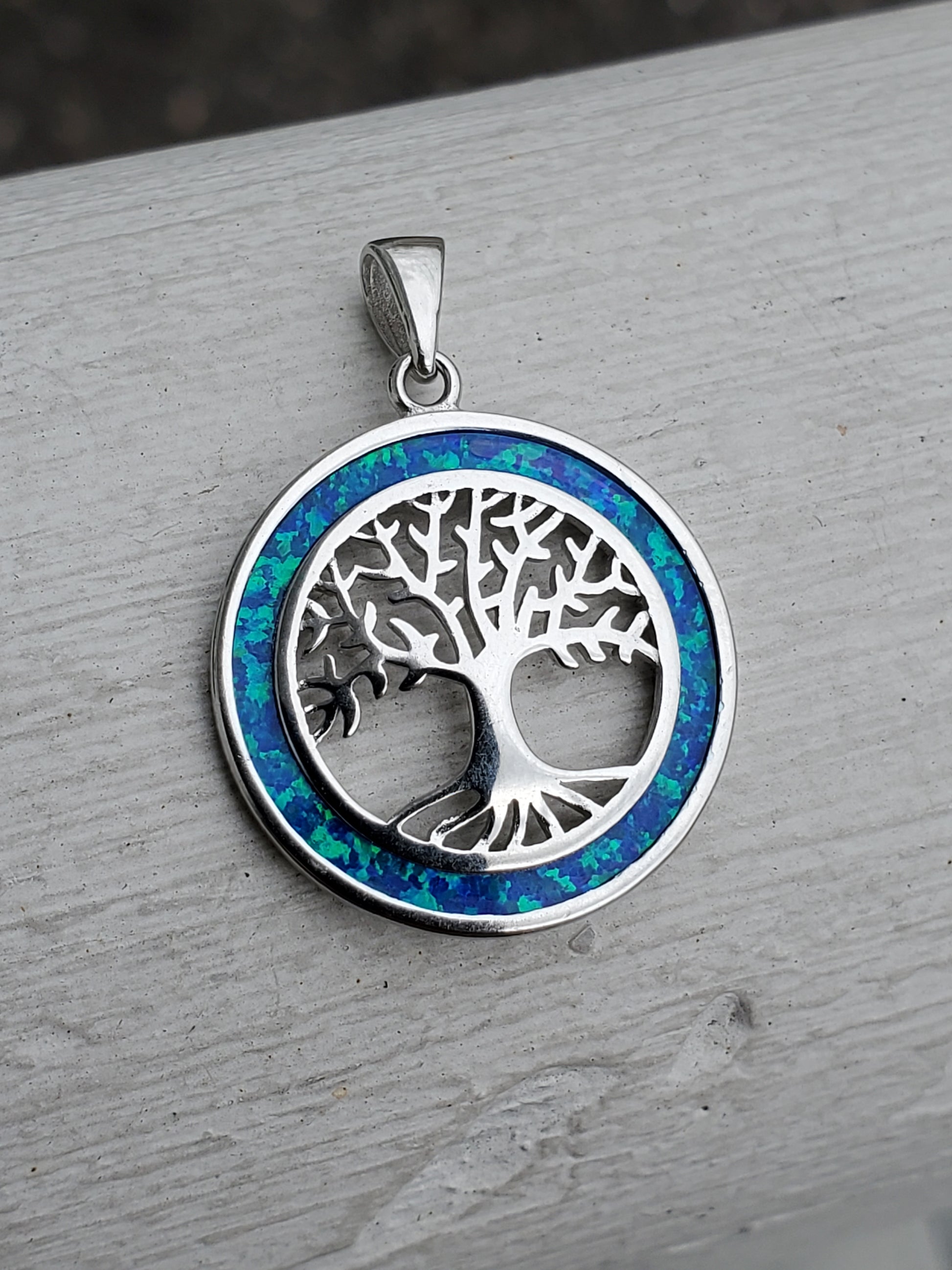 925 Sterling Silver Blue Fire Opal Family Tree Pendant