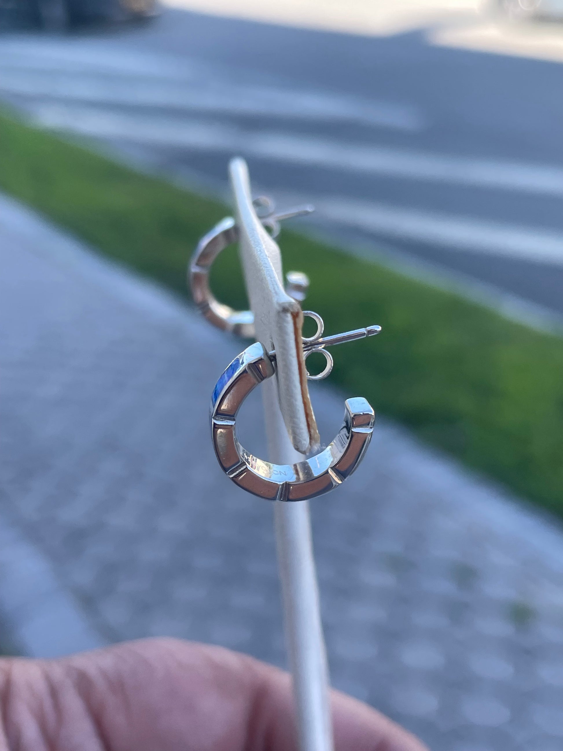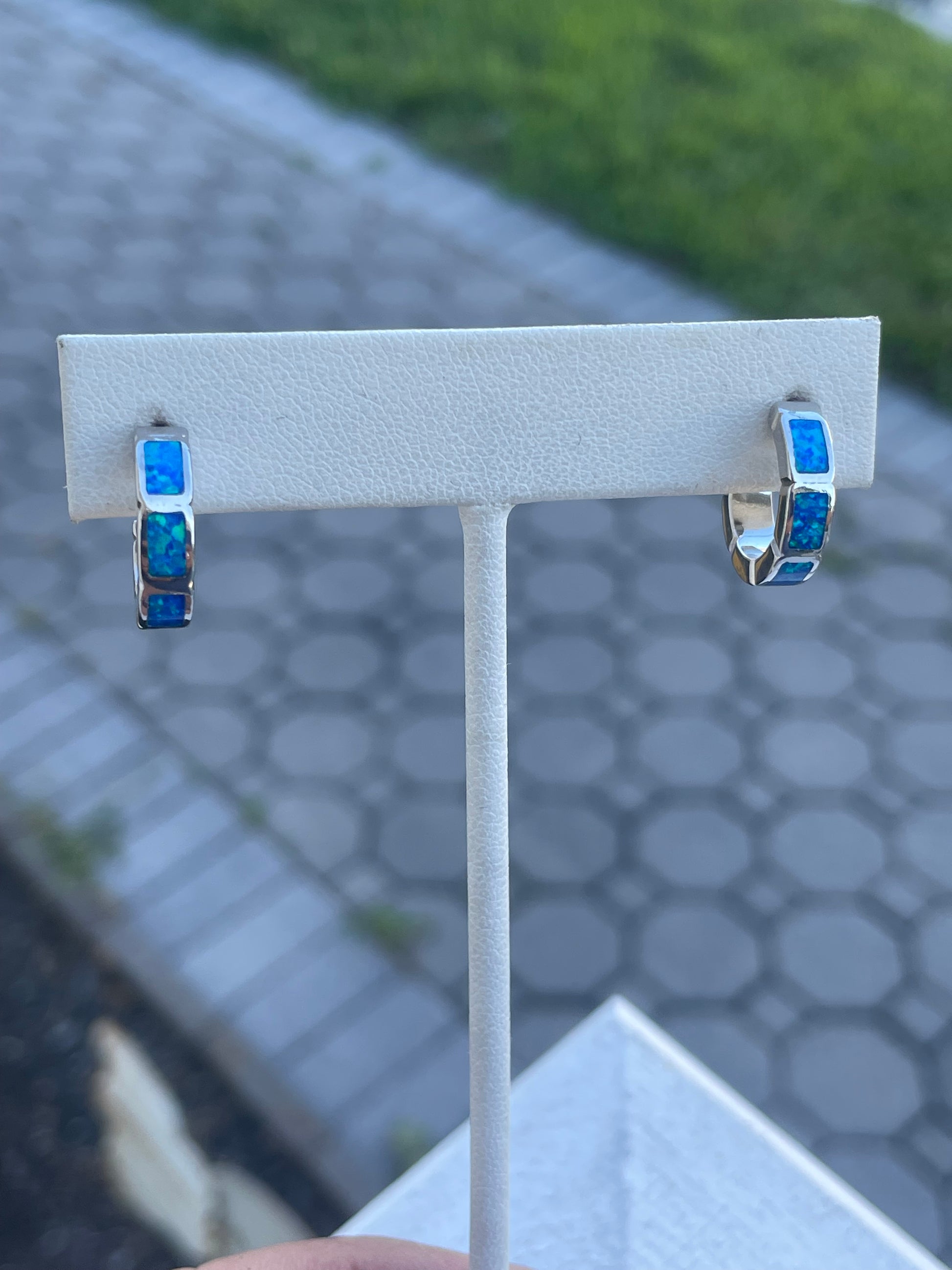 925 Sterling Silver Blue Opal Hoop Earrings. 3/4 hoop earrings, tile style blue Opal inlay stones. Size 15mm