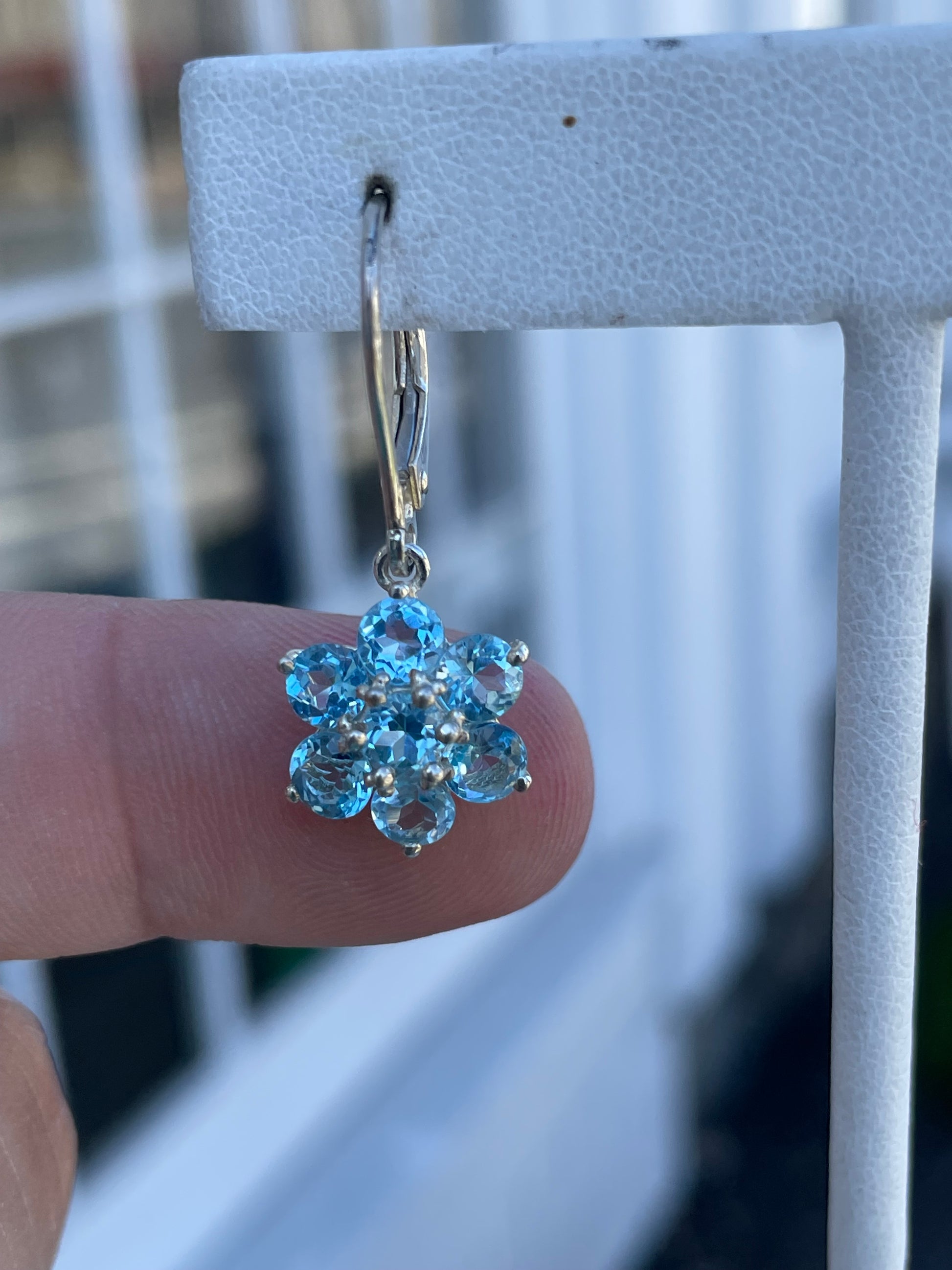 925 Sterling Silver Blue Topaz Dangle Flower Earrings. 1” drop length.