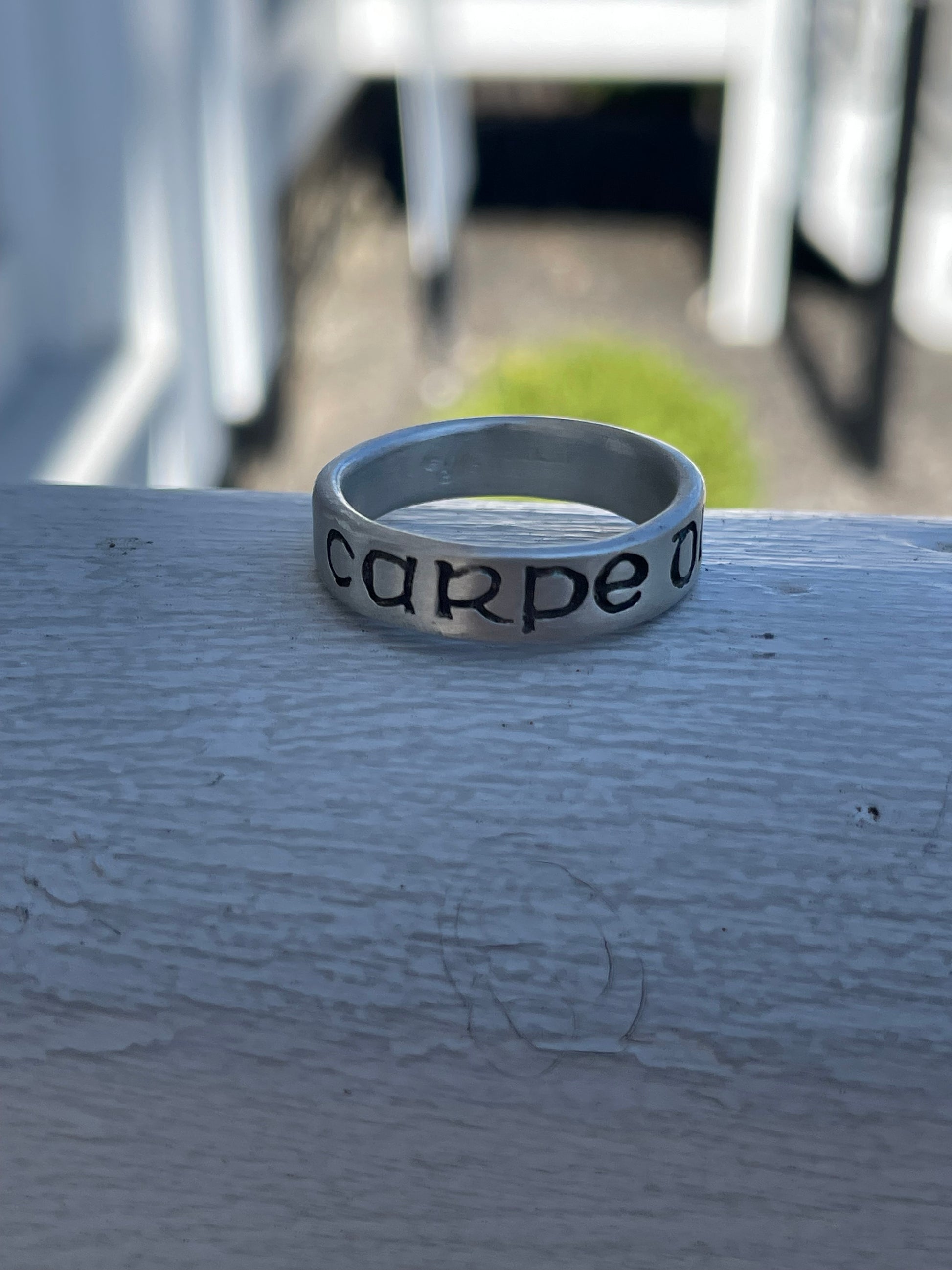 925 Sterling Silver Carpe Diem (Seize the Day) solid band ring size 8. 6.5 grams (there is a designer stamp on the inside but research didn’t show any results) 5mm thick