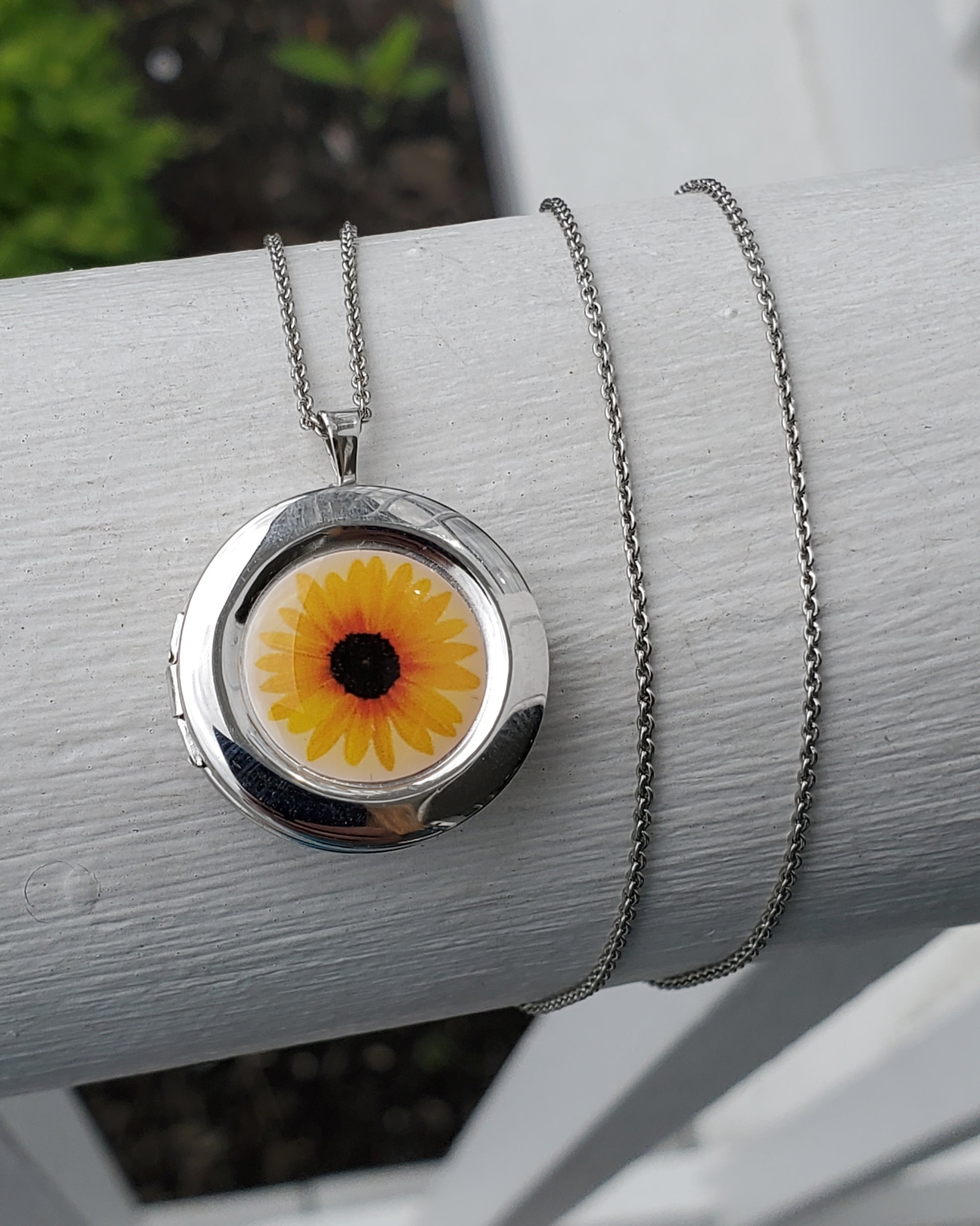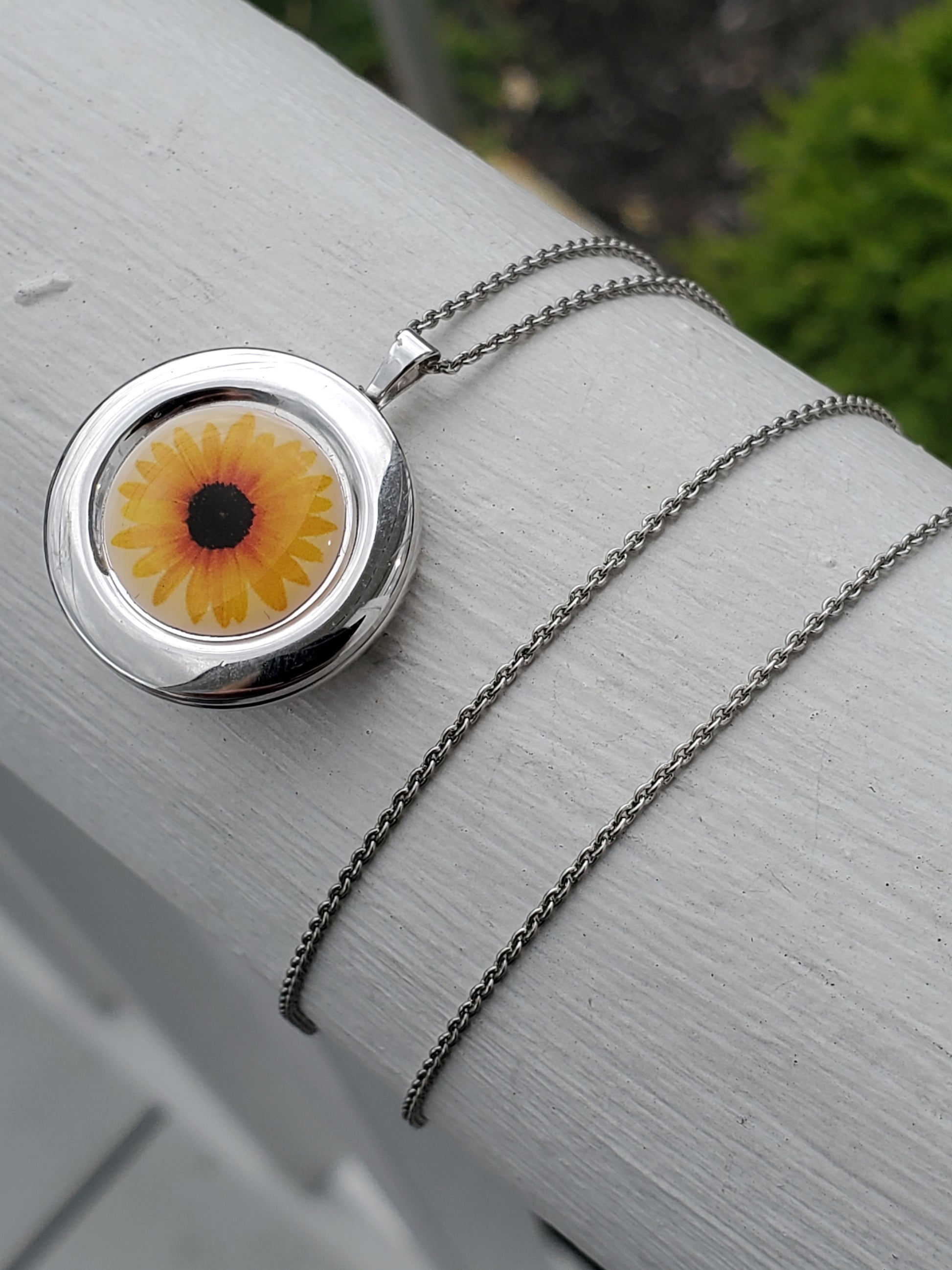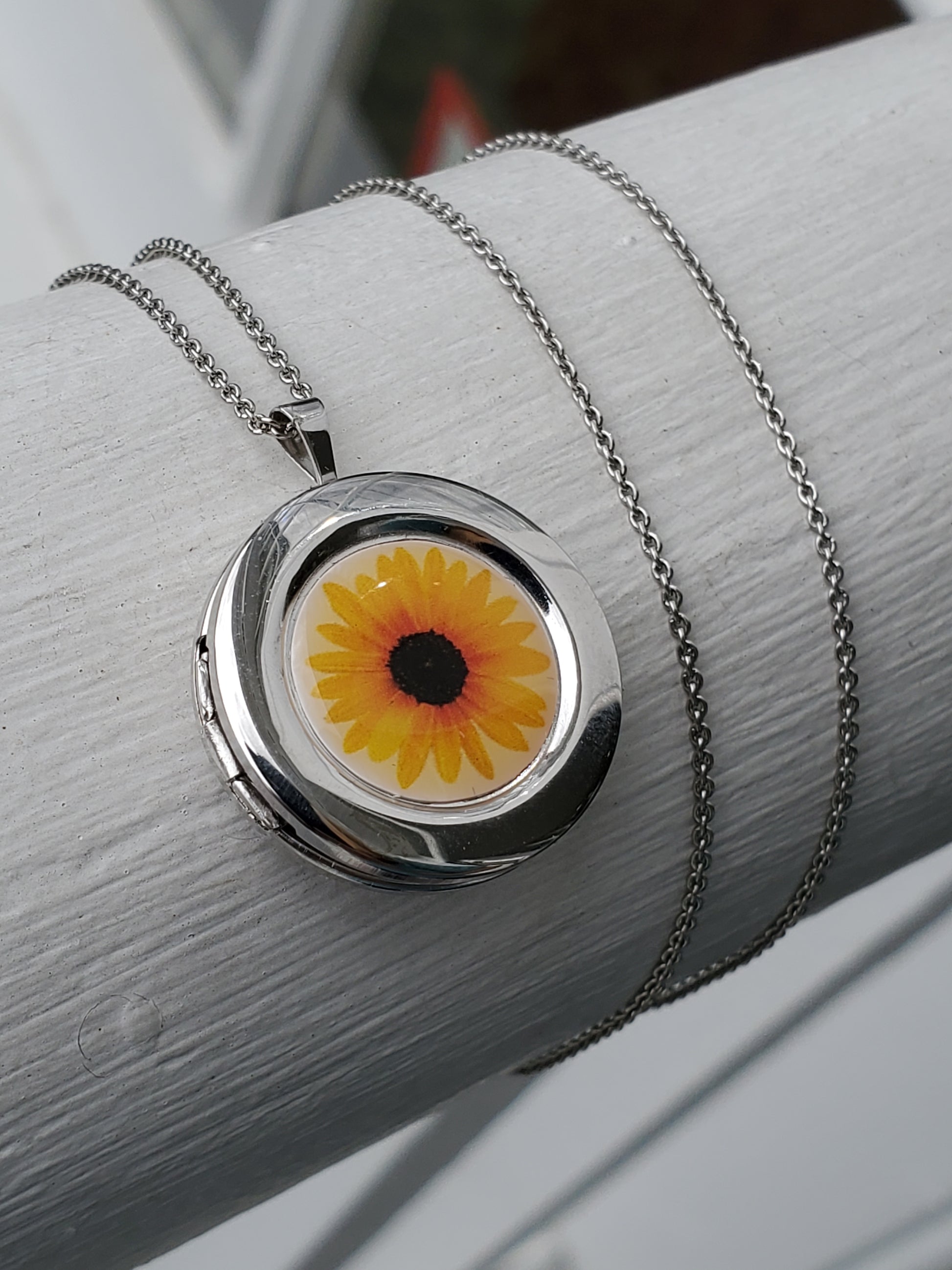 925 Sterling Silver Daisy / Sunflower Locket Necklace. Sterling silver 18" rolo link chain included.