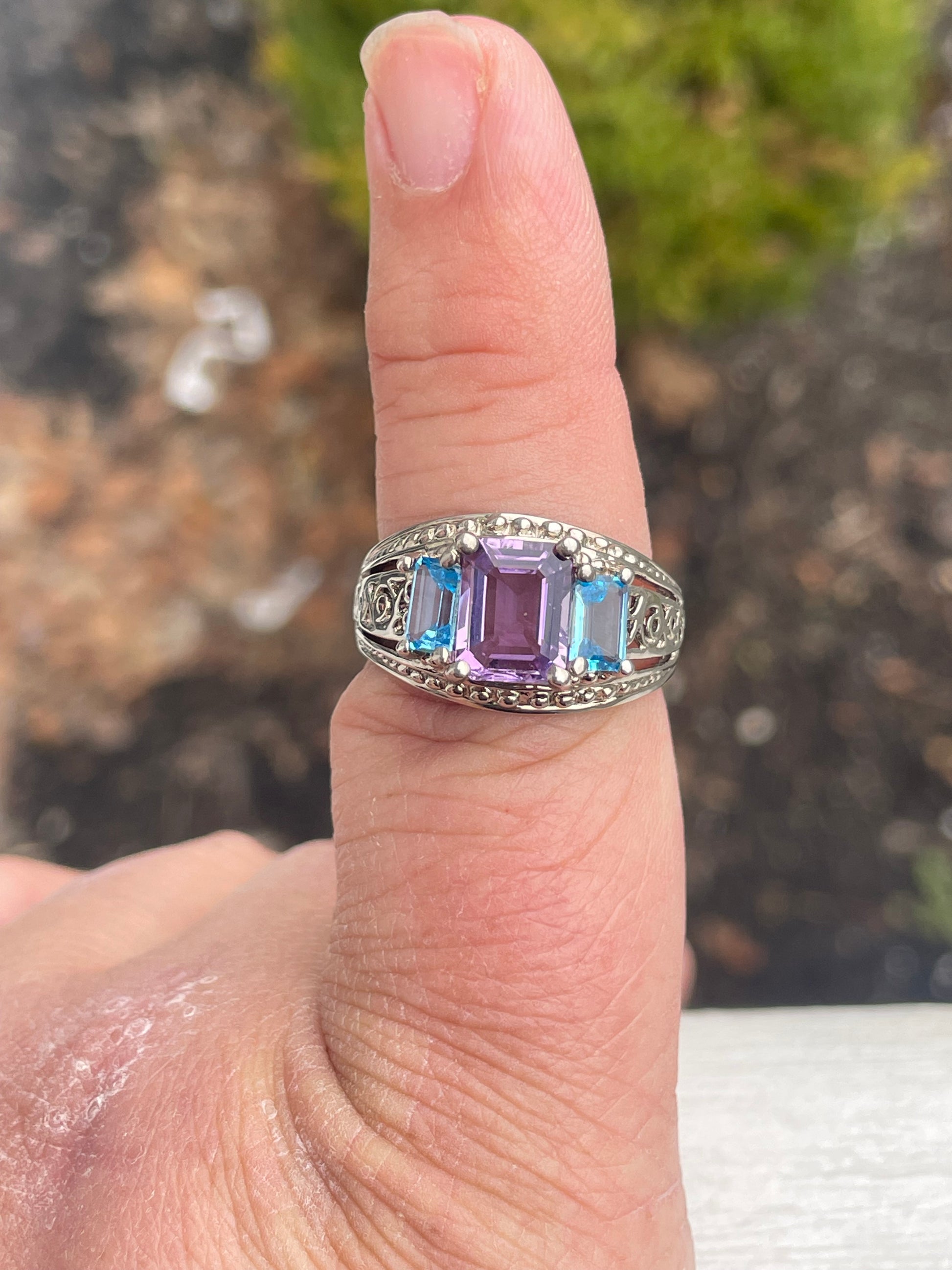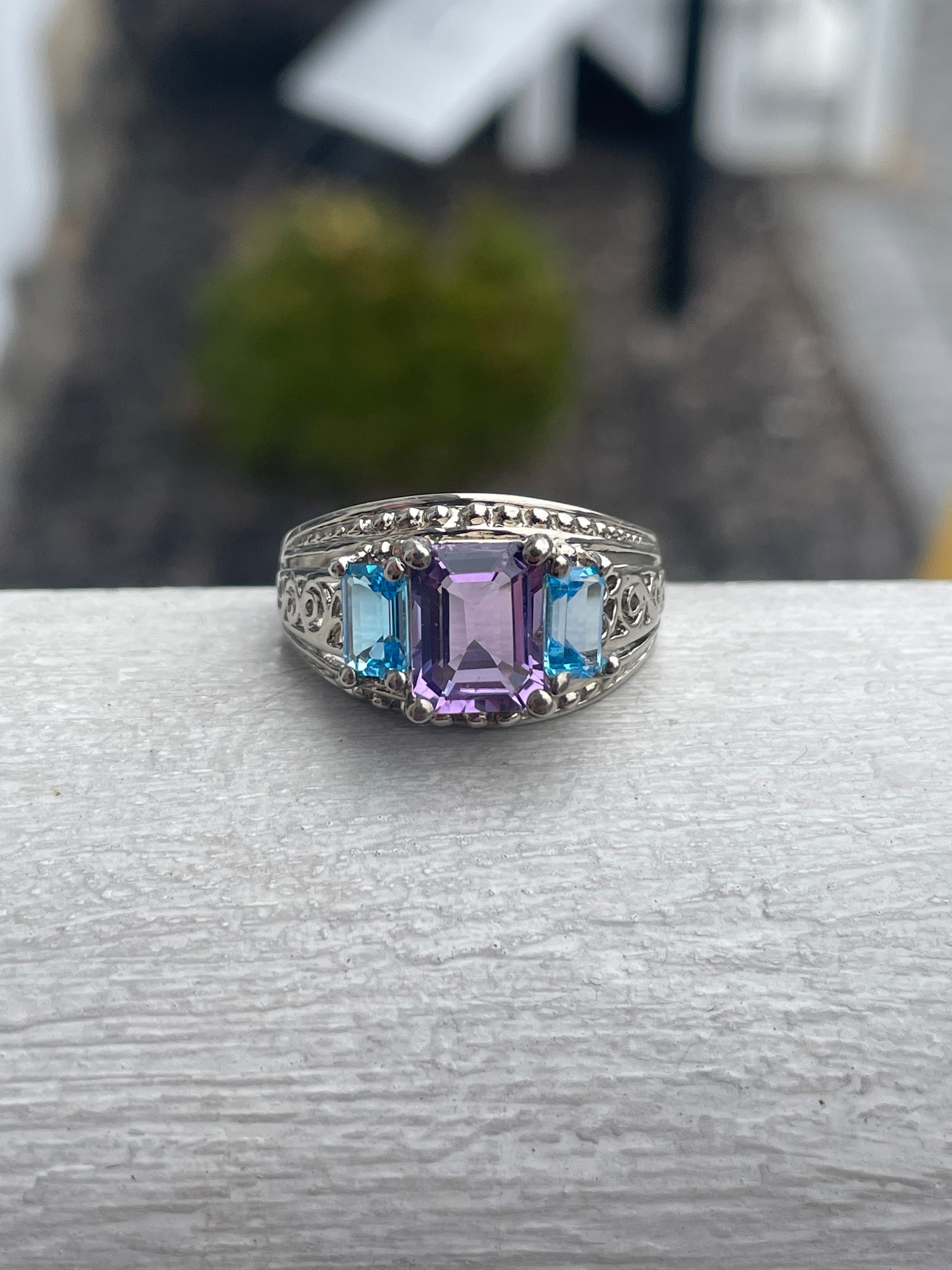 925 Sterling Silver Designer CJC past present future Blue topaz and amethyst ring size 10. Emerald cut stones across the top.