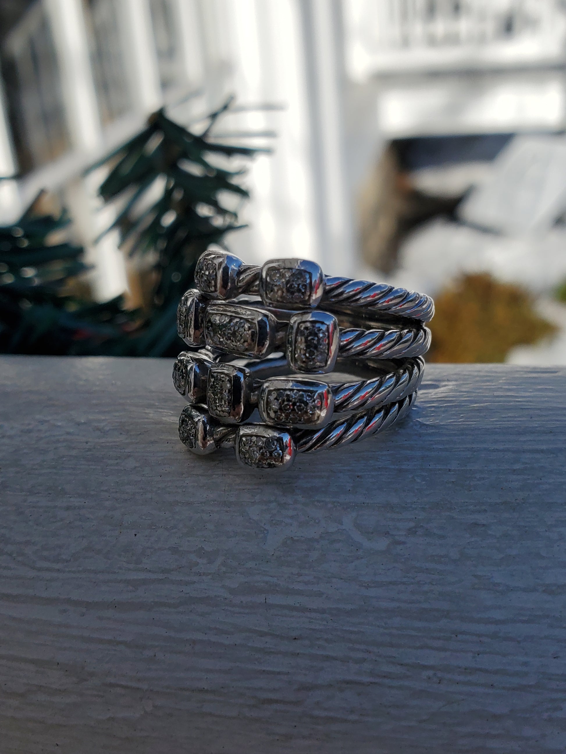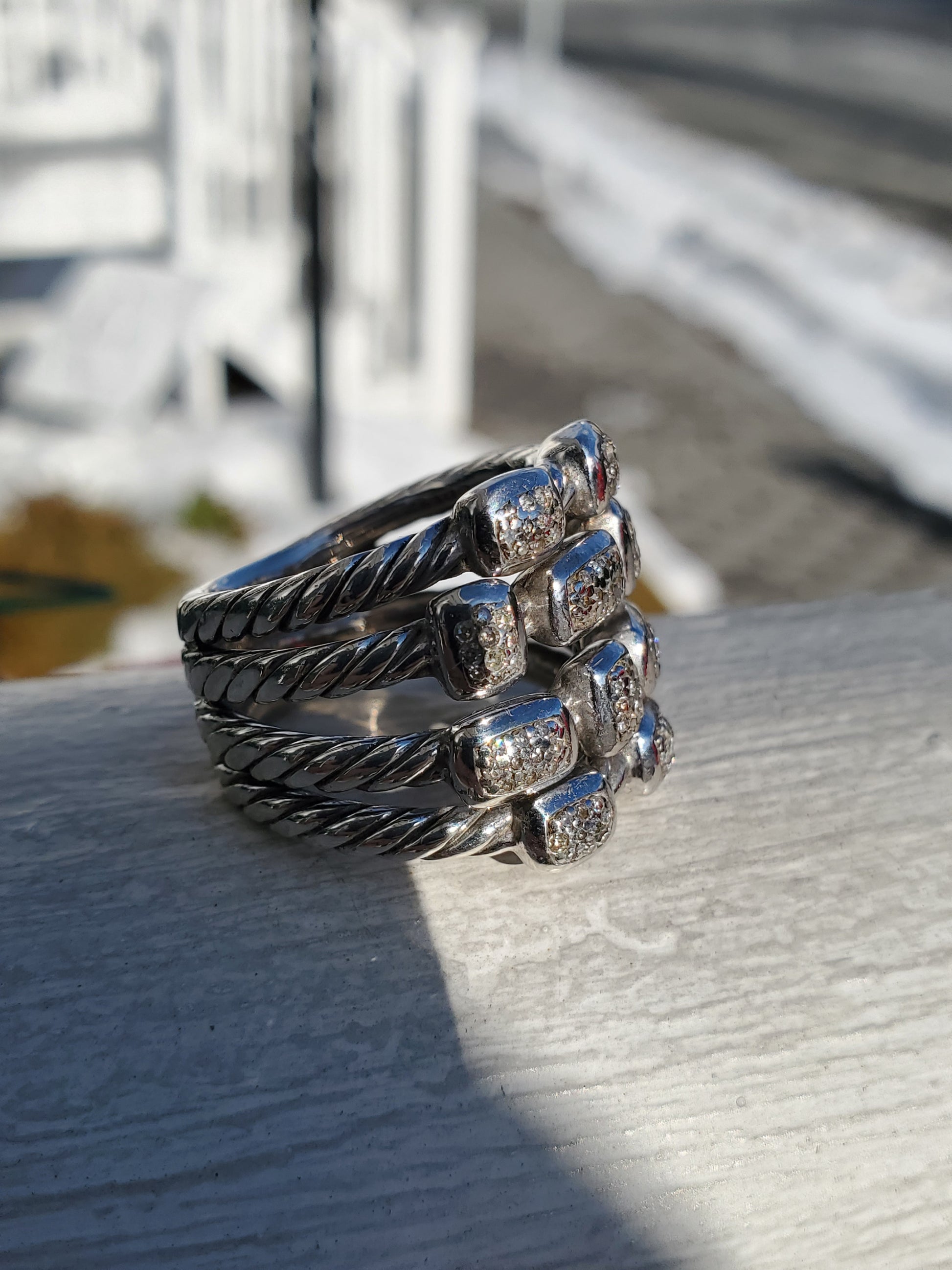 925 Sterling Silver Designer David Yurman 4-Row Confetti Twisted Cable Diamond Ring