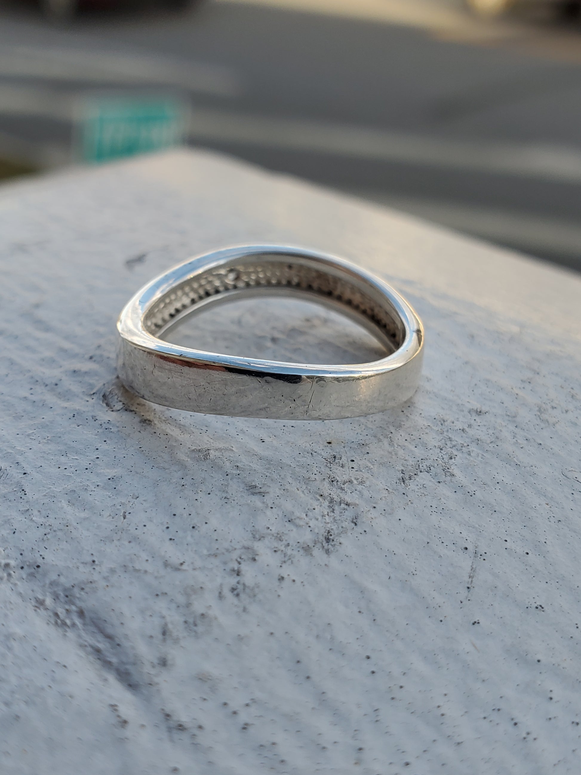 Crafted with 925 sterling silver, this designer DQ Forever wavy band ring showcases a total weight of 3.4 grams and a finger size of 7. Experience a timeless and elegant style with this beautifully designed ring.