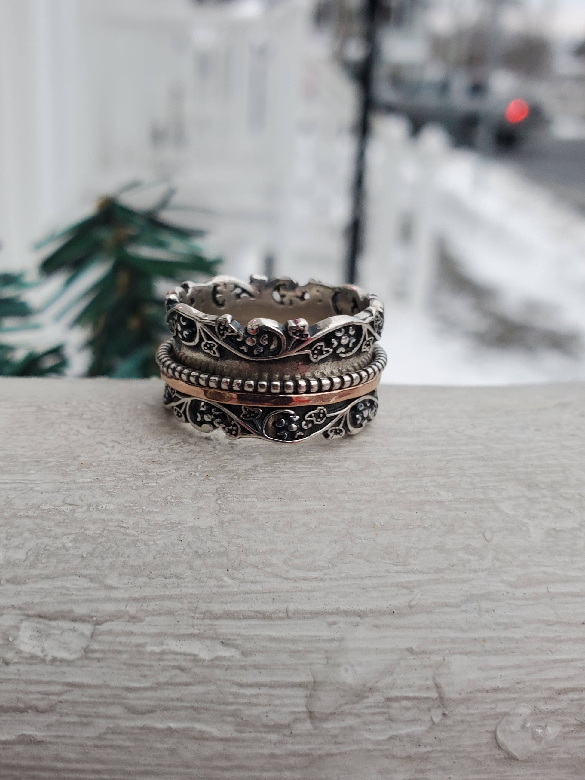 Discover the stunning beauty and intricate design of our 925 Sterling Silver Designer PAZ Israel Thick Oxydized Spinner Band Ring. Handcrafted by skilled artisans, this ring features a unique spinning design and is made of high-quality sterling silver for a total weight of 7.9 grams. Add a touch of elegance and style to any outfit with this gorgeous ring. Finger size 6.