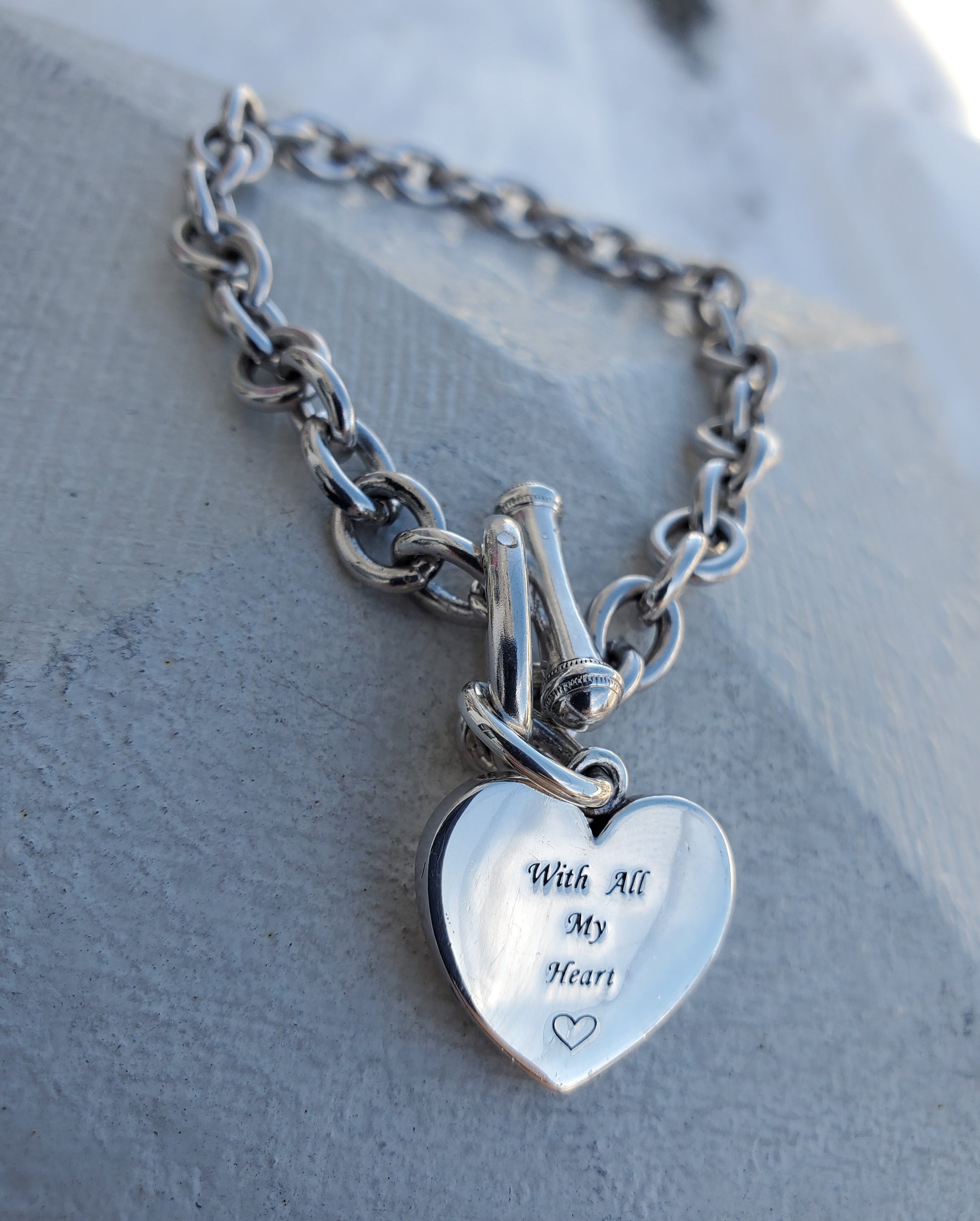 Embrace a statement of sentiment with the exquisite 925 Sterling Silver Designer Vera Wang "With All My Heart" Blue Sapphire Heart Toggle Lock Bracelet. This elegant piece, designed to grace the wrist with its 7.5-inch fit, embodies both sophistication and emotional resonance, harmoniously combining the lustrous allure of sterling silver with the captivating depth of blue sapphires, allowing the wearer to express profound affection in an artful manner. Weighing 27.4 grams, it is a luxurious tribute to love and elegance.