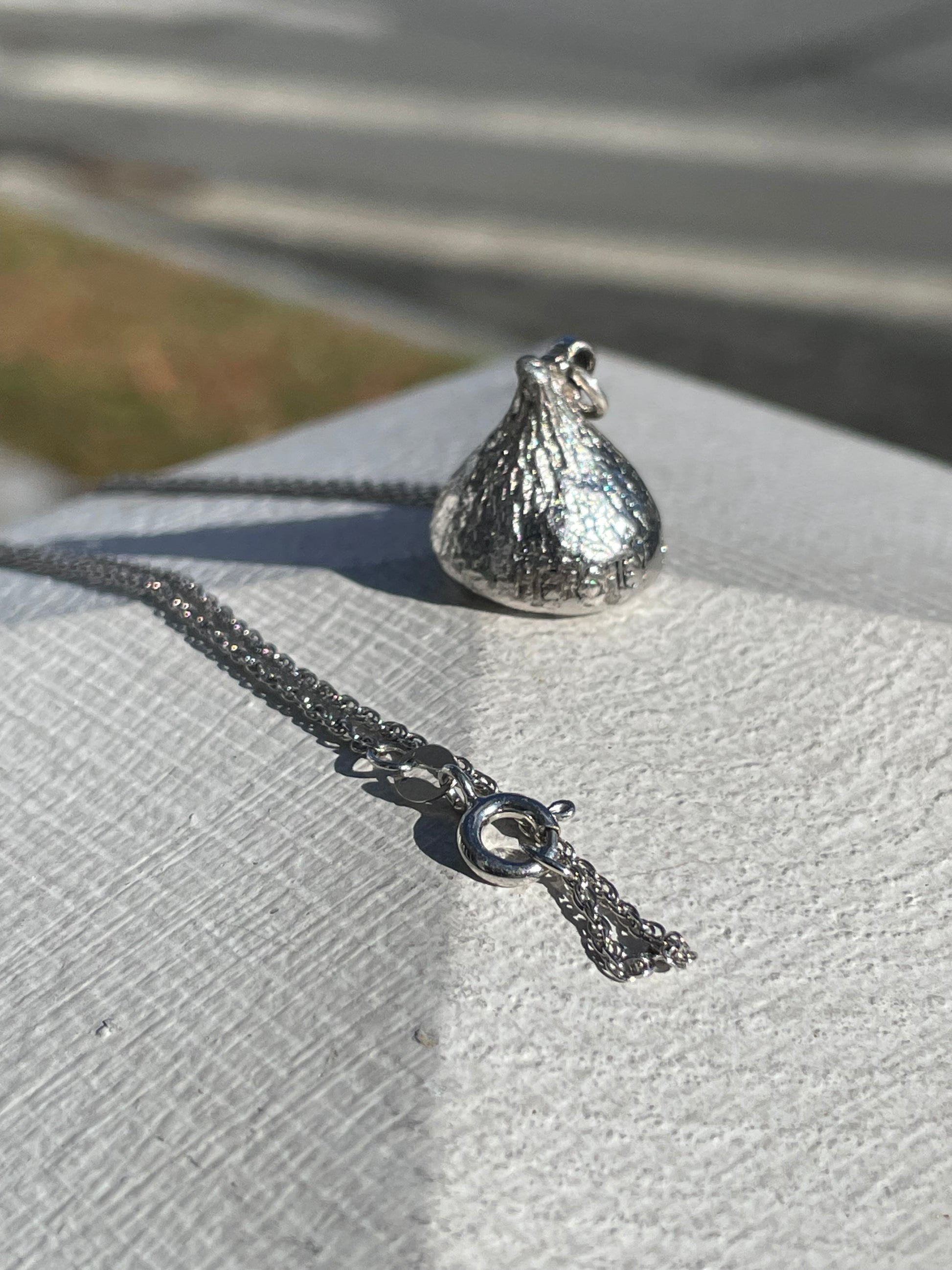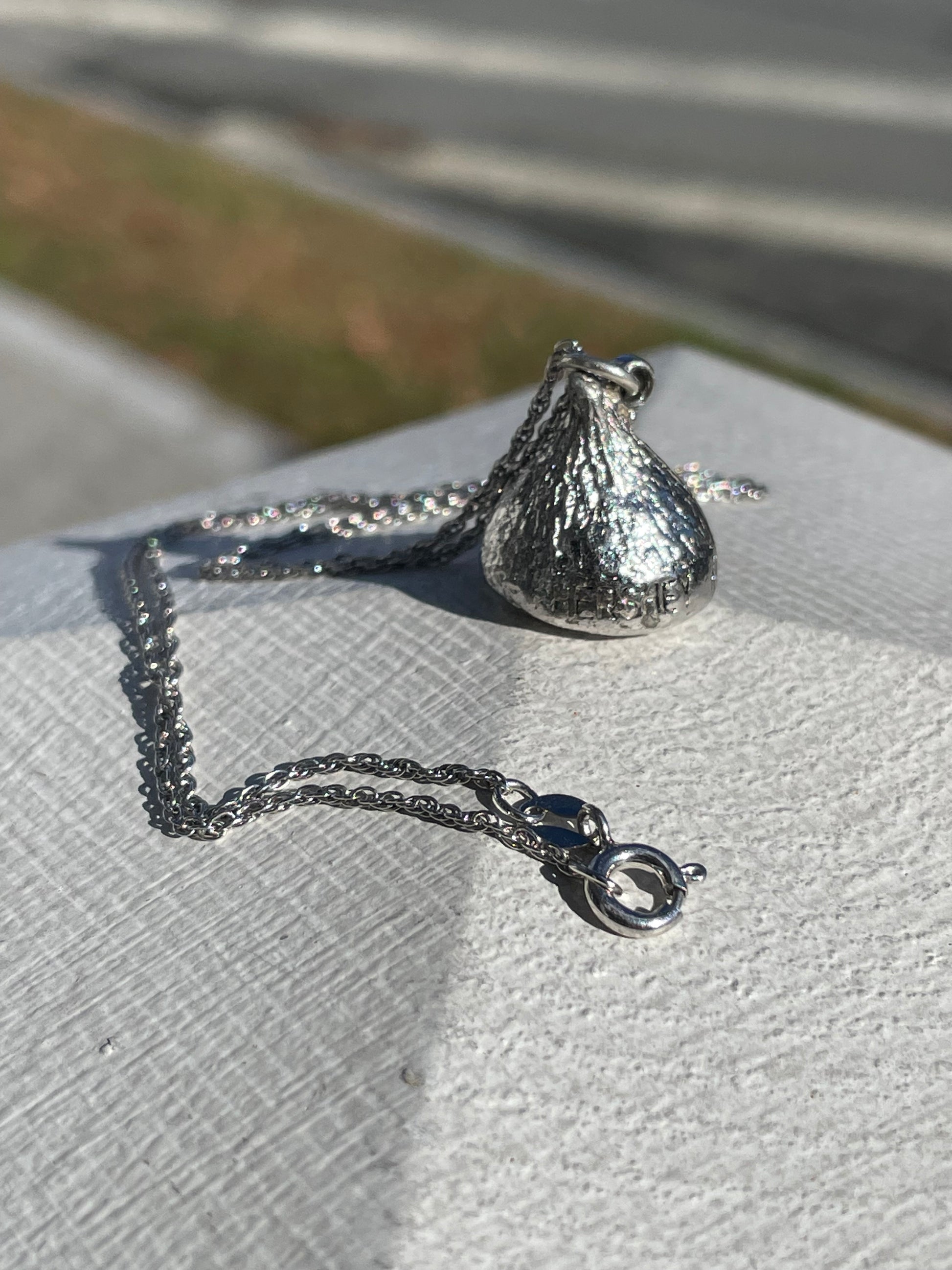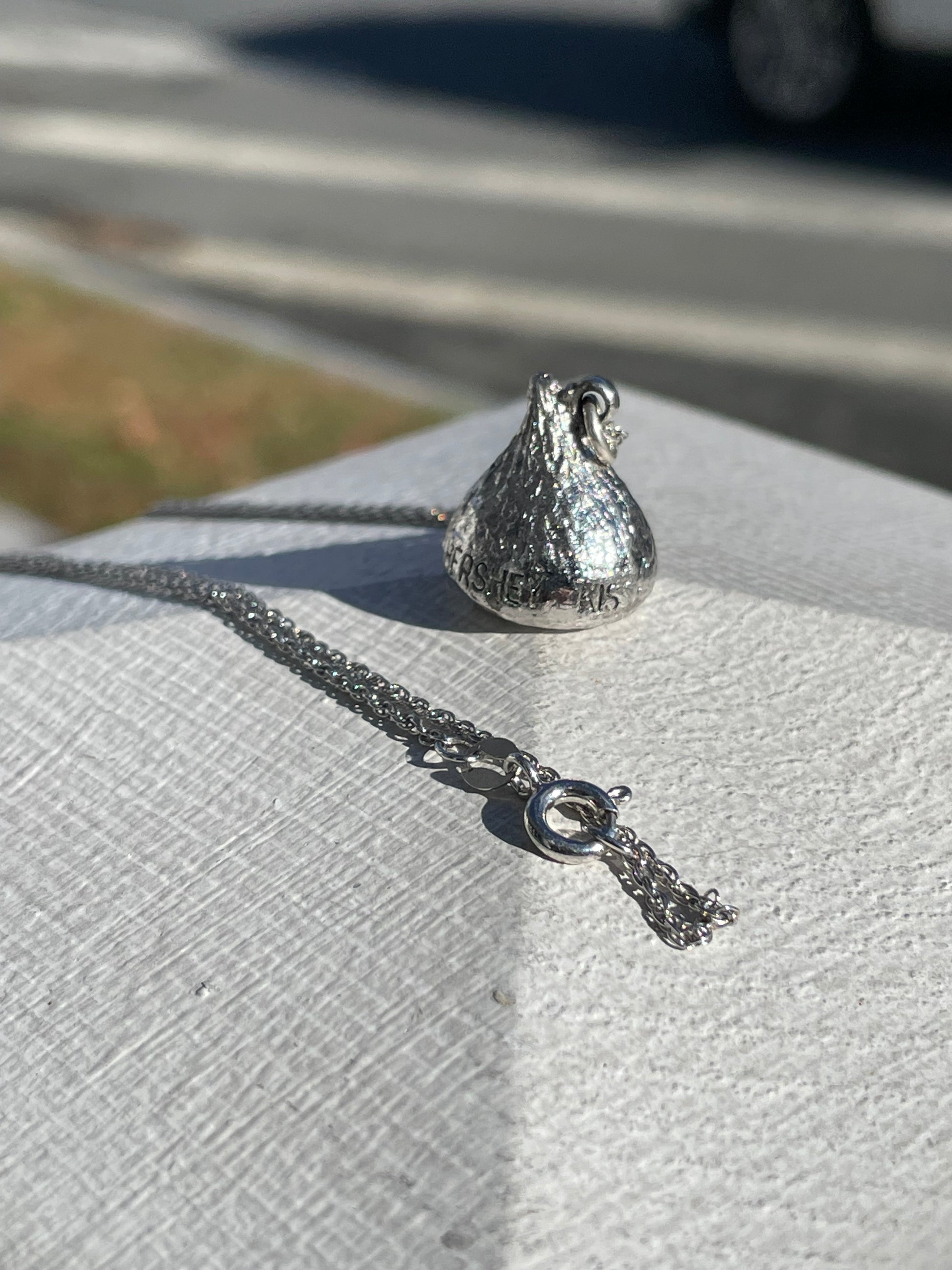 925 Sterling Silver Solid Hershey Kiss Necklace. 11.5g. 925 sterling silver 18” fine cable link chain is included.