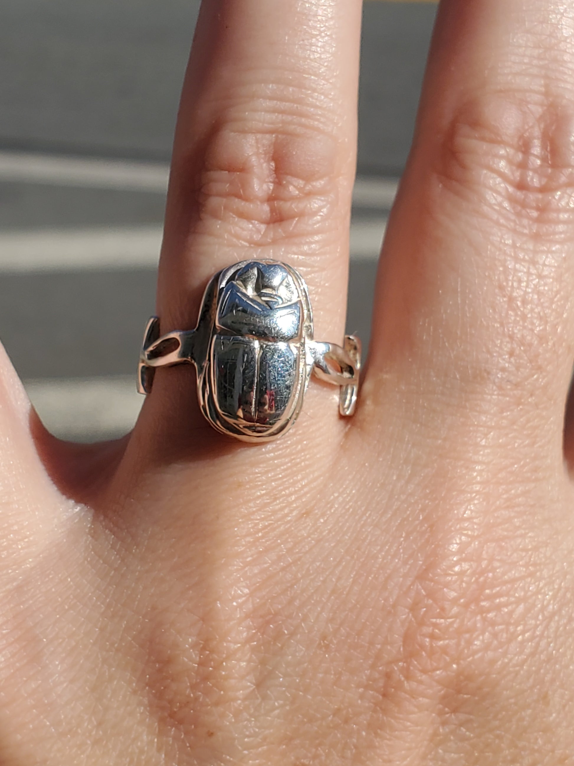This 925 Sterling Silver Egyptian Scarab Onk Ankh Hieroglyphics Ring is a symbol of protection and good luck. Made with high-quality sterling silver, this ring features intricate hieroglyphics and a detailed scarab beetle design. With a finger size of 7, this ring weighs 7.1 grams, making it comfortable to wear while making a bold statement. Trust in the craftsmanship and meaning behind this ring as a truly unique piece of jewelry.