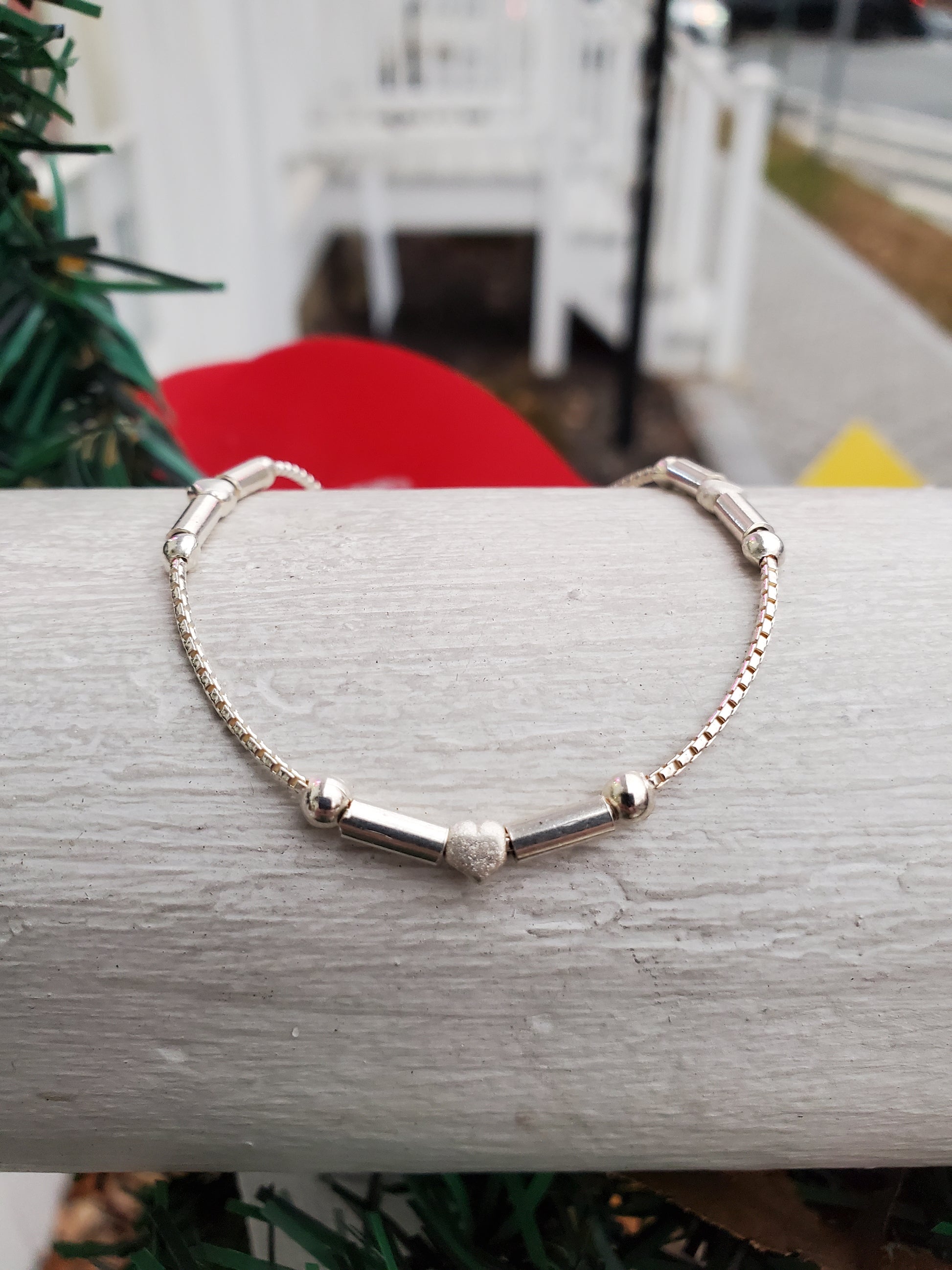"Add a touch of frosty elegance with our 925 Sterling Silver Frosty Heart Bracelet. Lightweight at only 3.9 grams, it is perfect for everyday wear and fits comfortably on a 7" wrist. Elevate your style with this beaded station bracelet!"