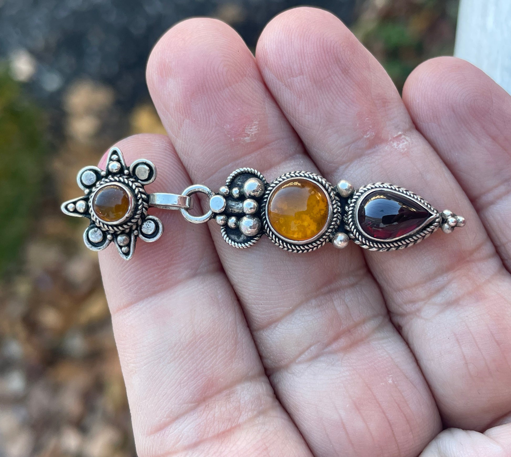 925 Sterling Silver Garnet & Amber Vertical Drop Pendant.  2.25” long. All stones are cabochon cut.
