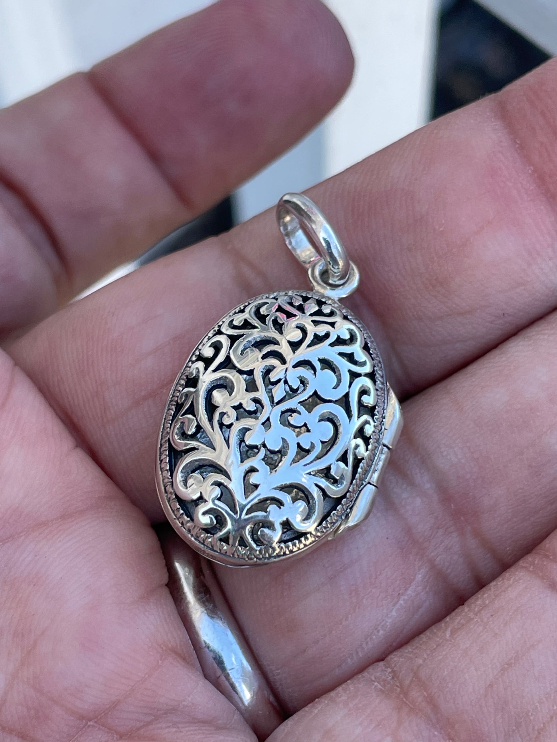 925 Sterling Silver Garnet Locket Pendant. 1.25”x.67” Filigree design on the back. 6.9 grams