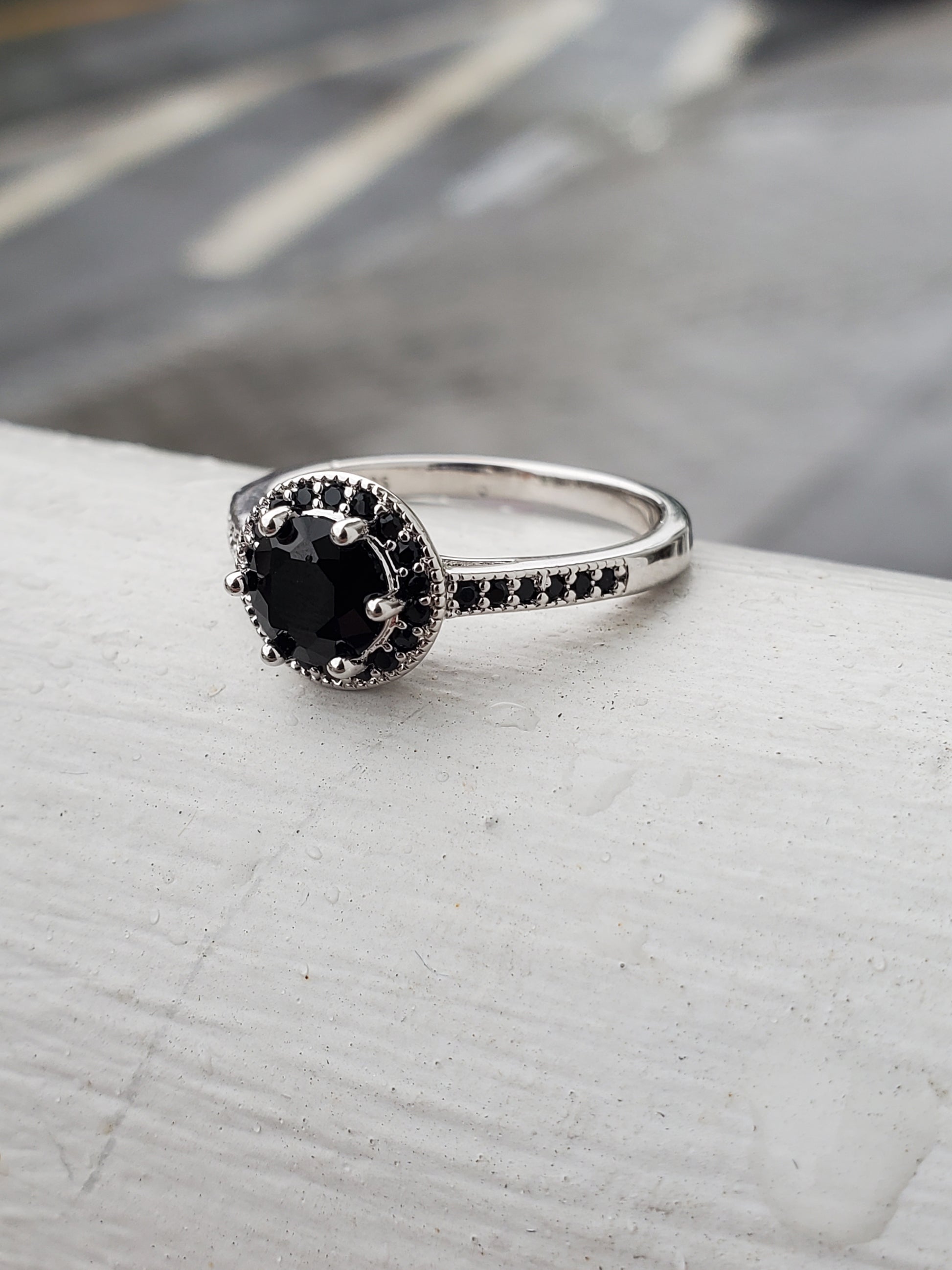 925 Sterling Silver Ladies Black Spinel Halo Solitare Ring. Finger size: 9