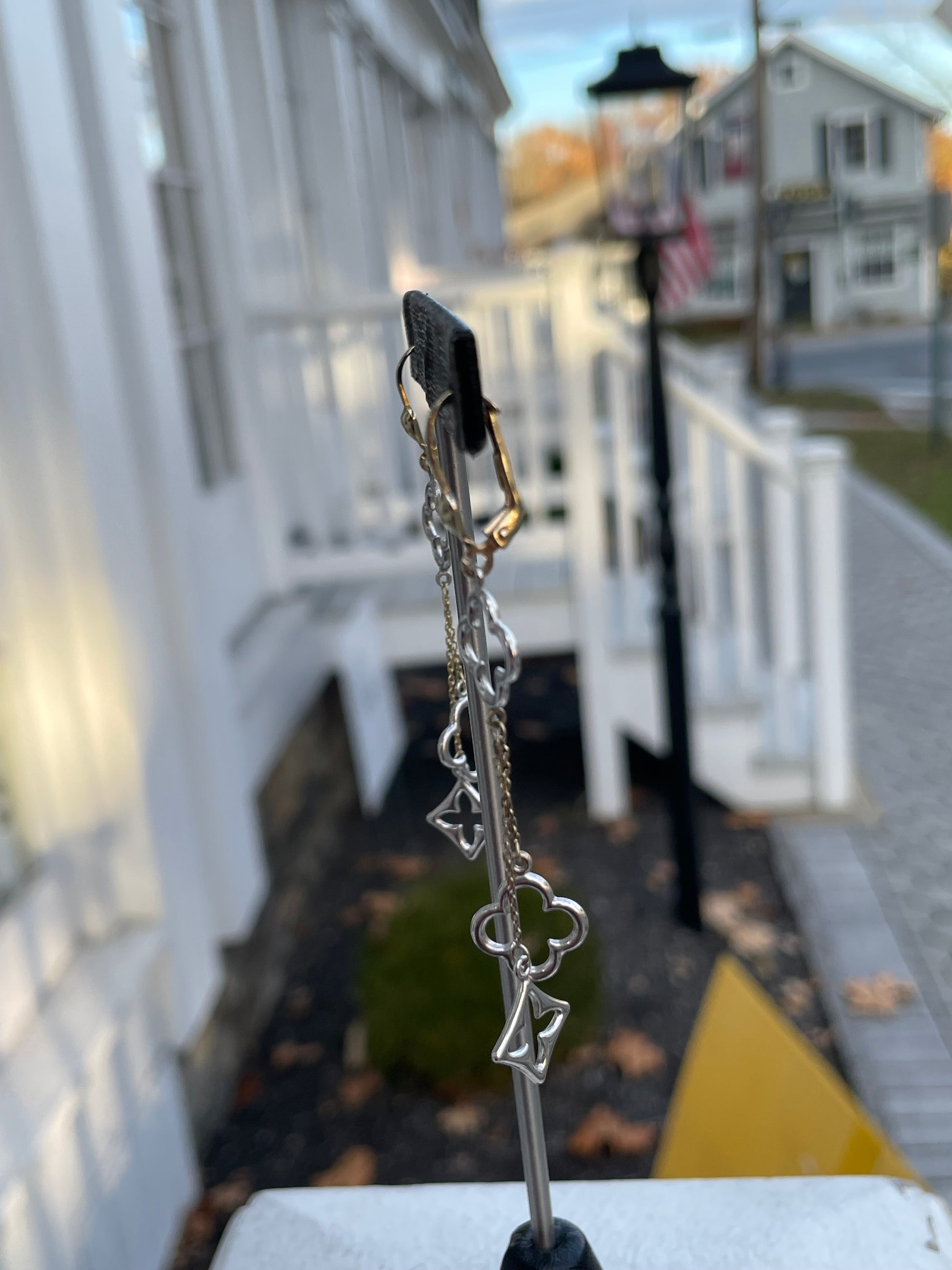 925 Sterling Silver Louis Vuitton Style Charm Dangle Earrings. Leverback closures in vermeil. 2.25” drop.