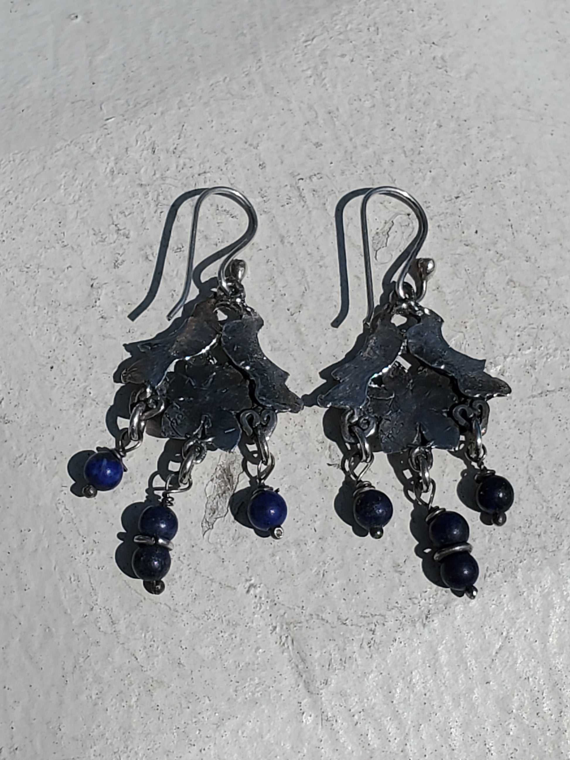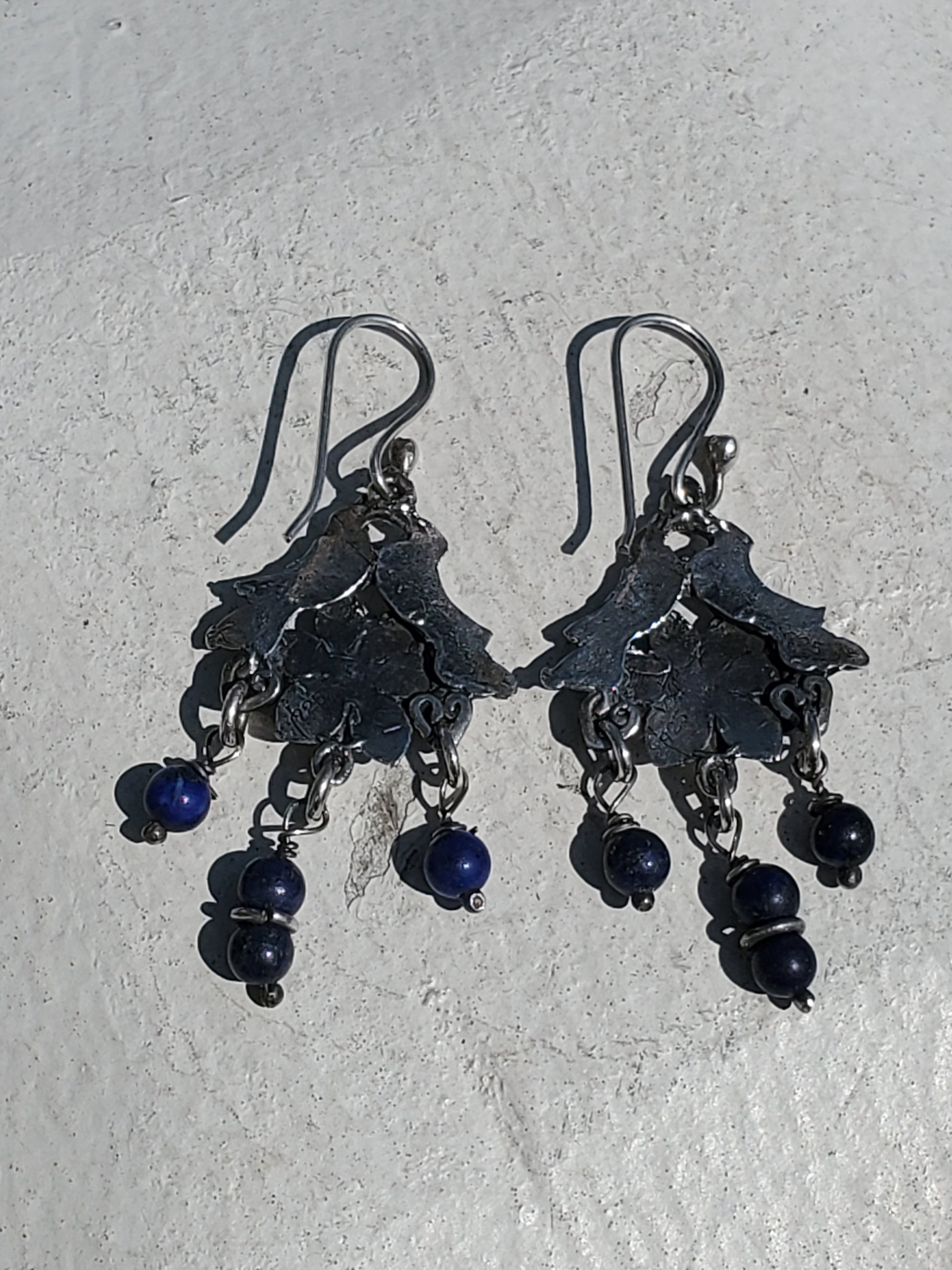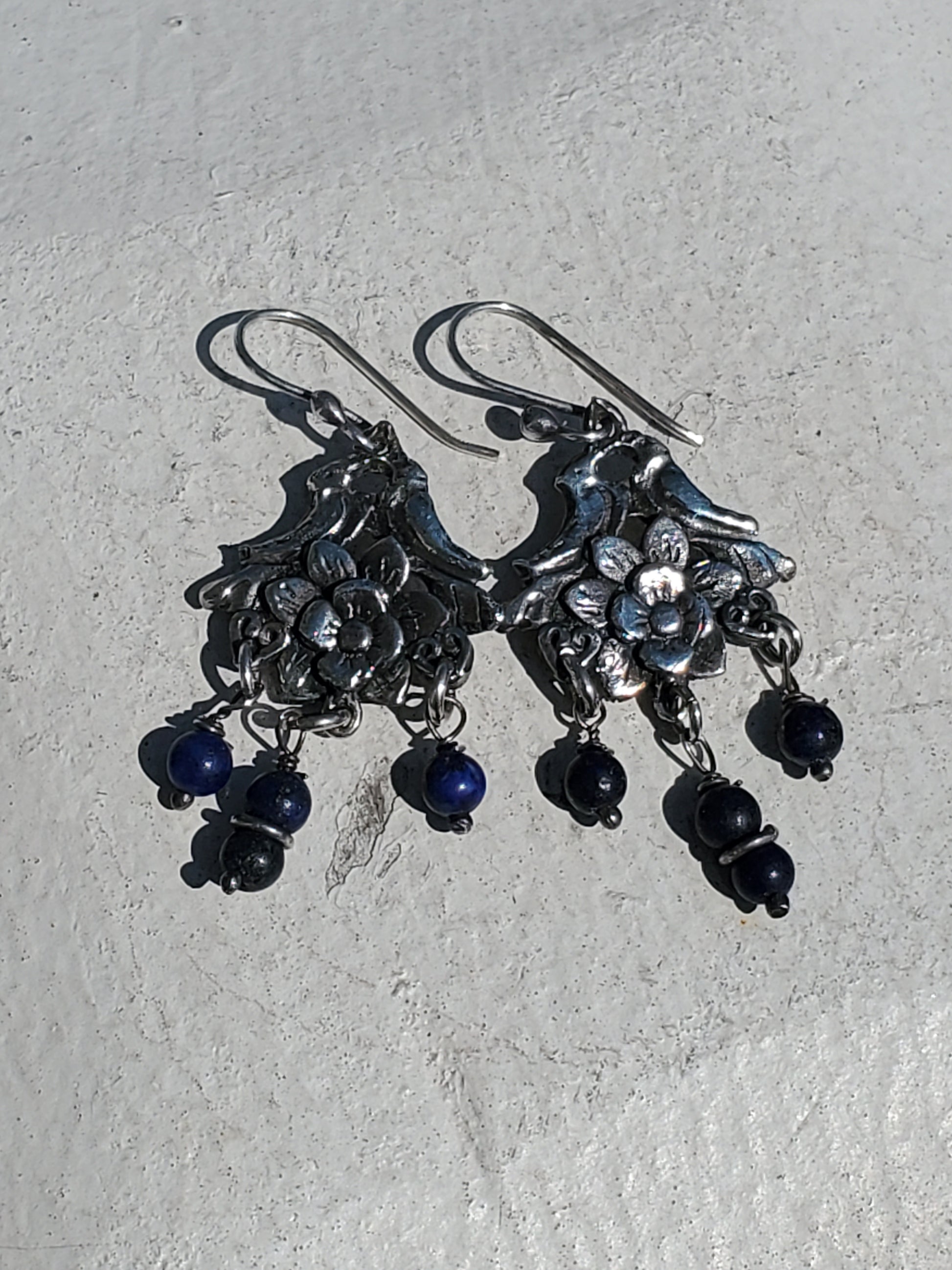 925 Sterling Silver Love Birds Floral Beaded Blue Lapis Dangle Earrings