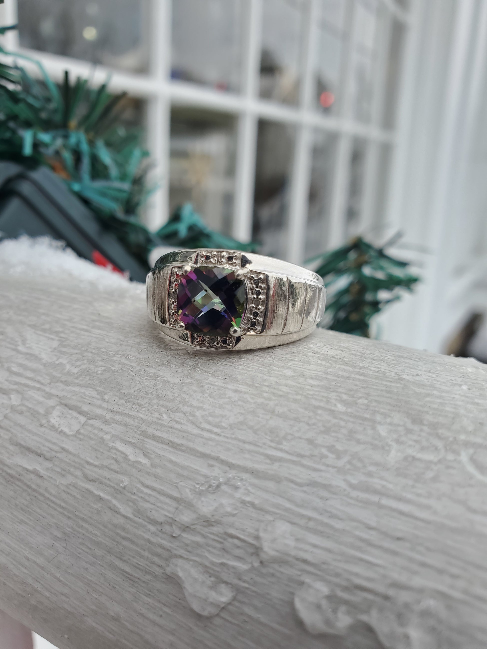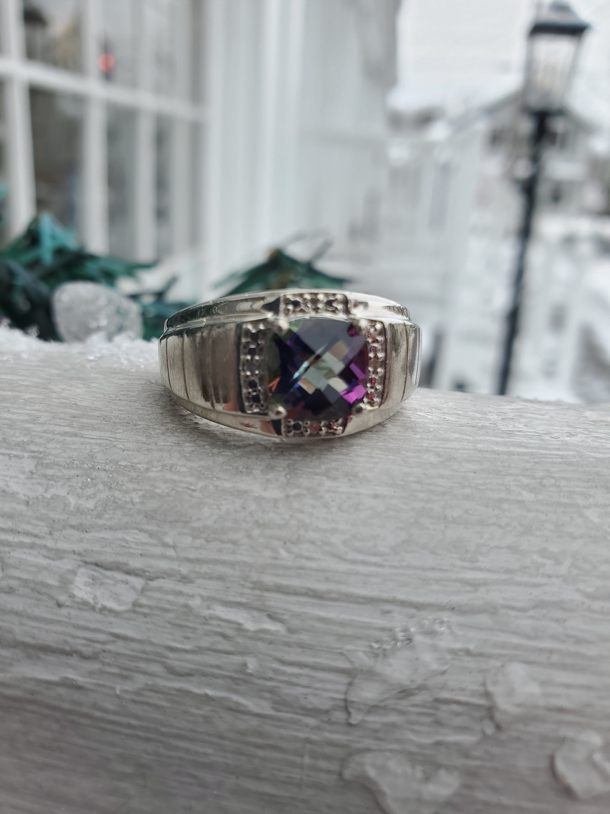 925 Sterling Silver Men's 2ct Cushion Cut Mystic Topaz & Diamond Solitare Ring