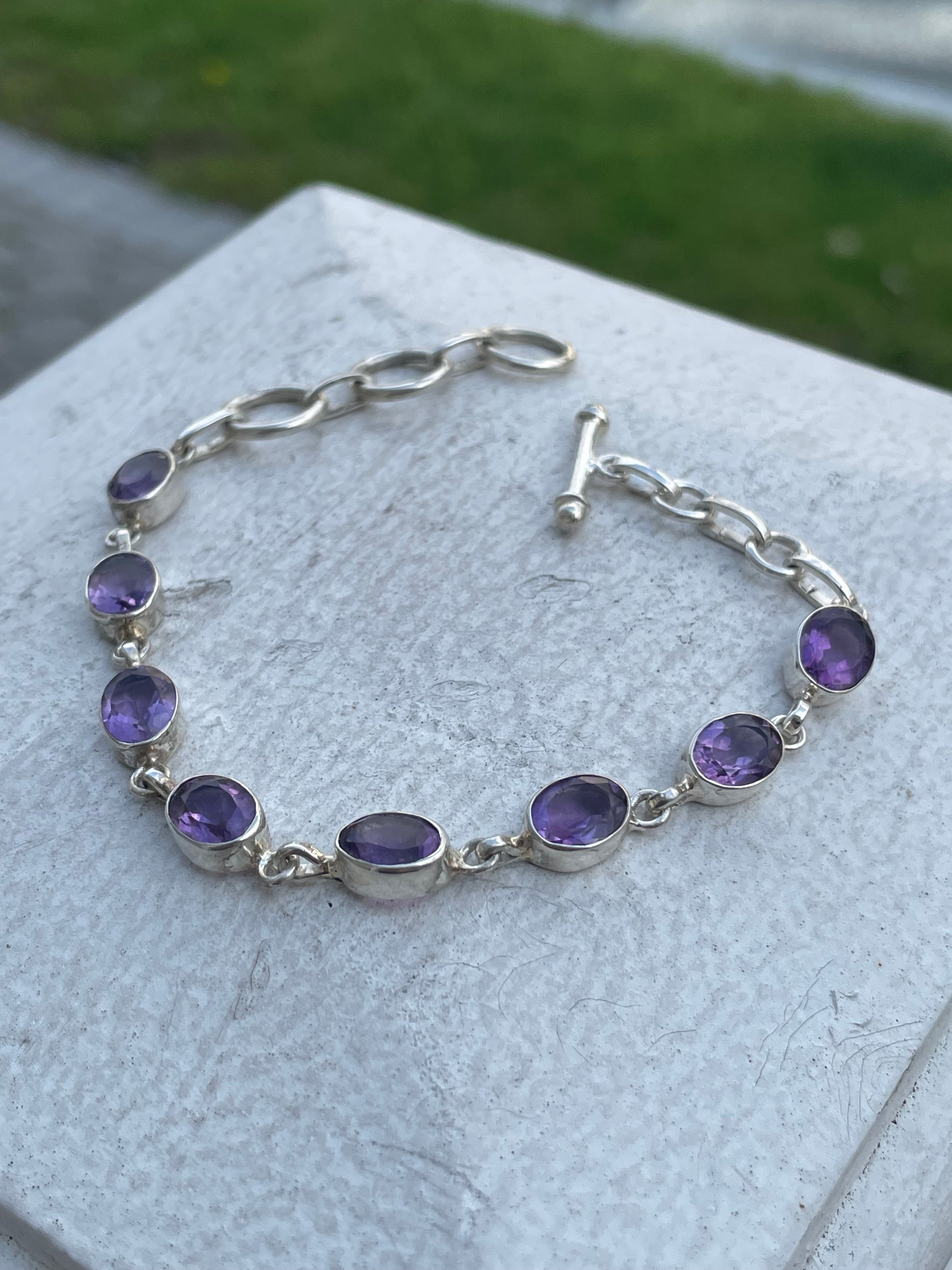 925 Sterling Silver Natural Amethyst Tennis Bracelet 7.5”. Toggle lock closure. Can be closed at 6.5”, 7”, or 7.5”. 11.9 grams. TCW: 8.00ct