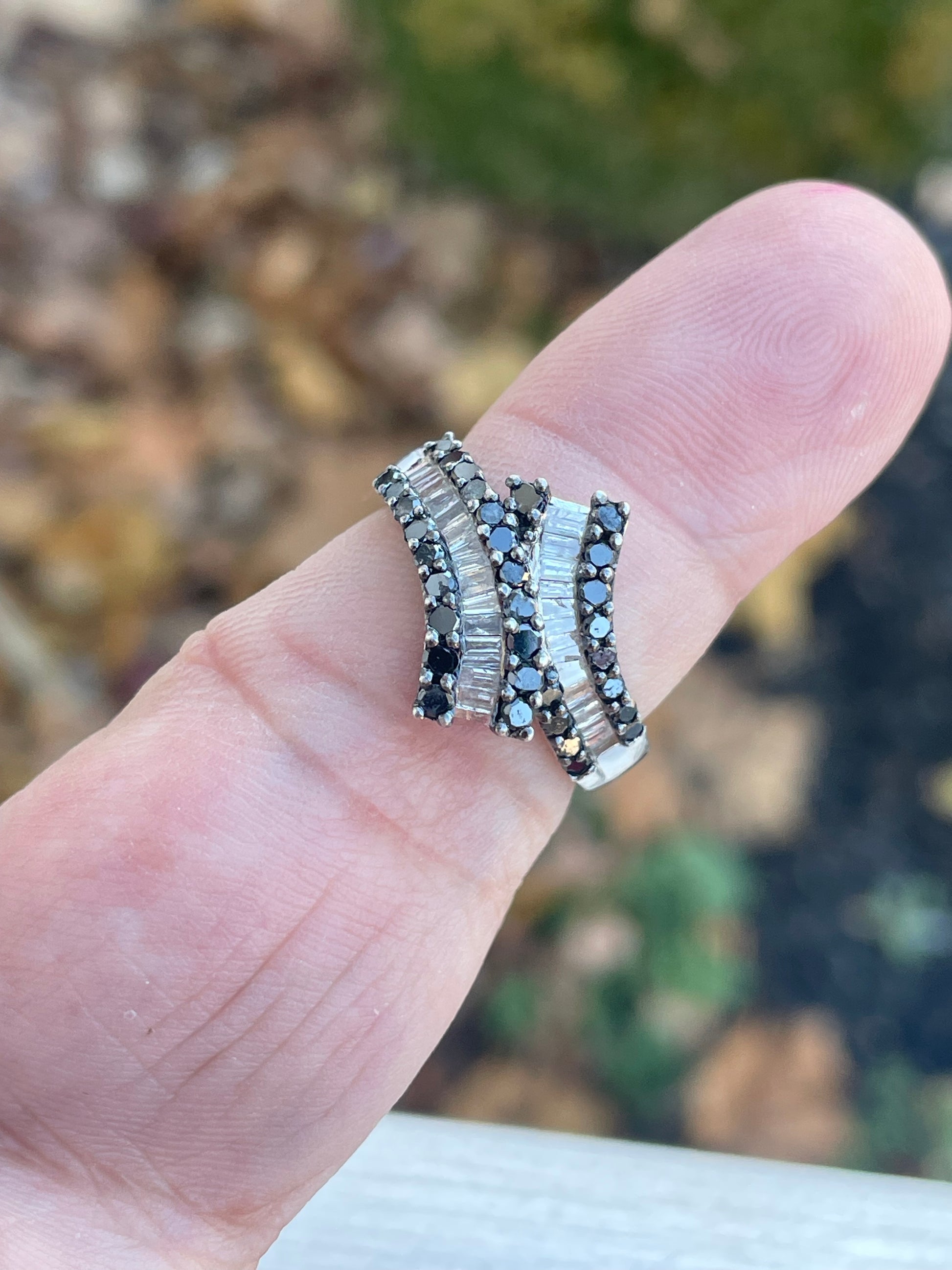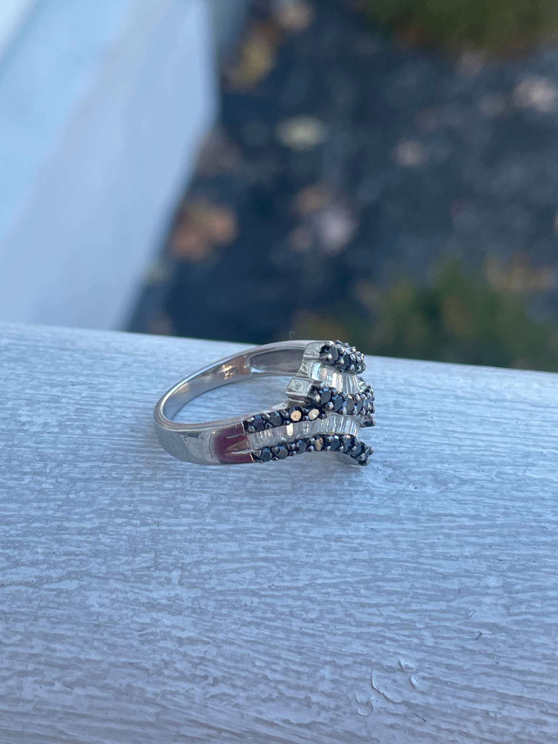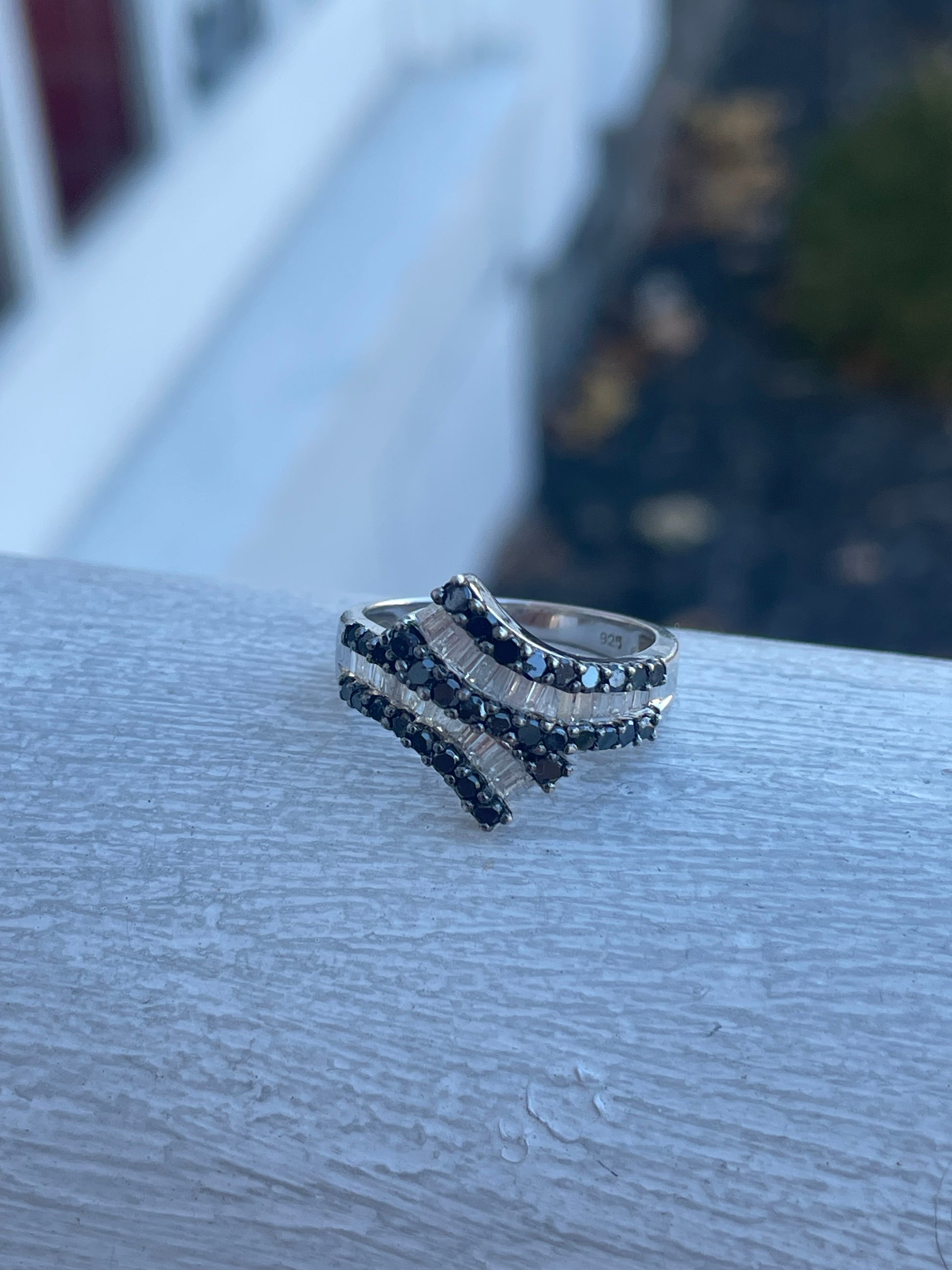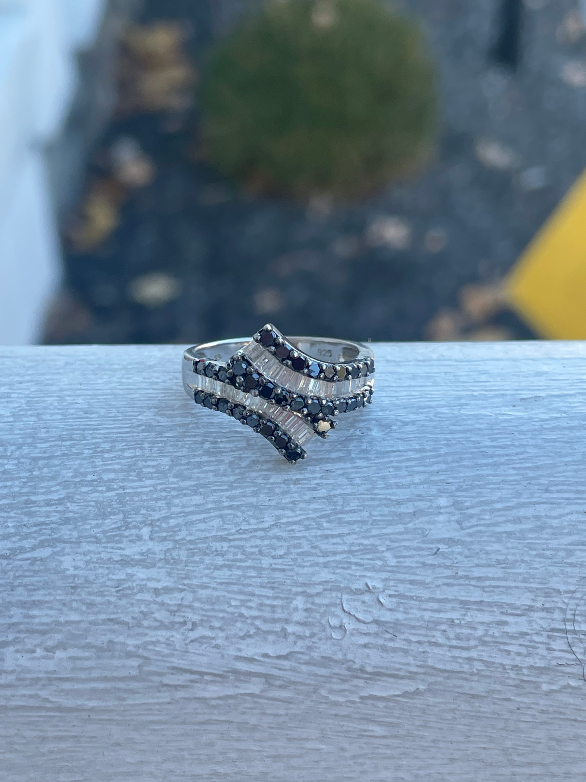 925 Sterling Silver Natural Black & White Diamond Bypass Ring Size 7. 1.00ct. 3.3 grams