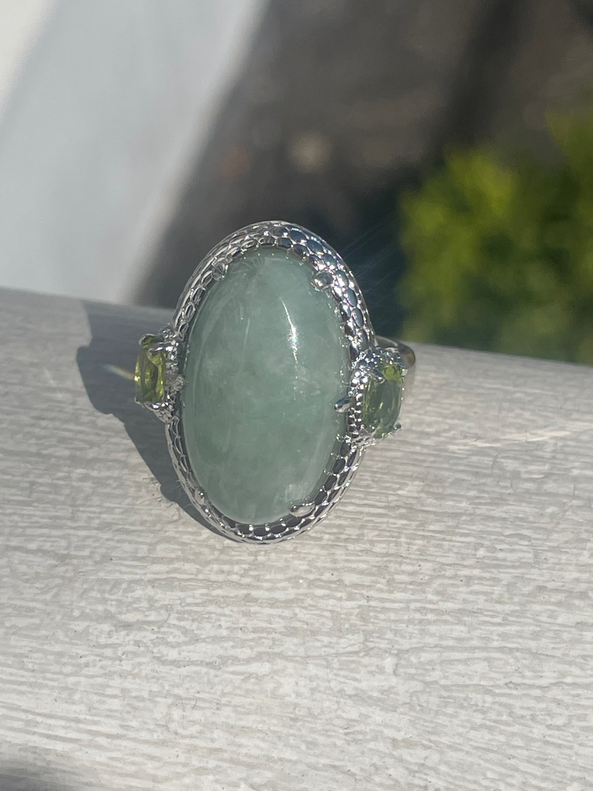 925 Sterling Silver Natural Jade & Peridot Statement Ring Size 6. (10.8 grams)