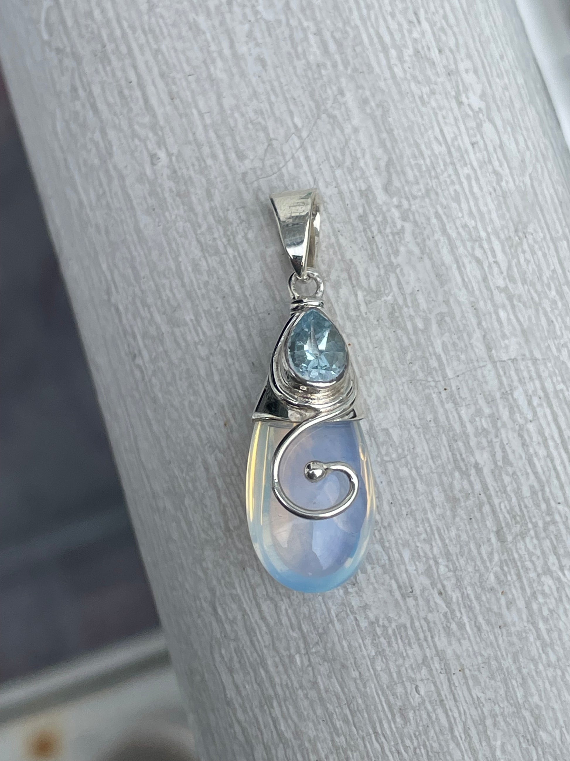 925 Sterling Silver Opalescent & Blue Topaz Teardrop Pendant. 1.5” long.
