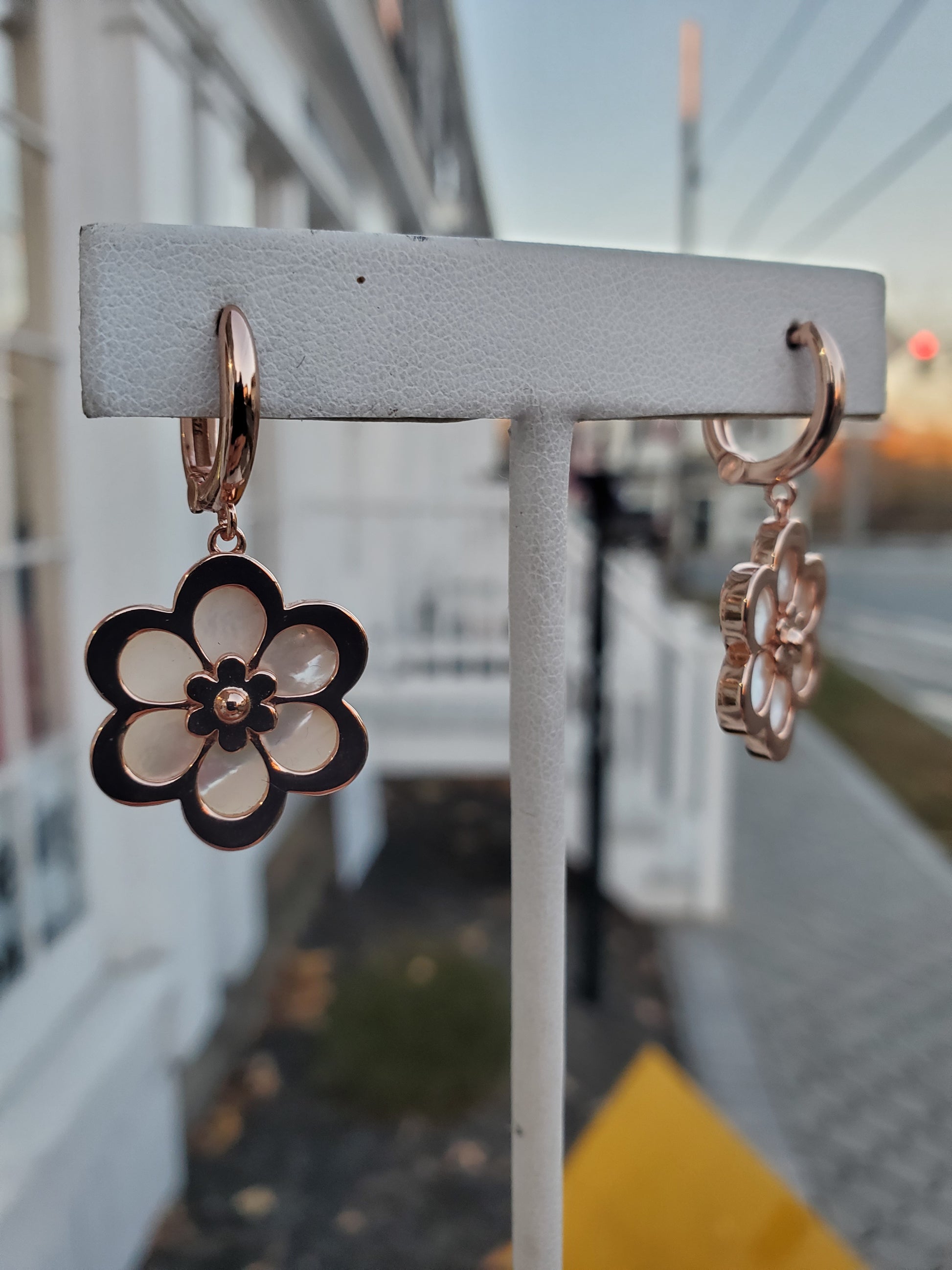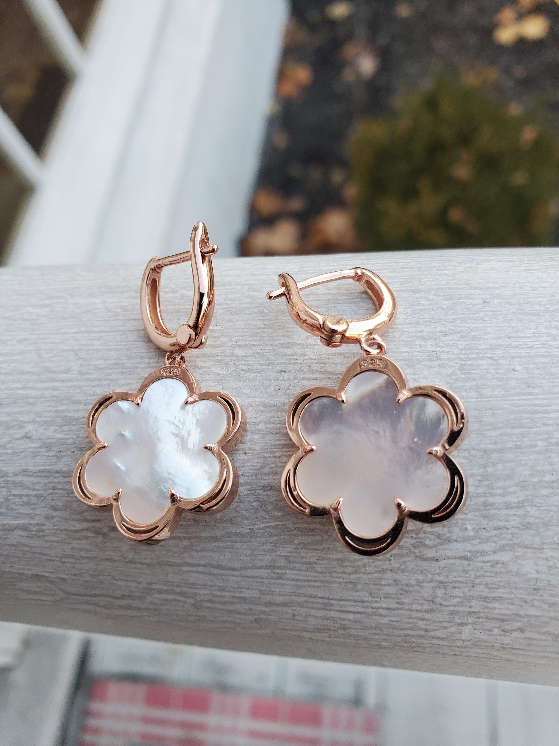 925 Sterling Silver Rose Vermeil Mother of Pearl Flower Leaverback Earrings