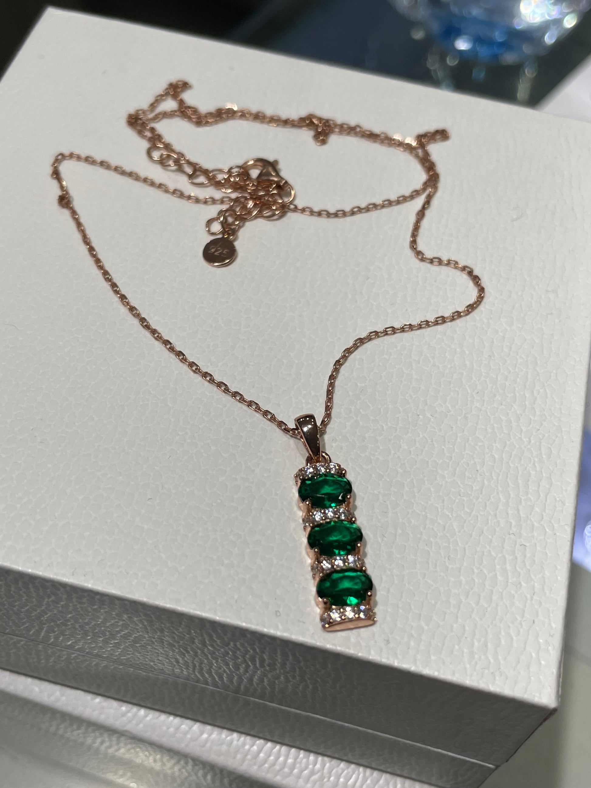 925 Sterling Silver Rose Vermeil Vertical Green Zirconia Drop Necklace. This necklace can be fastened at 16”-18” long.
