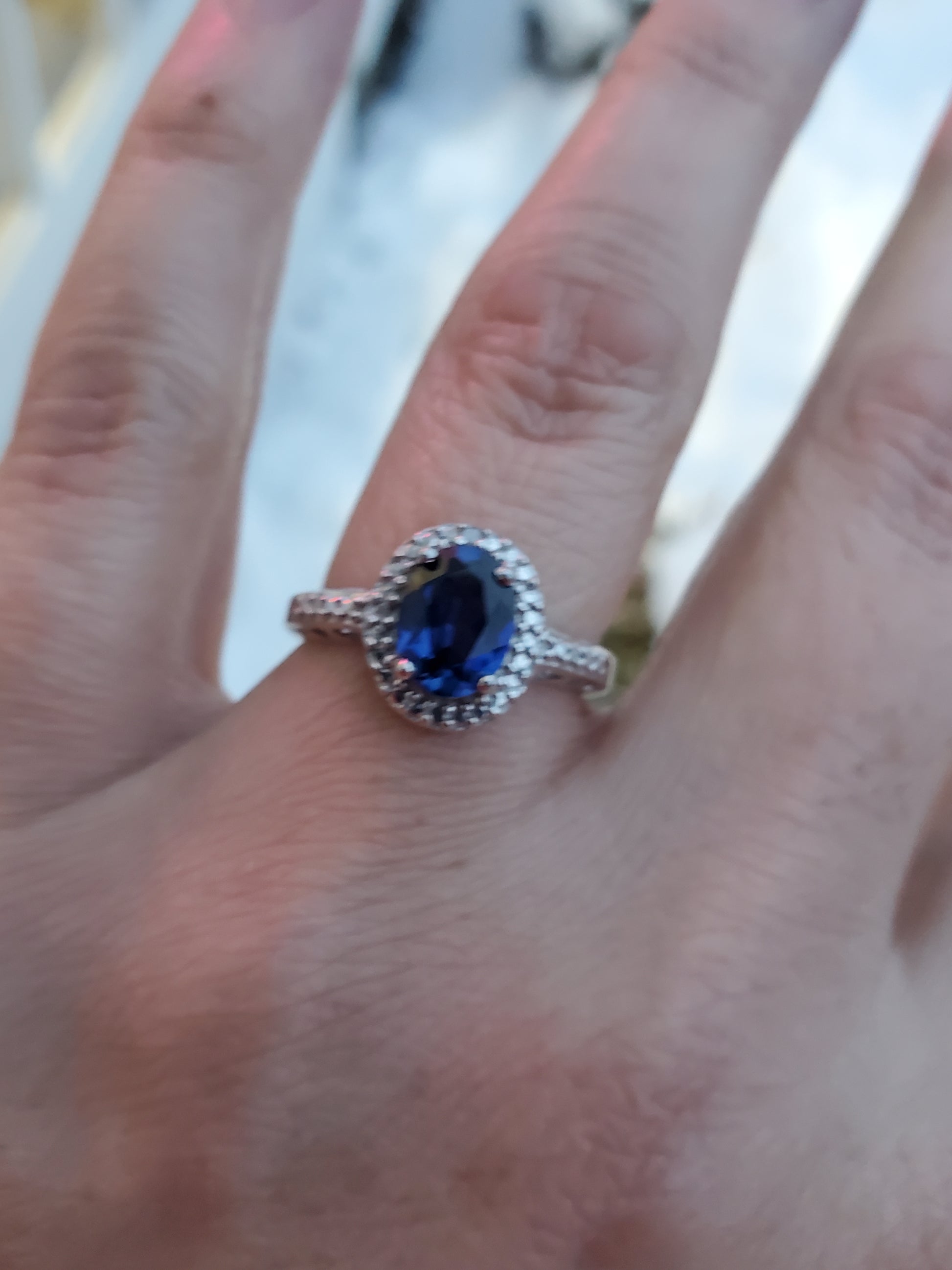 Indulge in the luxurious elegance of our 925 Sterling Silver Simulated 1ct Oval Sapphire & Diamond Halo Ring. Featuring a brilliant 1ct simulated oval sapphire encircled by sparkling diamonds, this ring is sure to add a touch of glamour to any outfit. With a comfortable finger size 7 and a total weight of 3.3 grams, you'll never want to take it off.