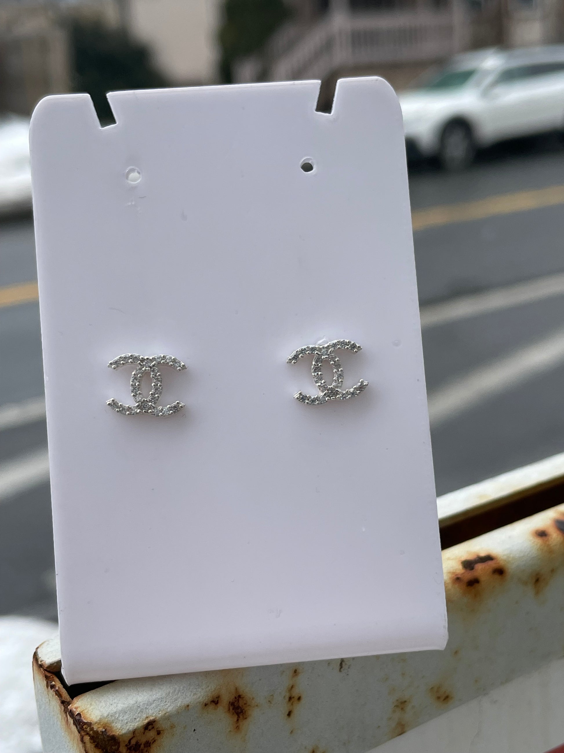 925 Sterling Silver Sparkling Petite Chanel Logo CC Stud Earrings (K11)