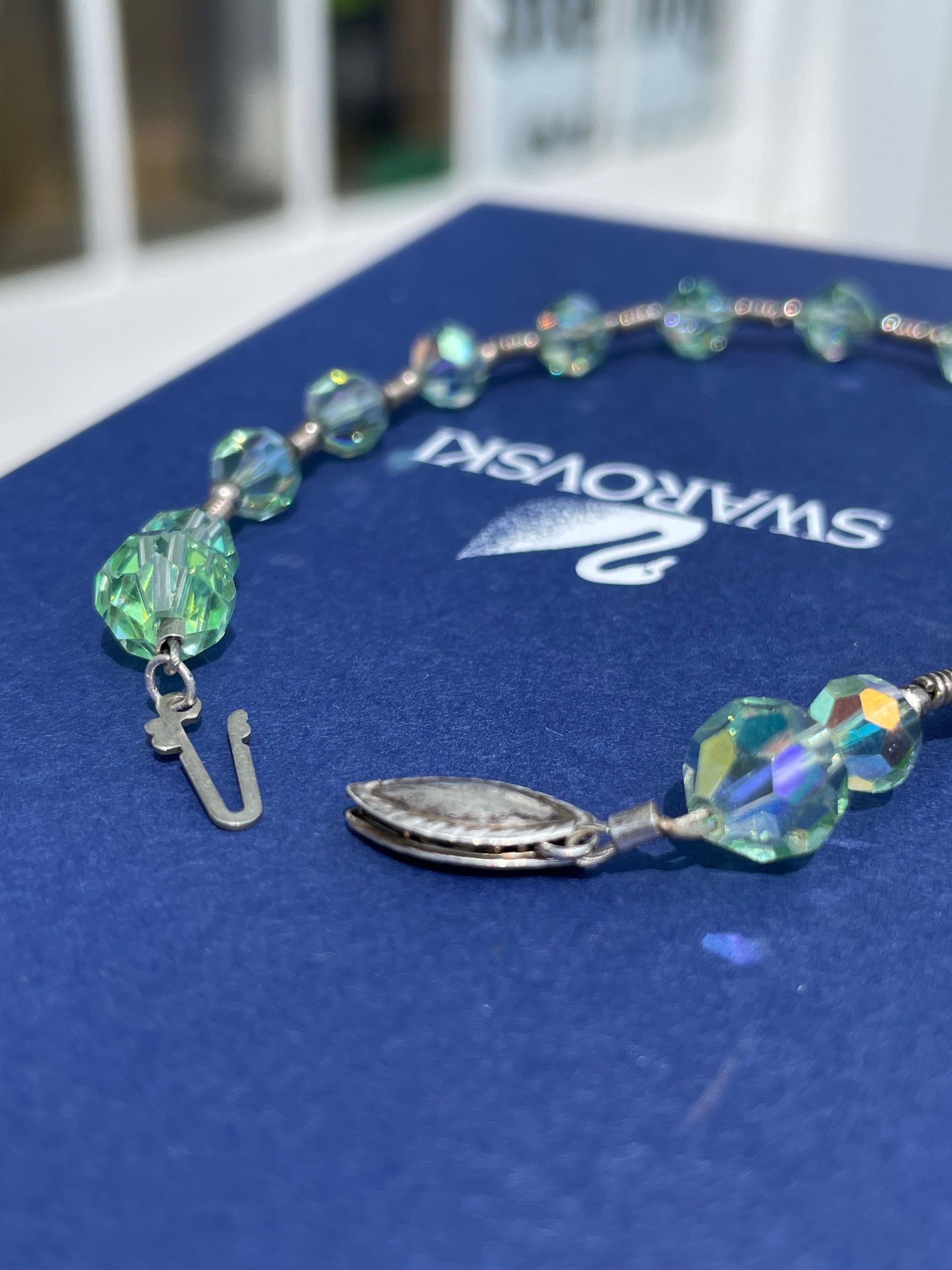 925 Sterling Silver Swarovski Elements Green Crystal Beaded Bracelet 7.5” Fishtail lock. (6.6 grams)