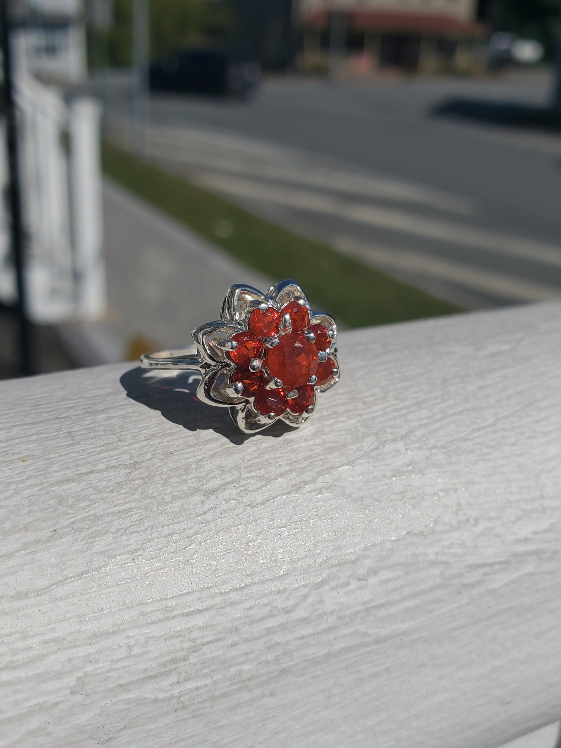 Crafted from 925 sterling silver, this Tangerine Zirconia Flower Cluster Ring adds a touch of elegance to any outfit. Featuring a stunning cluster of tangerine zirconia flowers, it weighs 4.4 grams and fits a finger size of 7.5. Upgrade your jewelry collection with this unique and delicate piece.