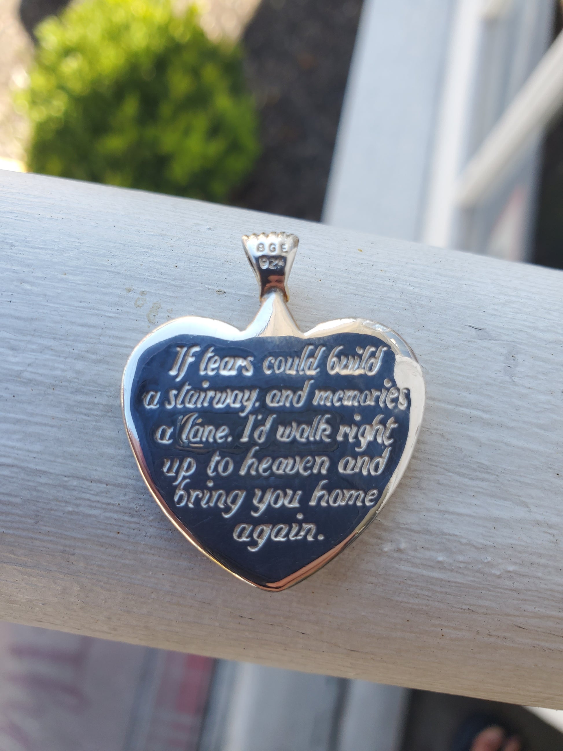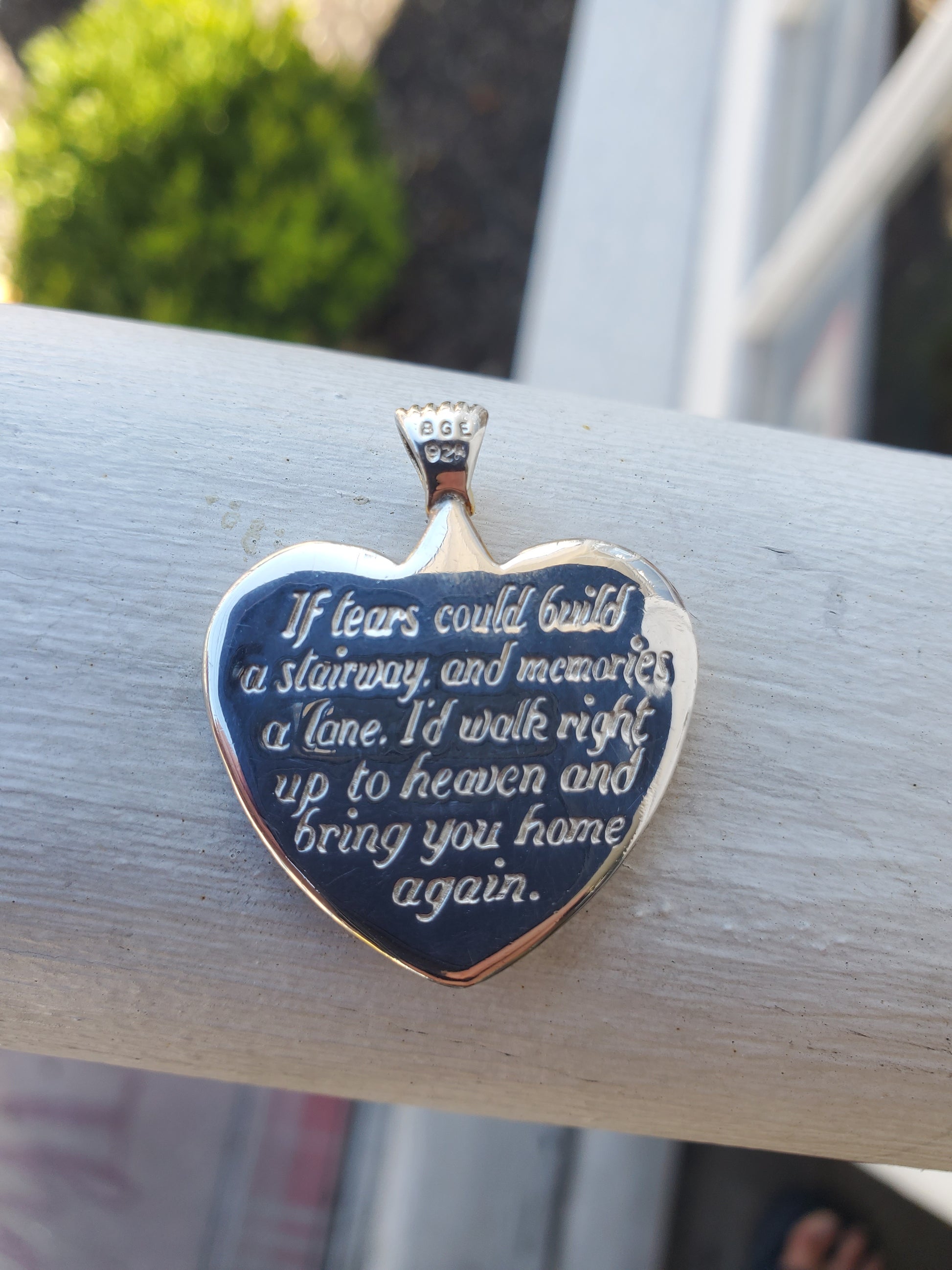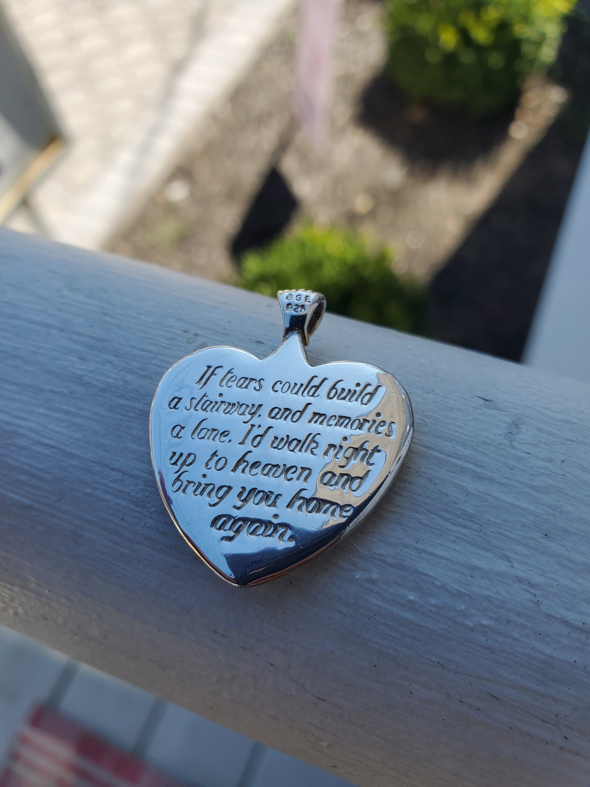 Elevate your style with our stunning 925 Sterling Silver & Vermeil Designer Bradford Exchange Angelic Angel Wing Crystal Heart Pendant. The intricate angel wing design and deep engraved inscription "If tears could build a stairway and memories alone, I'd walk right up to heaven and bring you home" add a heartfelt touch to this elegant piece.