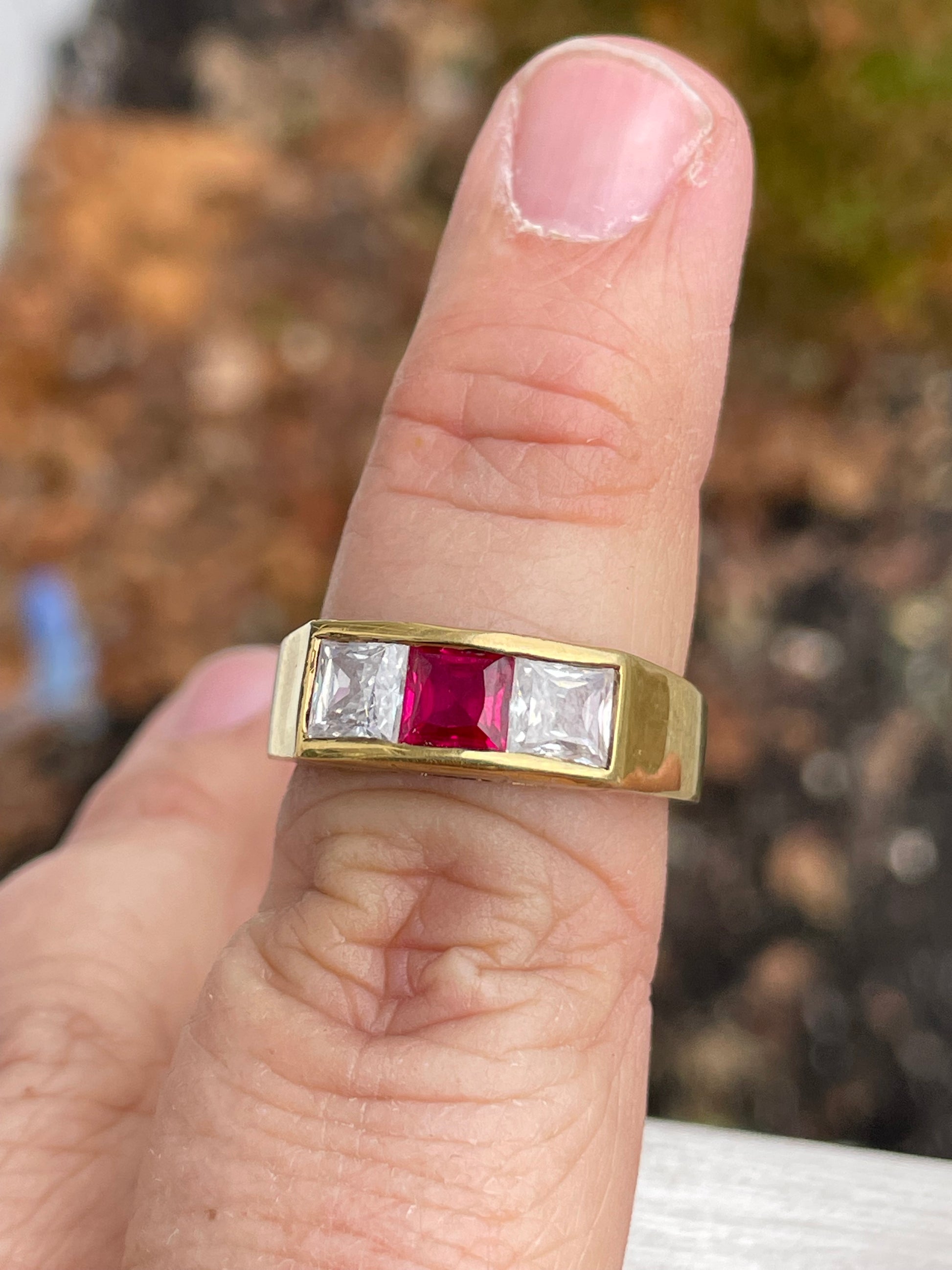 925 Sterling Silver Vermeil Men’s Triple Stone Band Ring Size 10. 7.3 grams. Simulated Ruby center with clear Cz sides. All stones are Chanel set and Princess cut.