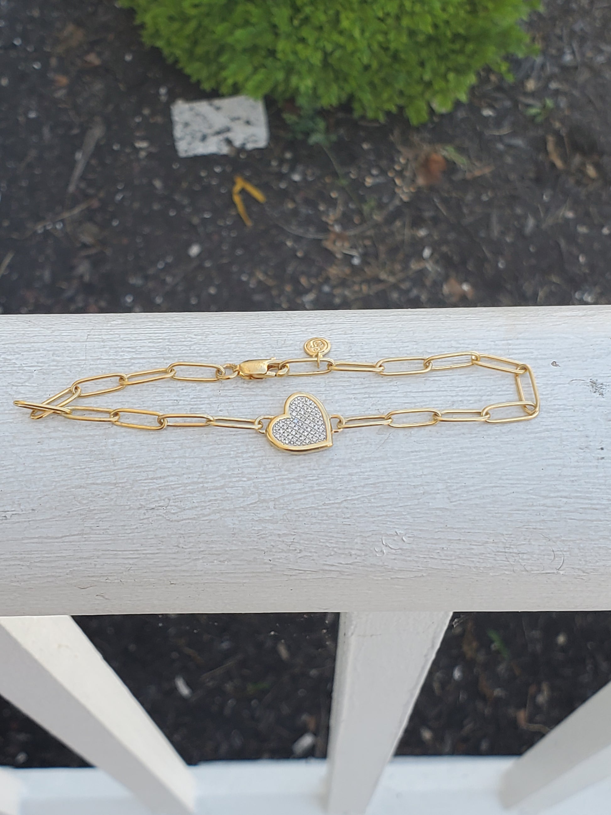 925 Sterling Silver Vermeil Pave Heart Zirconia Paperclip Bracelet