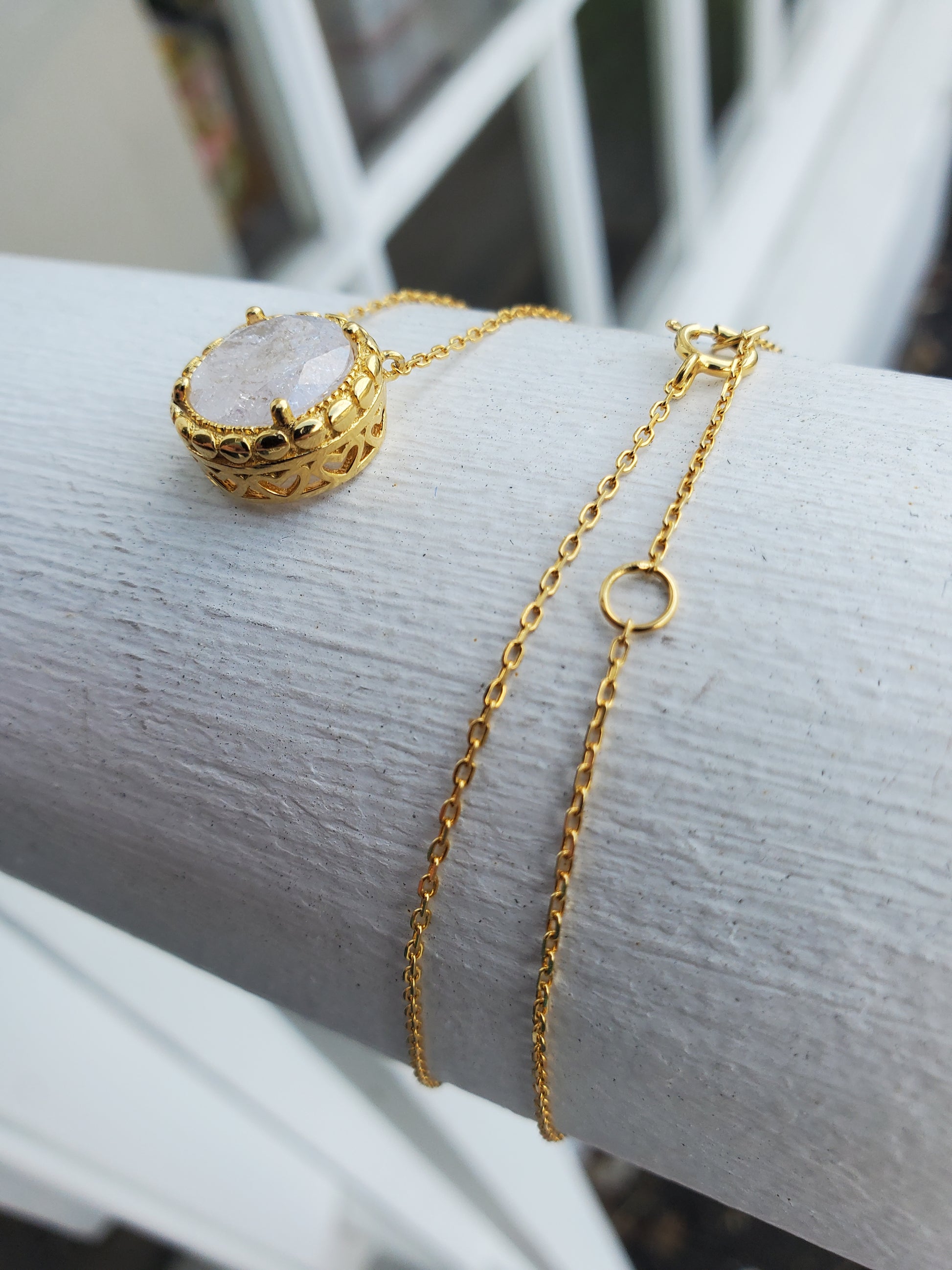925 Sterling Silver Vermeil Rock Crackle Quartz Crystal Solitare Necklace. Adjustable cable link chain can be clipped at 16", 17", or 18" long.