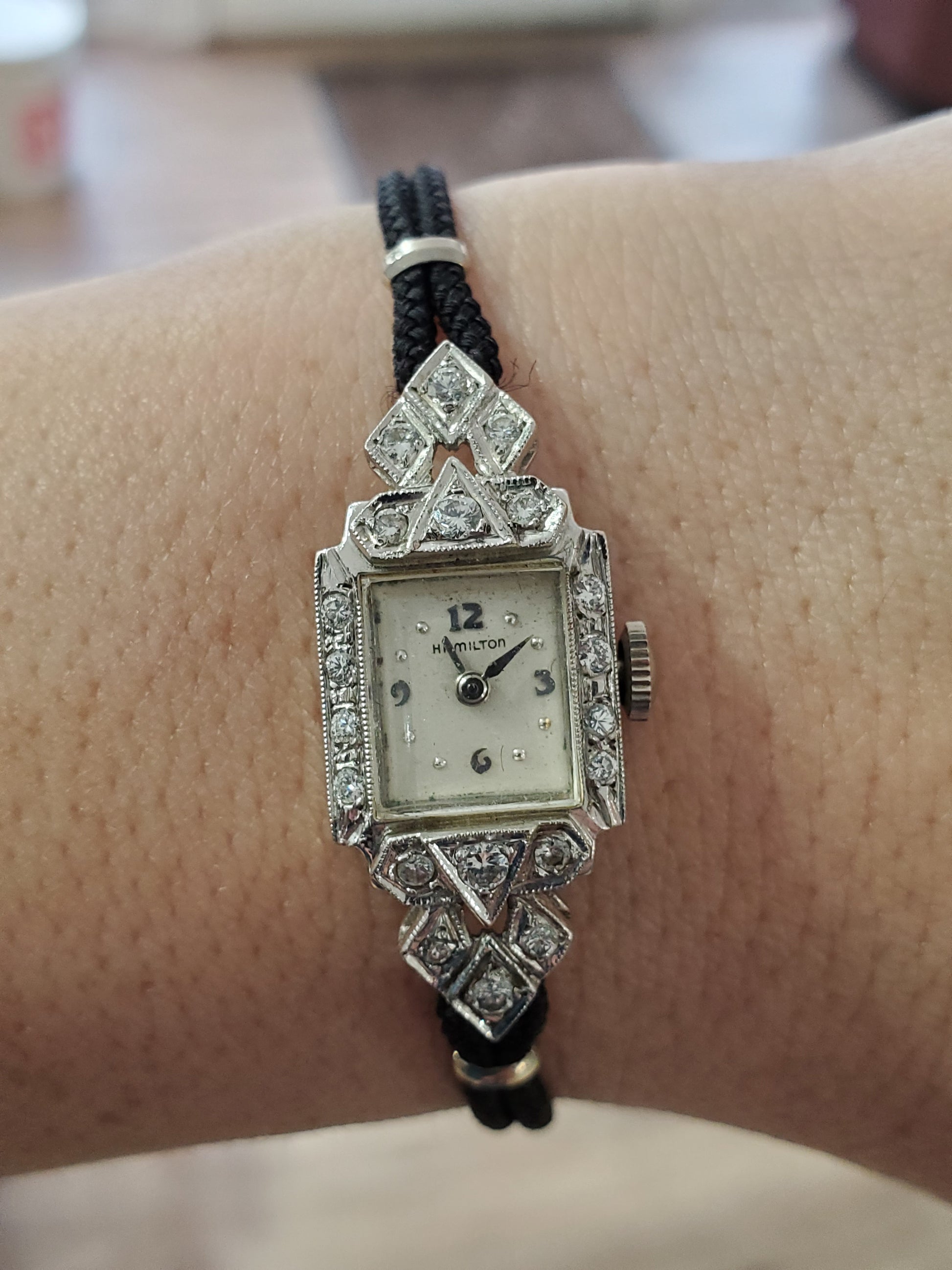 Discover the exquisite allure of the Antique Ladies Hamilton watch, a masterpiece forged in 14k white gold and platinum, adorned with a delicate array of diamonds totaling half a carat. The sophisticated black fabric cord band, designed to embrace a wrist of up to 6.5 inches, artfully complements this opulent timepiece, evoking a sense of timeless elegance and refined grace.