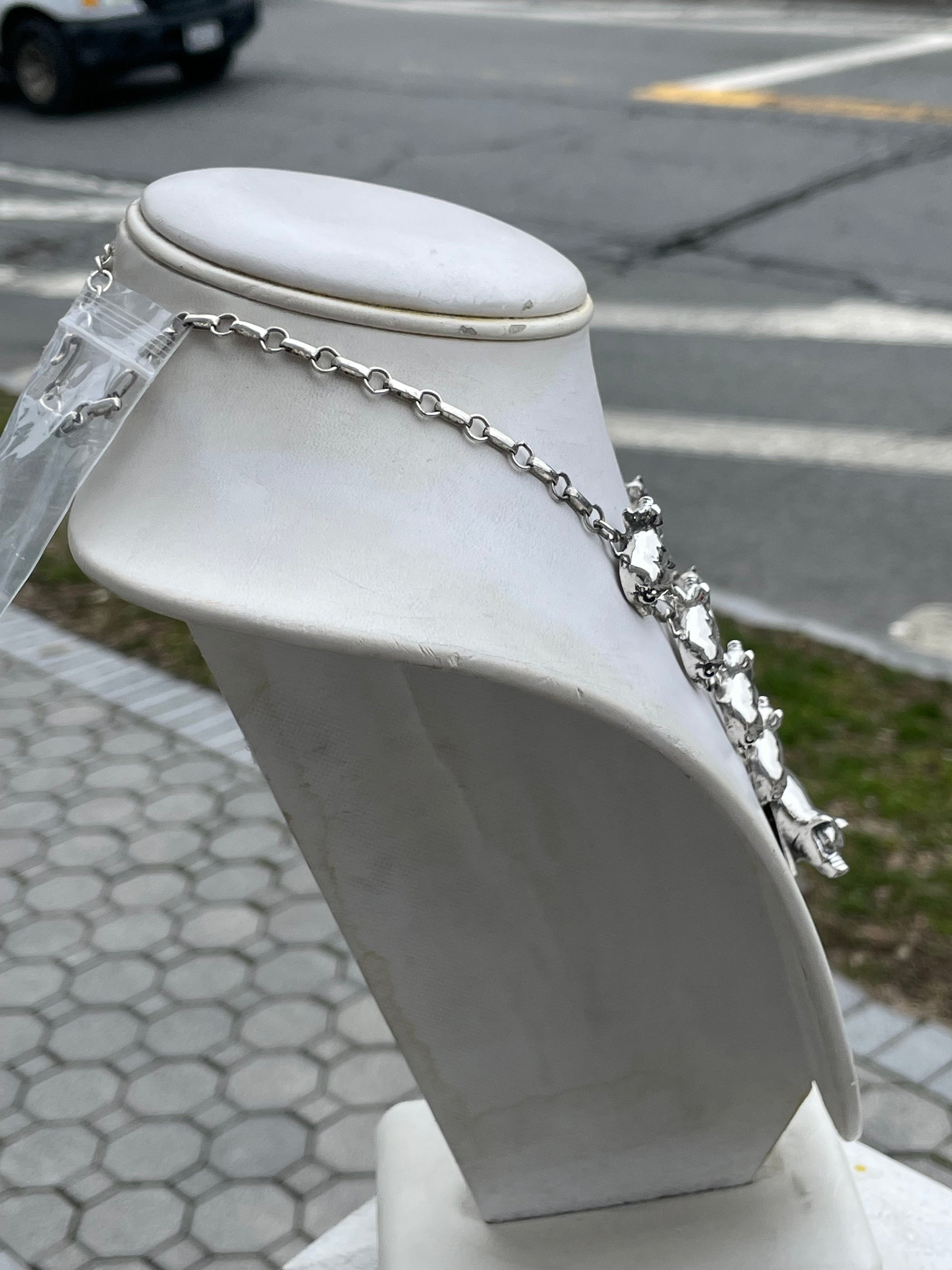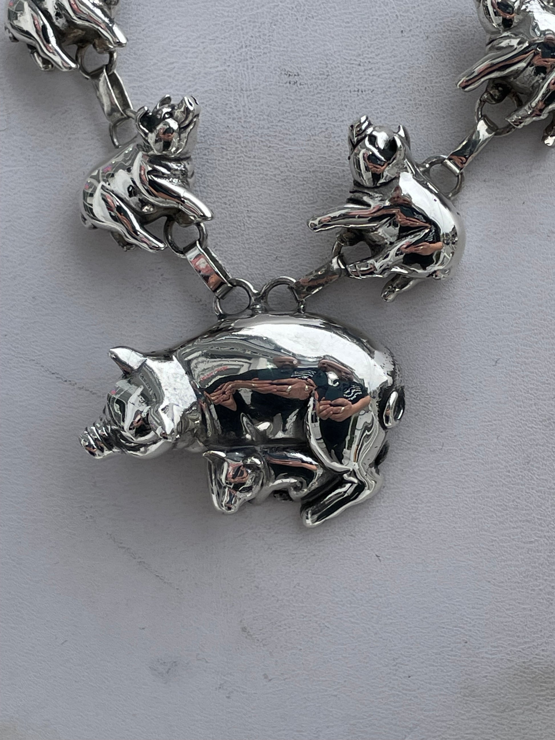 Designer Carol Felley Native American Pig Family Station Necklace 925 Sterling Silver. 57.4 grams. 18” long. The pigs are hollowed out in the back, but all are in 3D form. At 57.4 grams; the necklace is quite heavy.