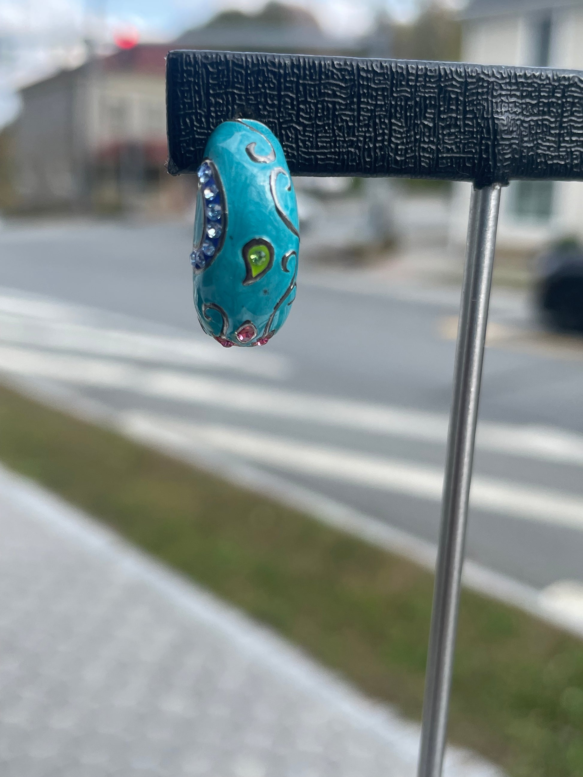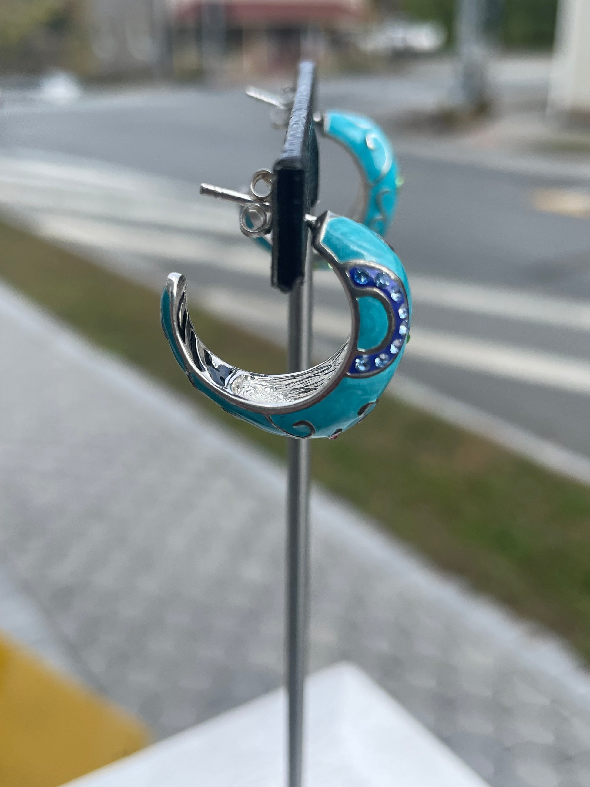 Designer David Sigal Decorative Blue Enamel 3/4 Hoop Earrings