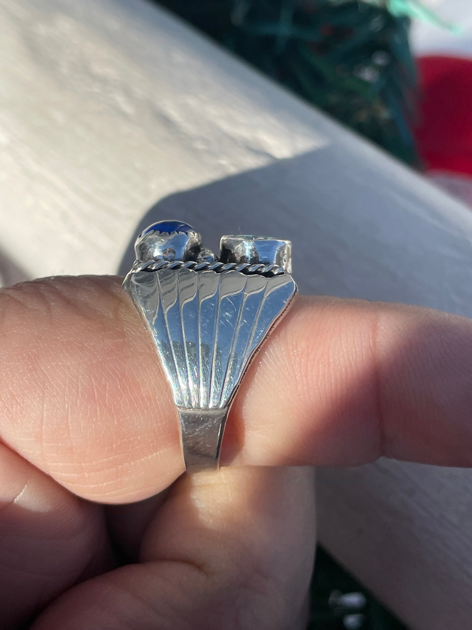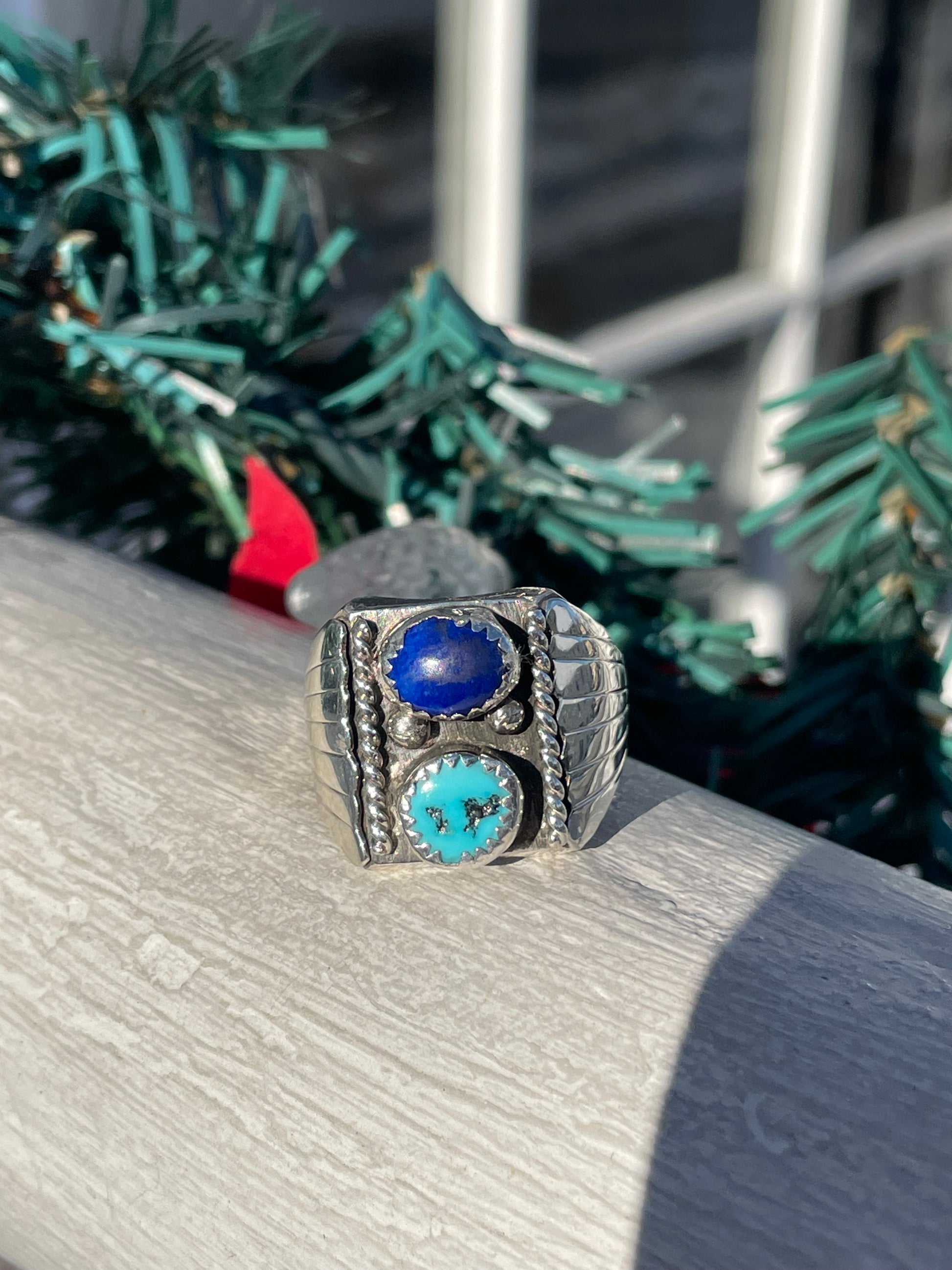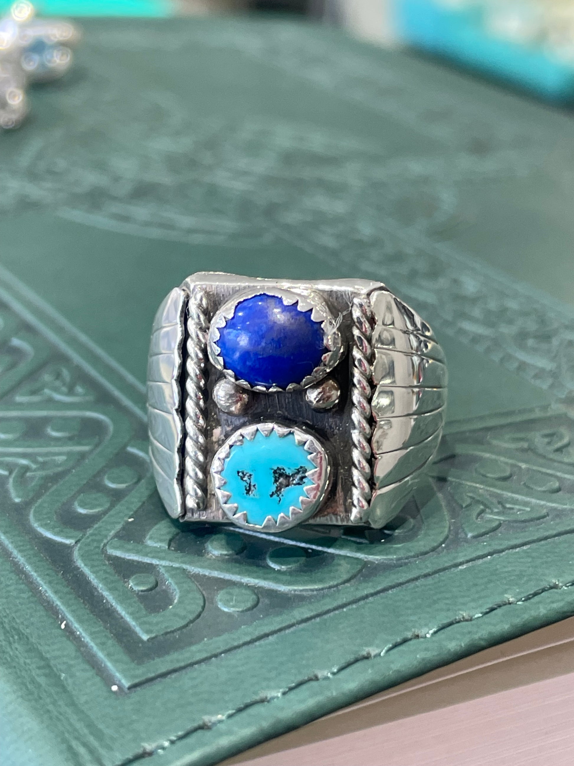 Designer DM 925 Sterling Silver Turquoise & Blue Lapis Double Stone Navajo Signet Ring Size 11.5
