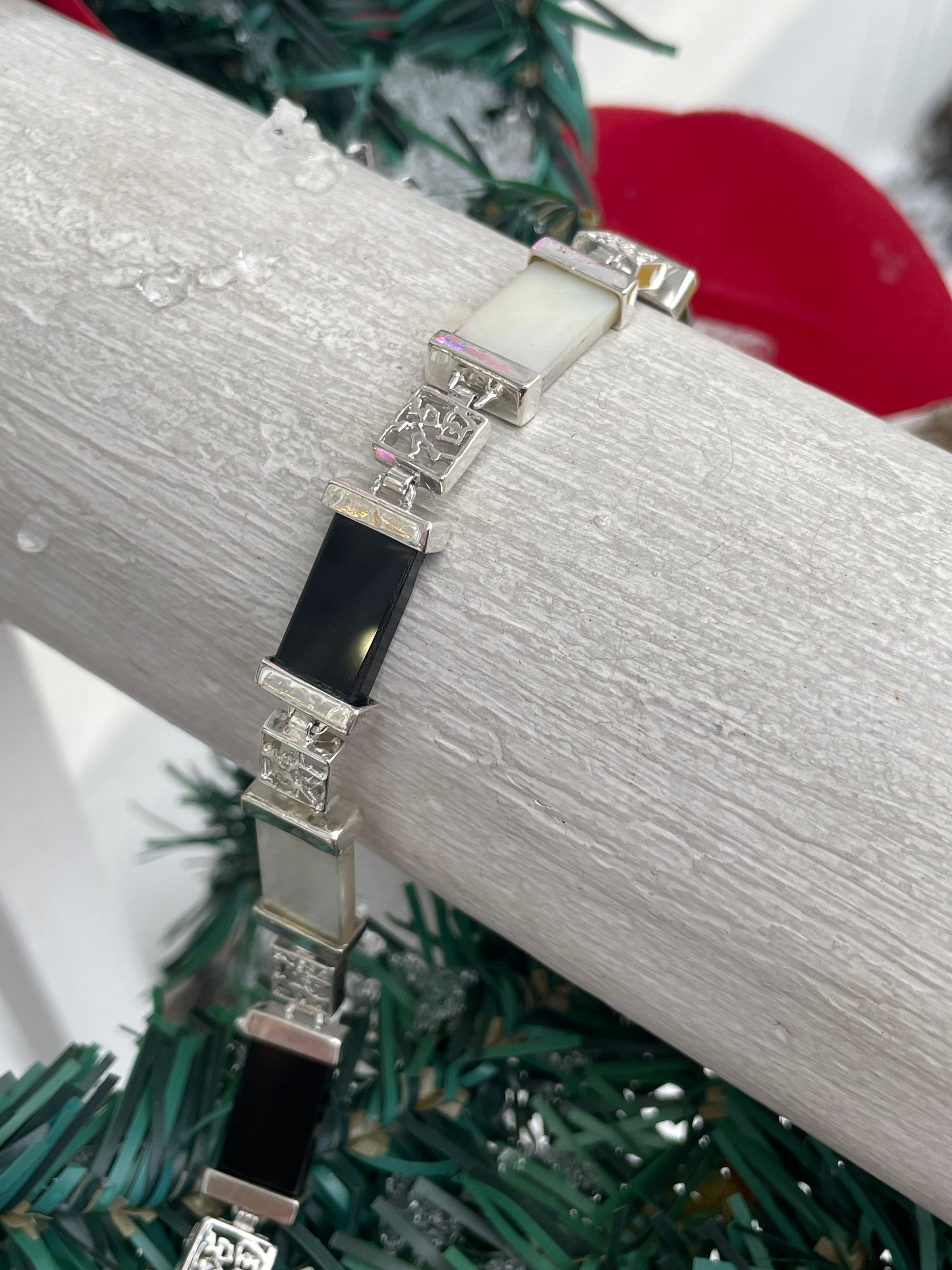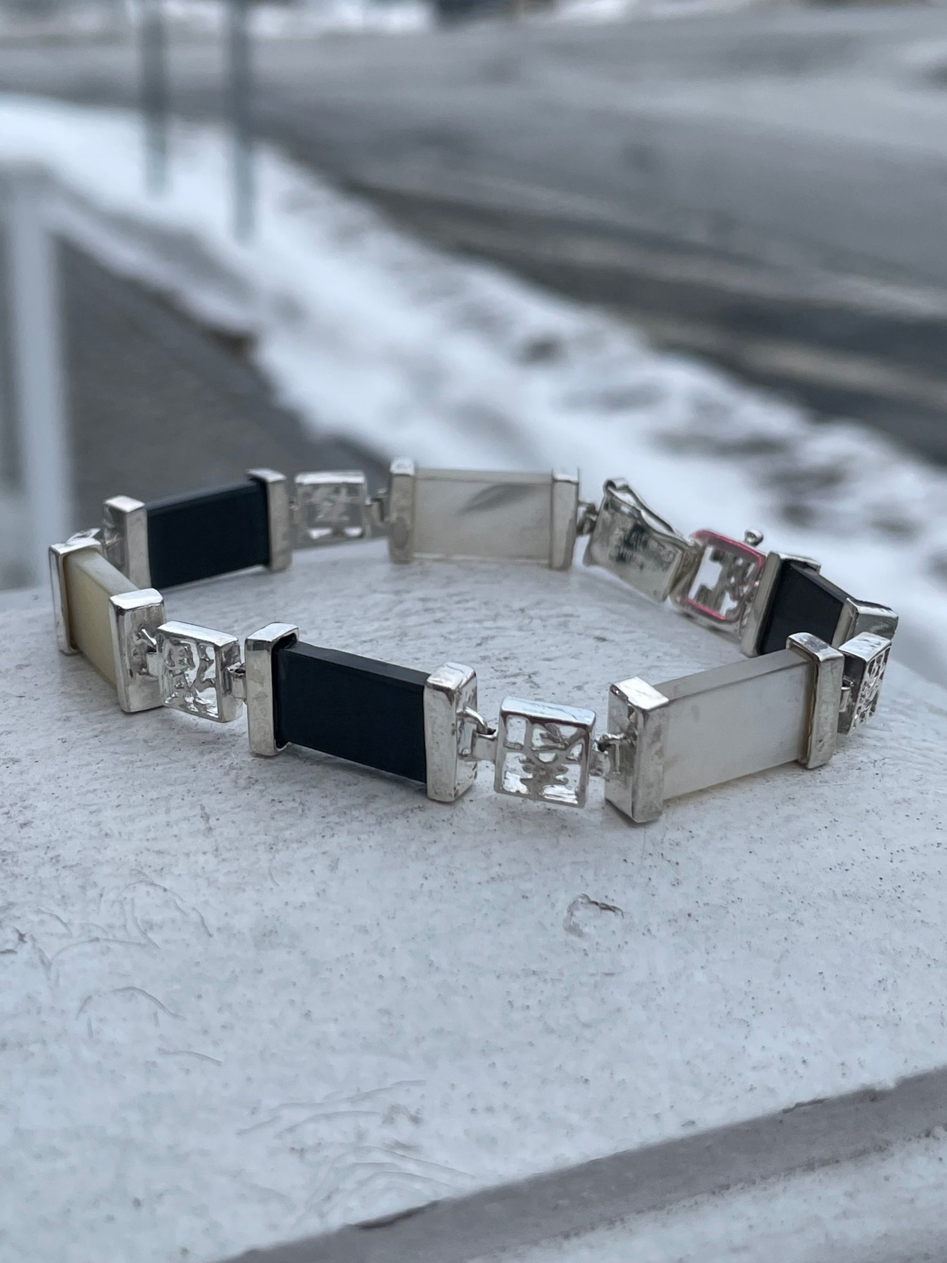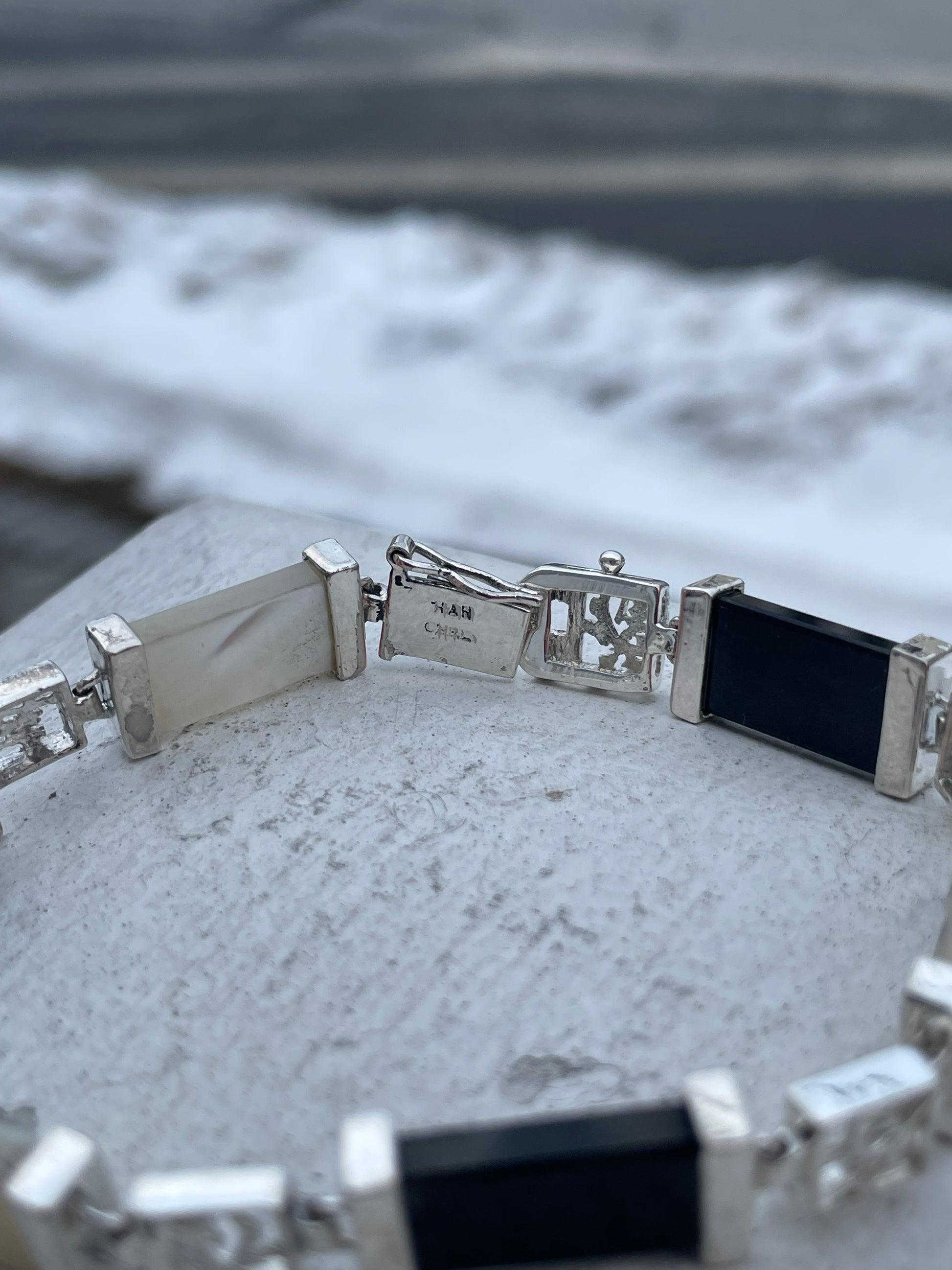 Designer HAN 925 Sterling Silver Onyx & Mother of Pearl Good Fortune Stone Bracelet 7.75”
