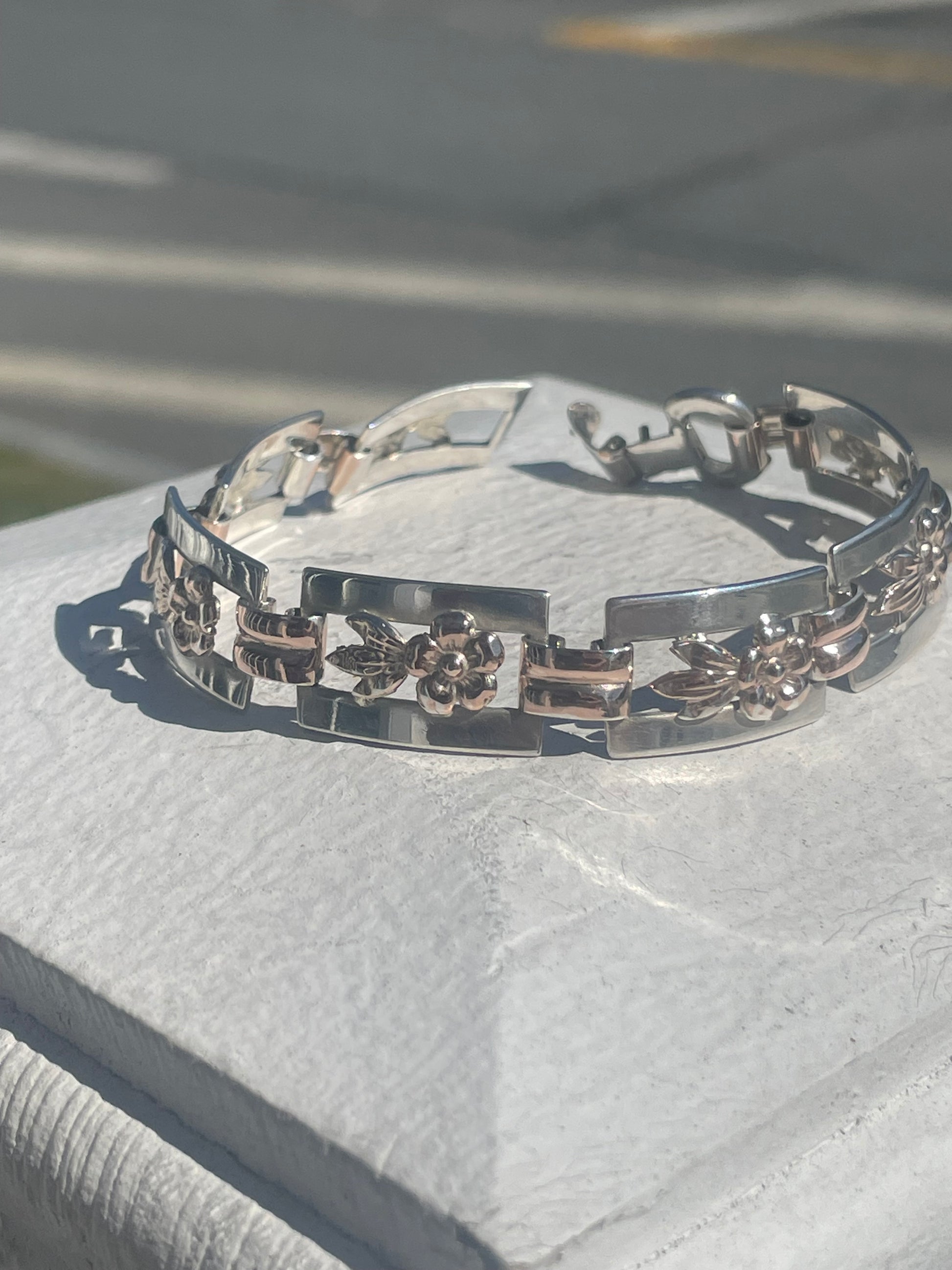 Designer Kreisler 925 Sterling Silver & Rose Vermeil Vintage Openwork Flower Tile Bracelet. From the 1940s. 7” wrist size. 18.3 grams.