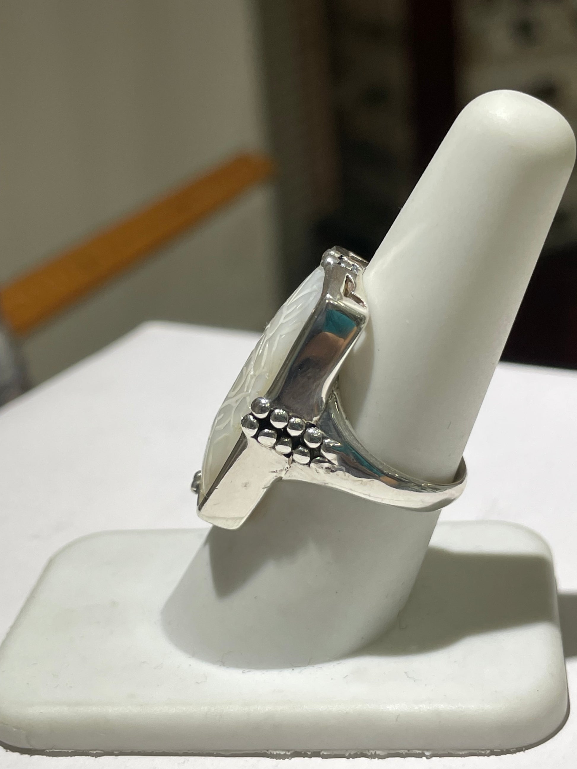 Large Hand Etched Mother of Pearl Signet 925 Sterling Silver Ring Size 8. 10.4 grams.