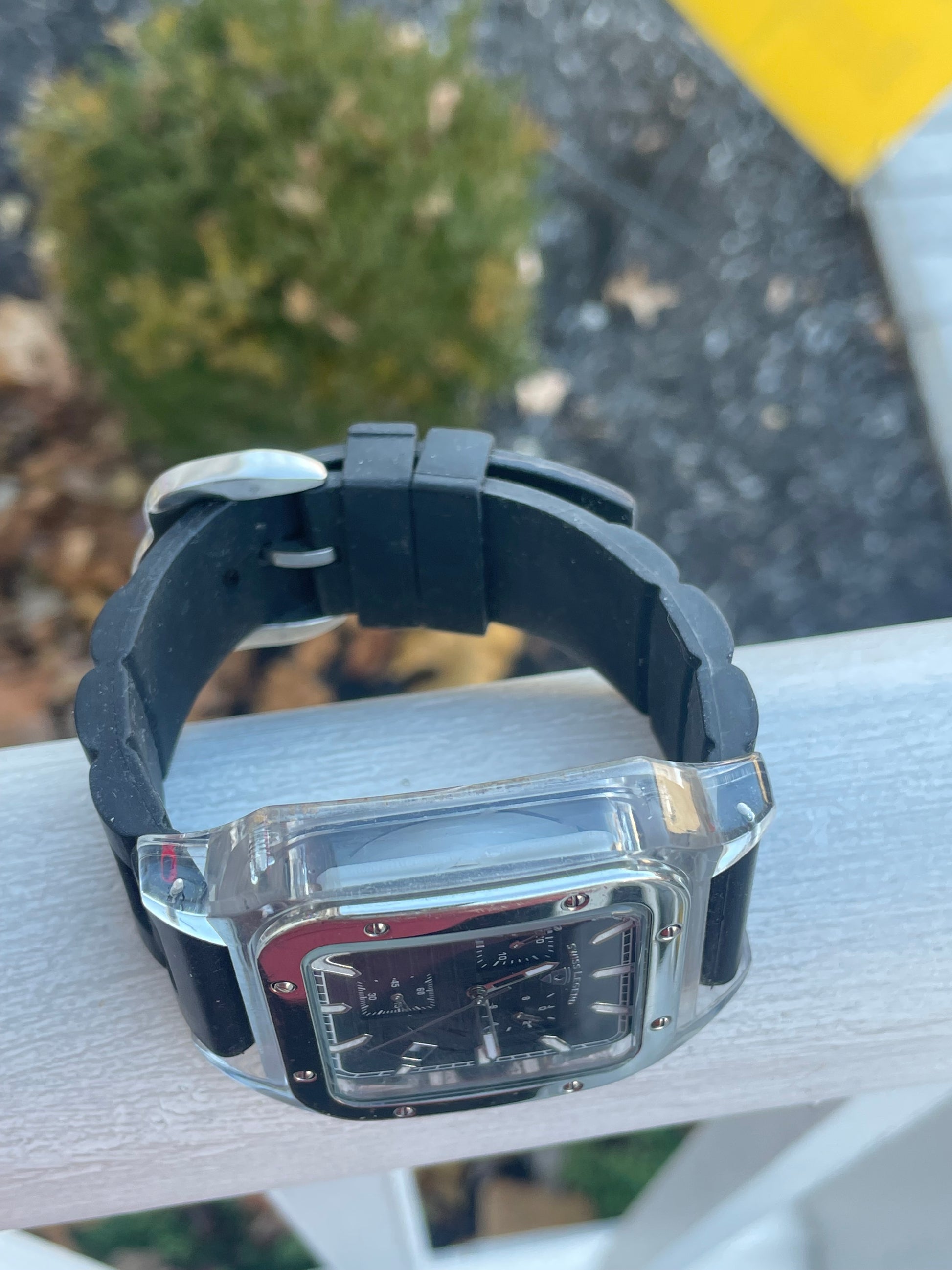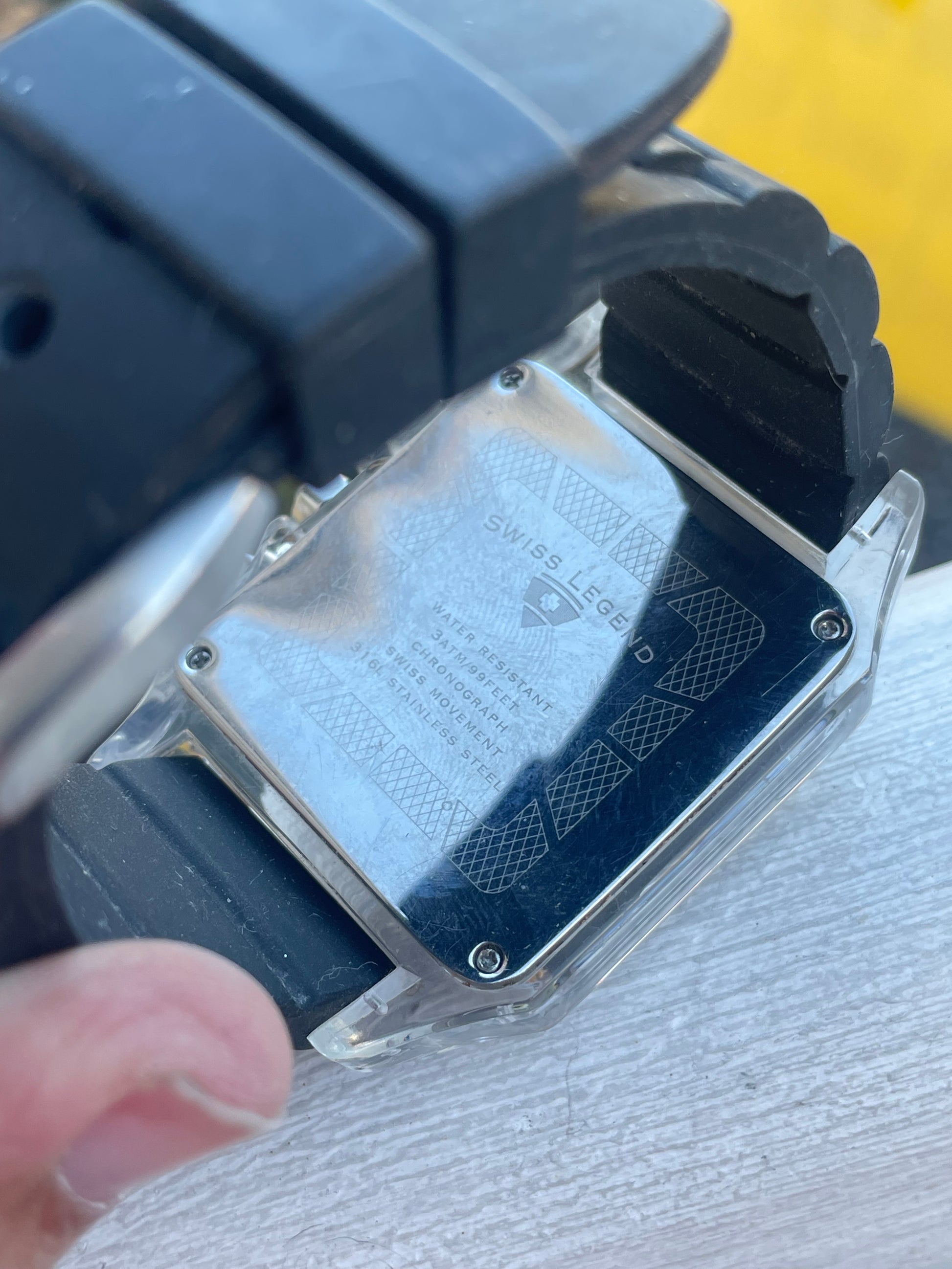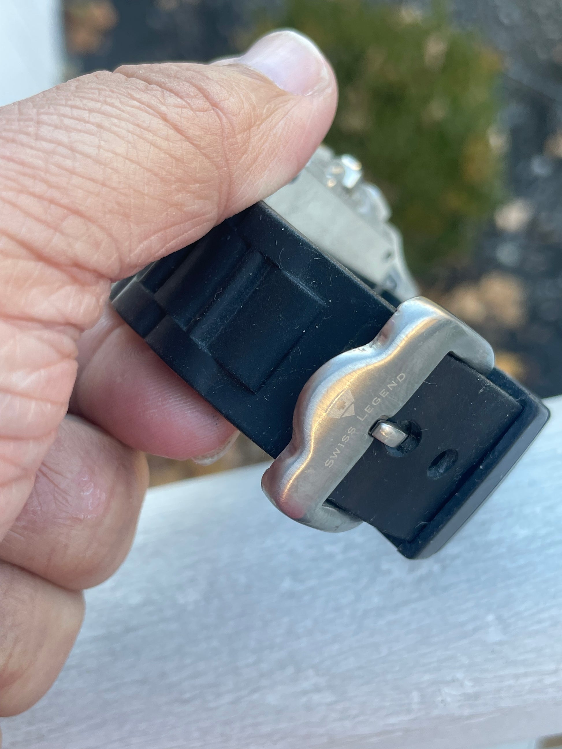 Men’s Swiss Legend Chronograph Watch. 45mm clear casing. 3atm 99 feet. Black rubber band. Preowned with minimal signs of wear.
