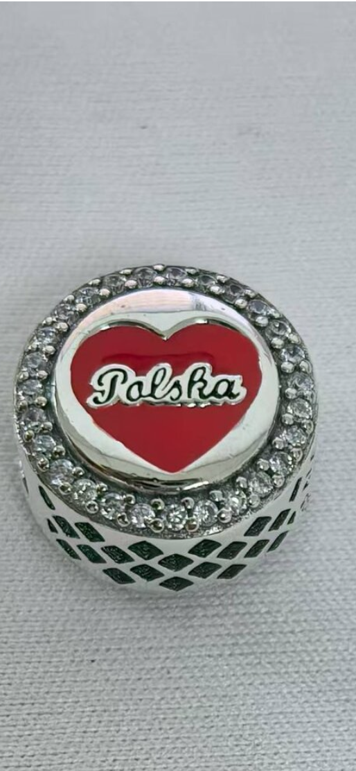 Front of the charm features the Poland flag. The reverse side says Polska in a heart.