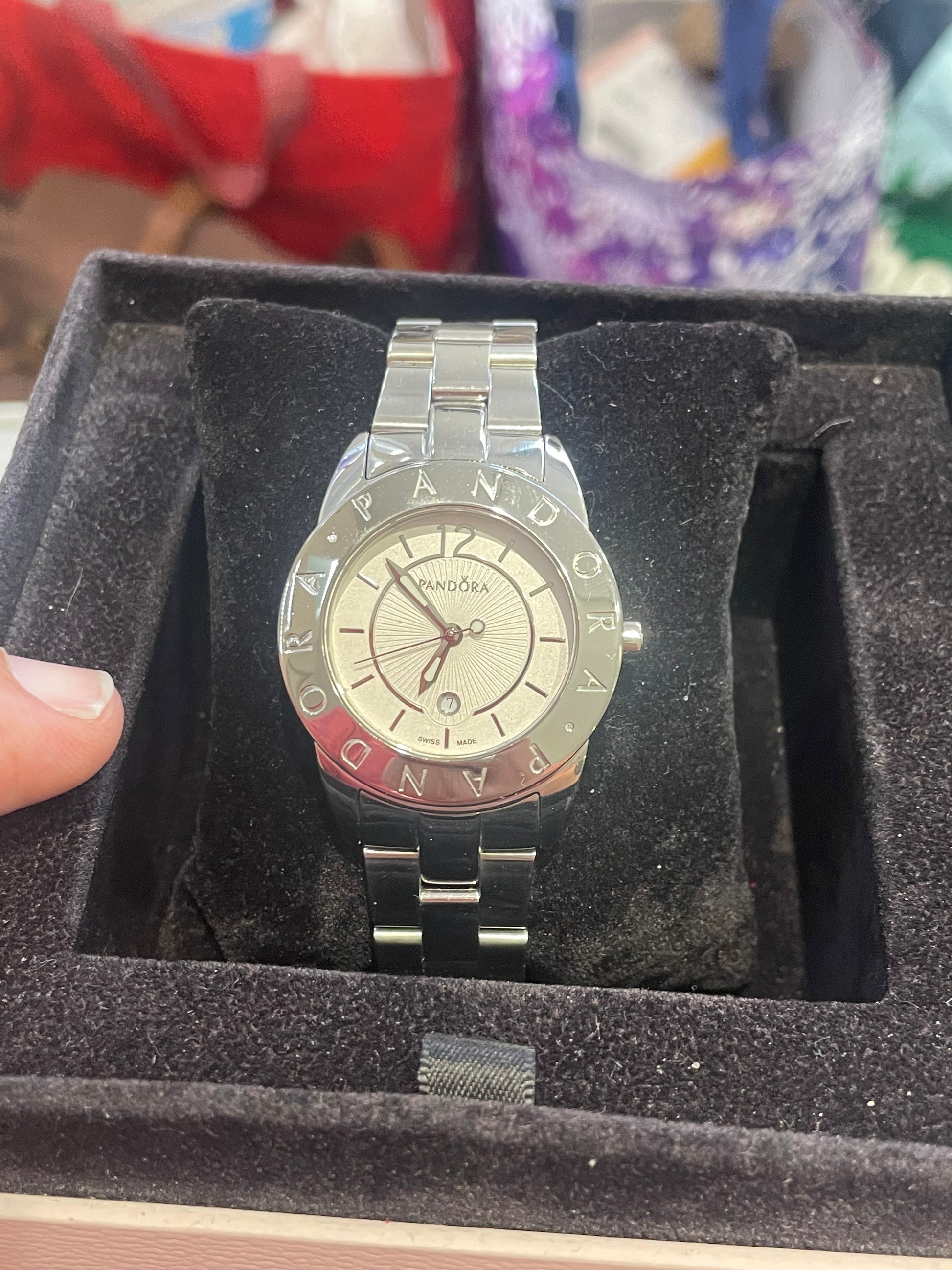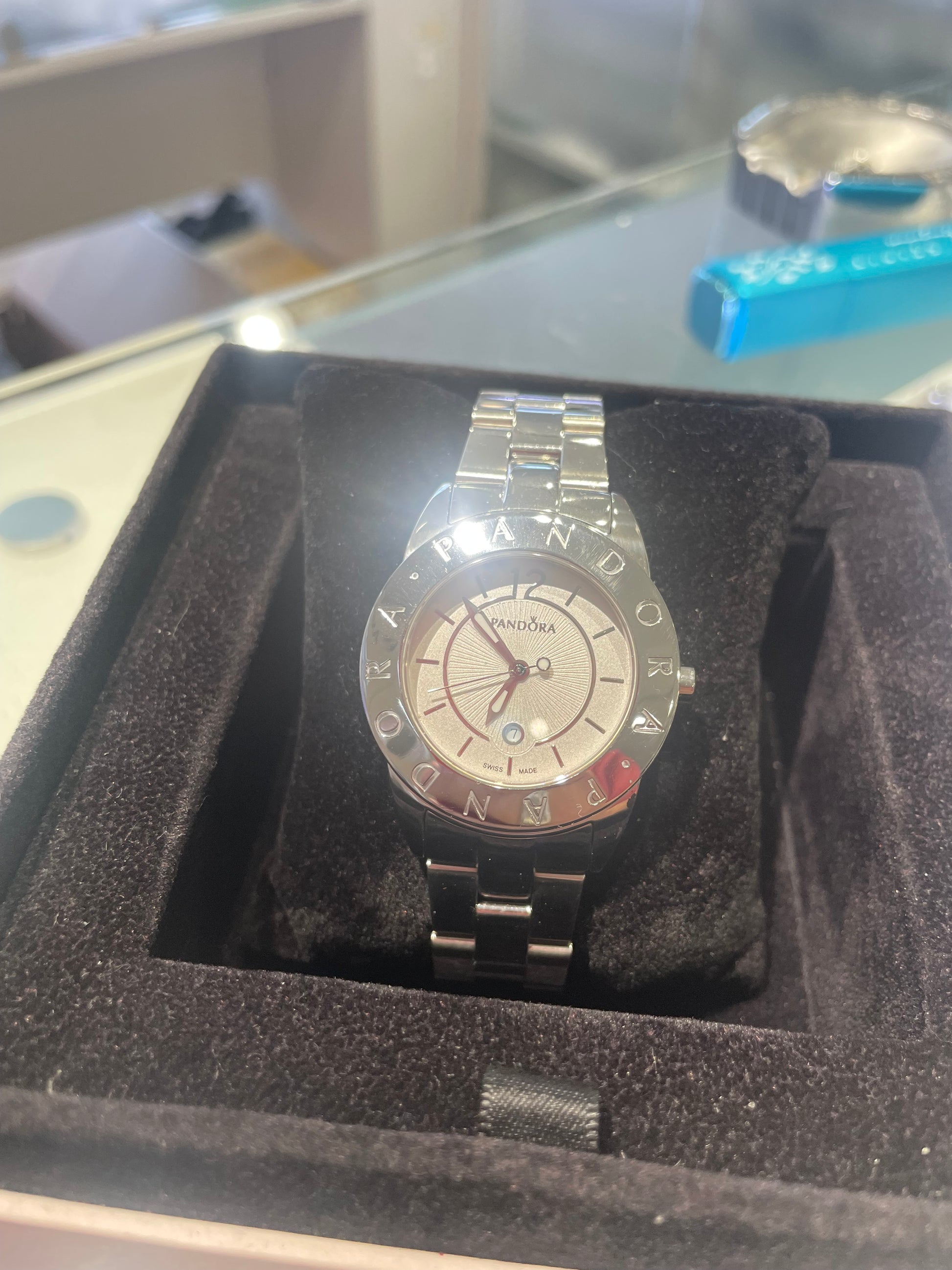 Retired Pandora Stainless Steel Imagine Watch w/ Extra Diamond Bezel and Extra Links. Up to an 8” wrist size. Preowned with minimal signs of wear. Comes with the pink pandora watch box also.