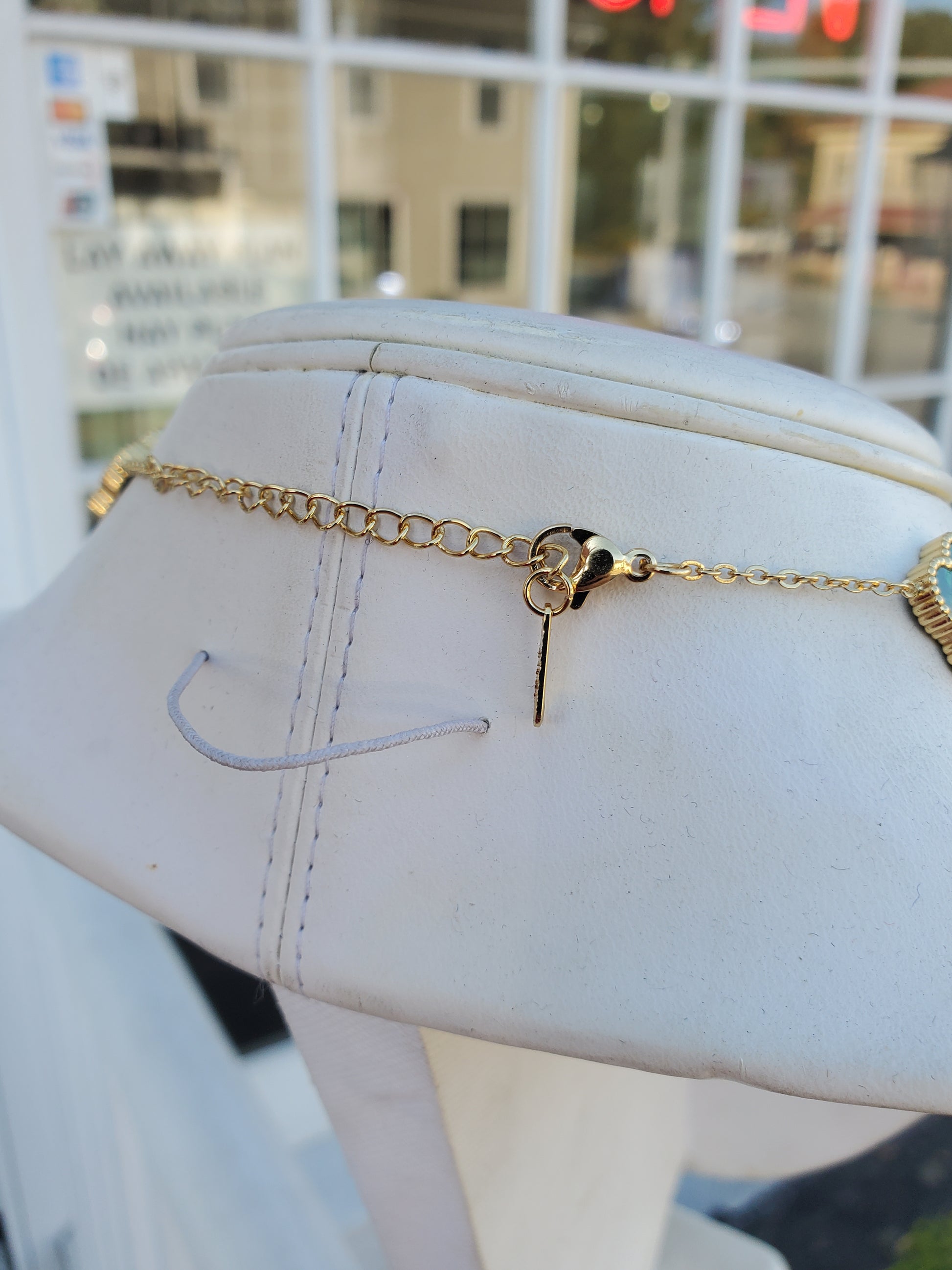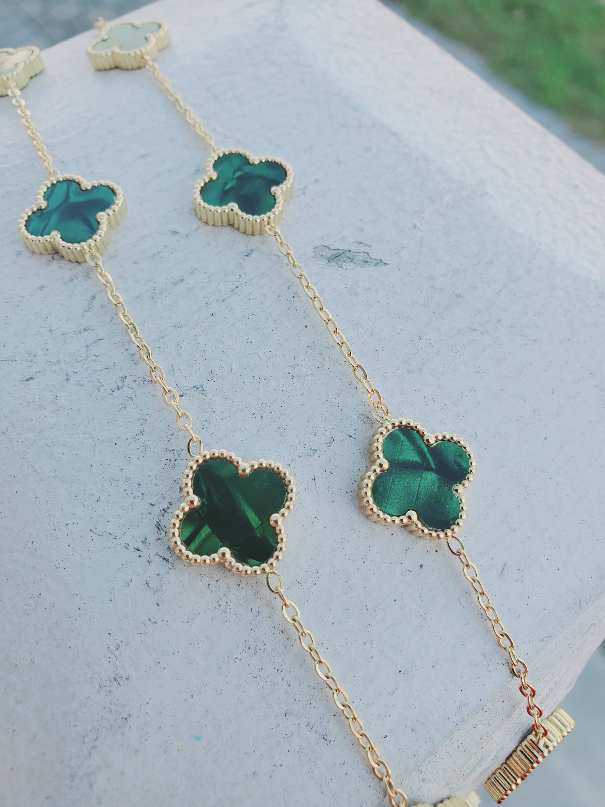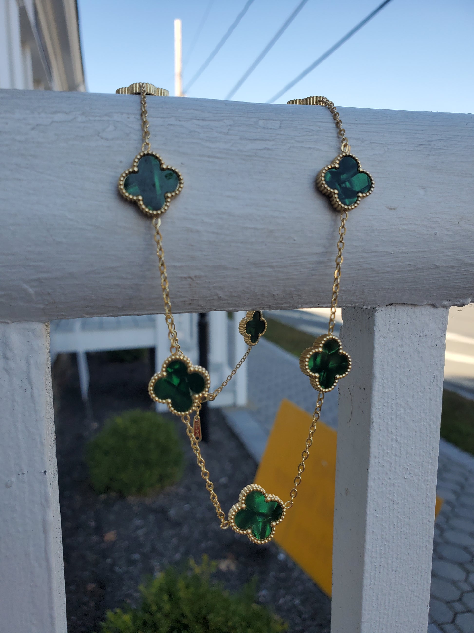 Stainless Steel Gold Color Green Clover Station Van Cleef Style Necklace 18”-20”. The clovers are a marble green shiny finish. There are 10 clovers in total on the necklace.