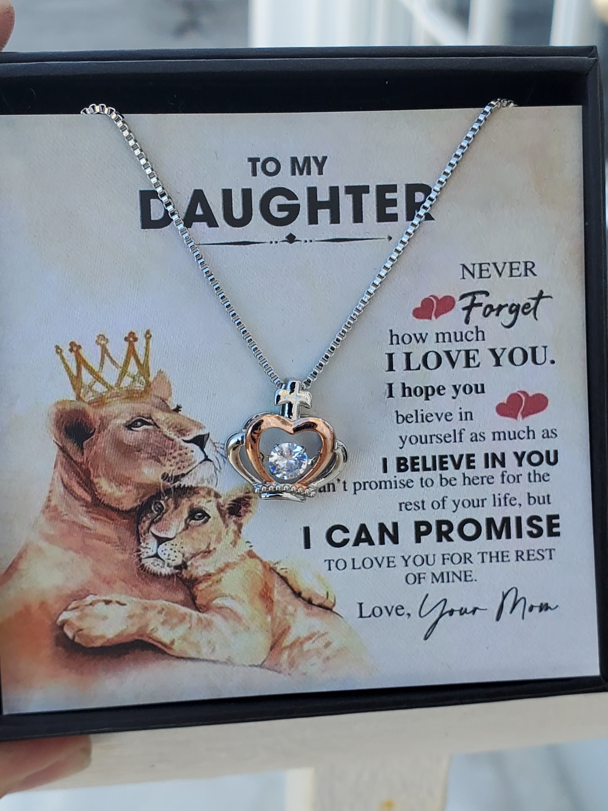 This beautiful Stainless Steel To My Daughter Crown Tiara Necklace is a heartfelt gift. Featuring a stunning floating zirconia CZ, it symbolizes your love and support. The adjustable box chain (17-19") ensures a perfect fit for any occasion, making it a cherished piece she'll adore.